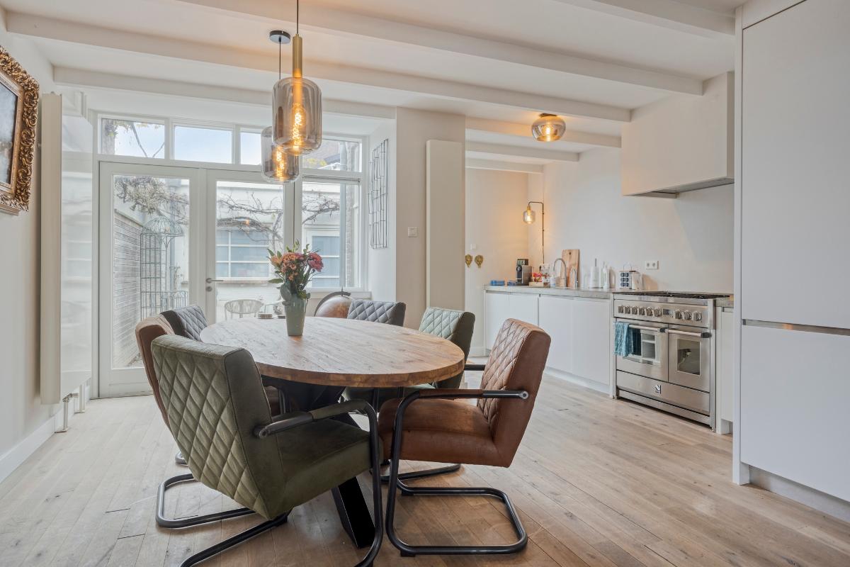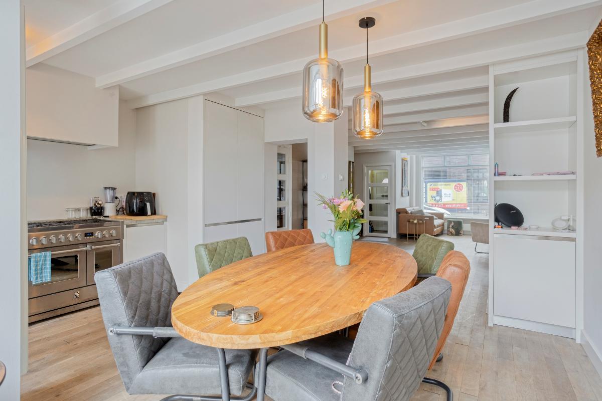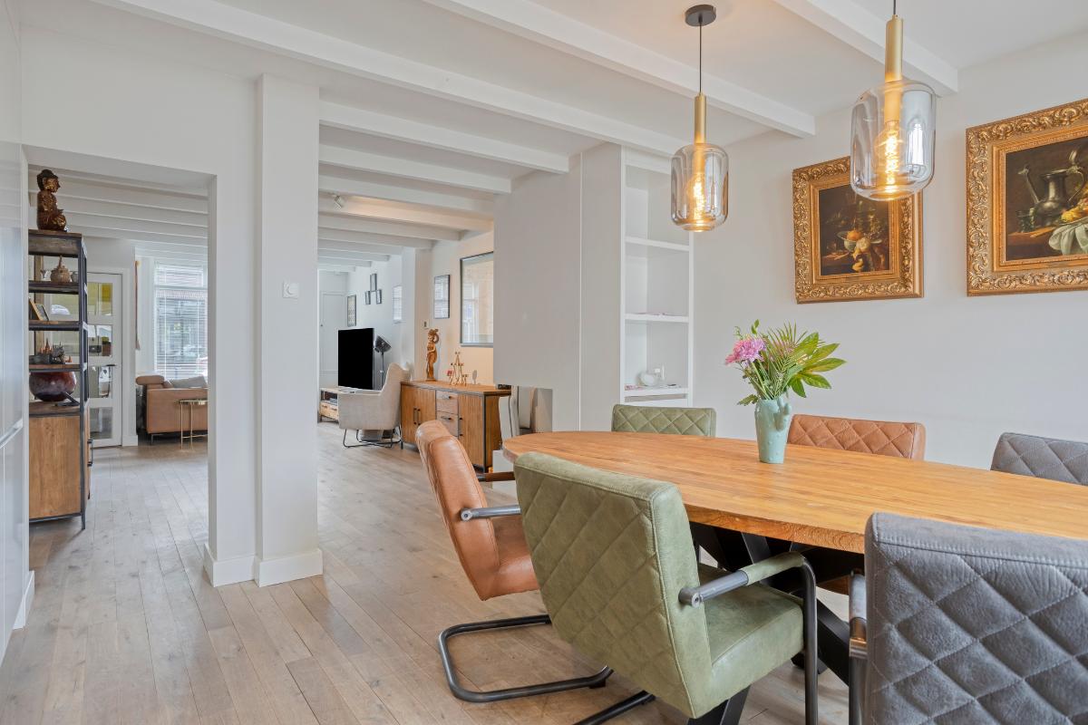 Aan de achterzijde is de woning uitgebouwd en hier bevindt zich de eetkamer en de half open keuken. De eetkamer is voorzien van een maatwerk kast en dubbele tuindeuren. De woonkamer en keuken zijn voorzien van een eiken parketvloer en glad stucwerk wanden en plafond.