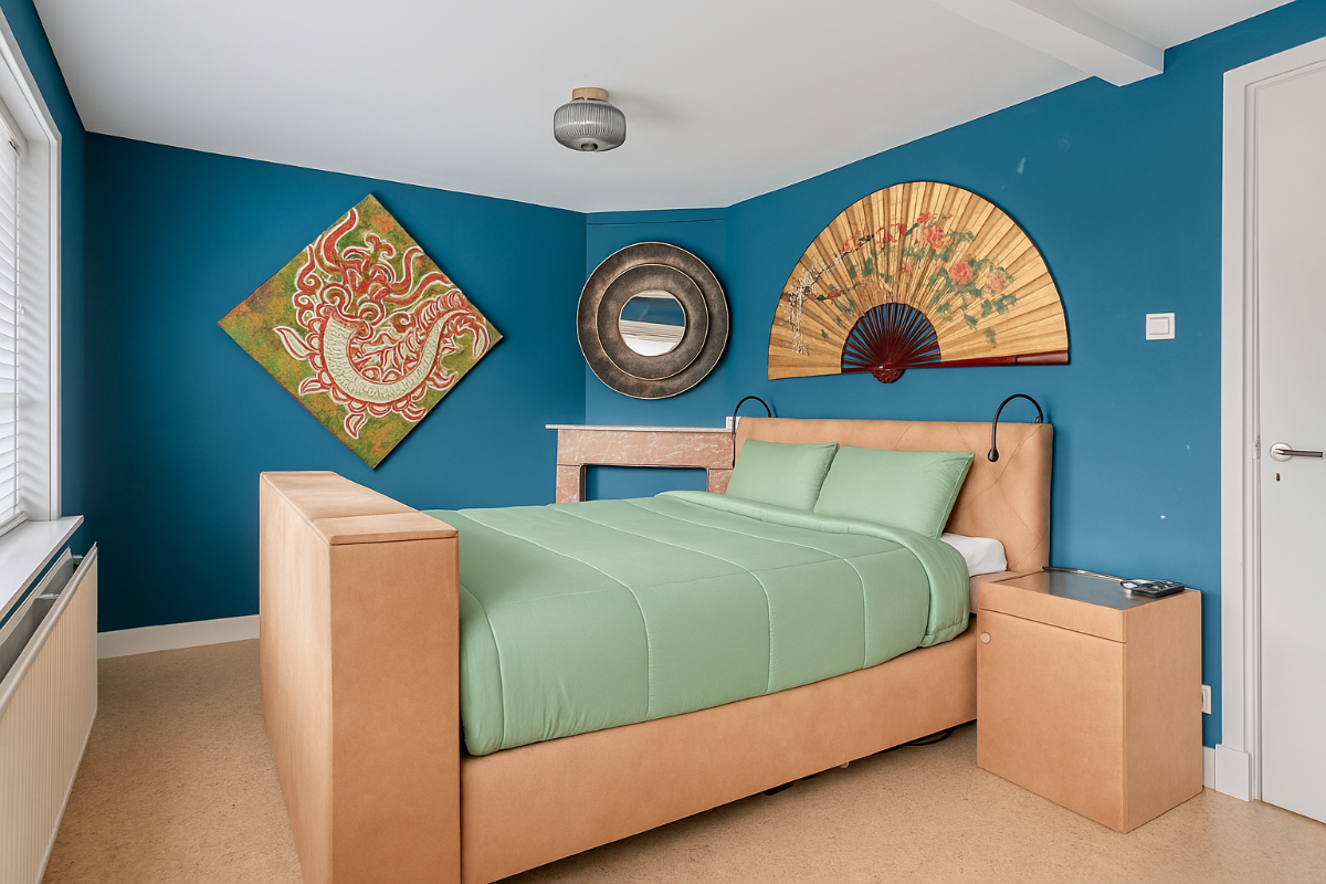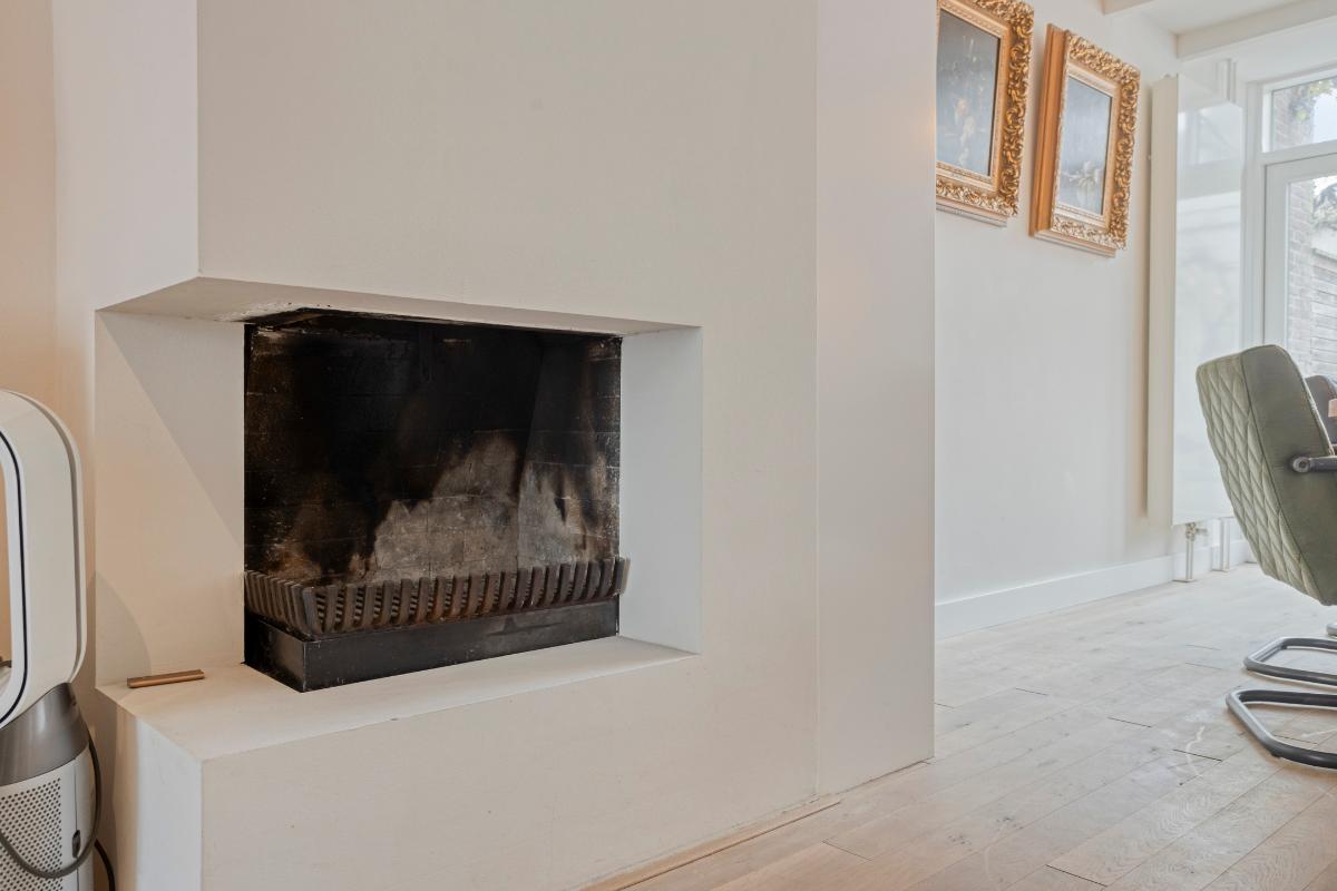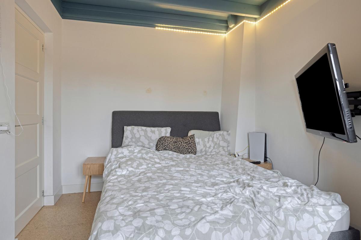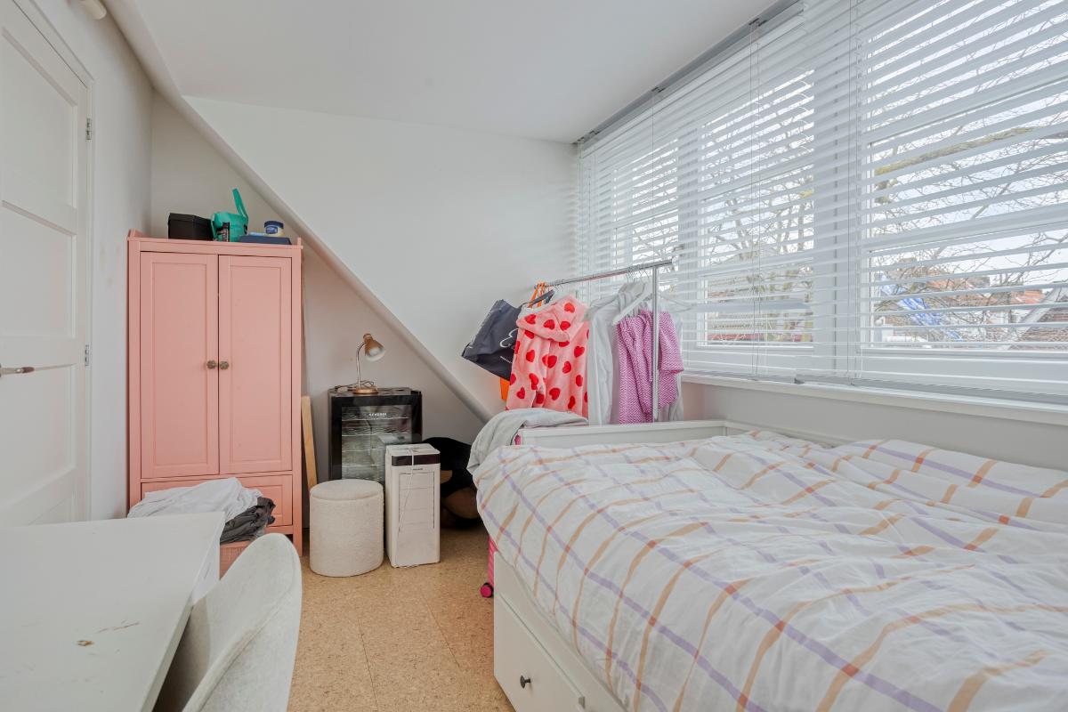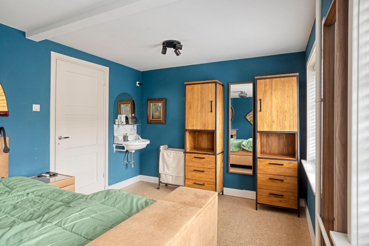 Slaapkamer 1 De hoofdslaapkamer ligt aan de voorzijde van de woning en is ruim van opzet. De slaapkamer beschikt over een authentieke wastafel met spiegel en de originele schouw. de vernieuwde ramen met draai kiep systemen en de vloer is afgewerkt met kurk welke naadloos doorloopt in de hal.