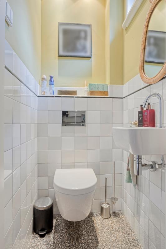 De toiletruimte is geheel vernieuwd in stijl van de woning, is halfhoog betegeld en voorzien van een wandcloset, fontein en raampje.