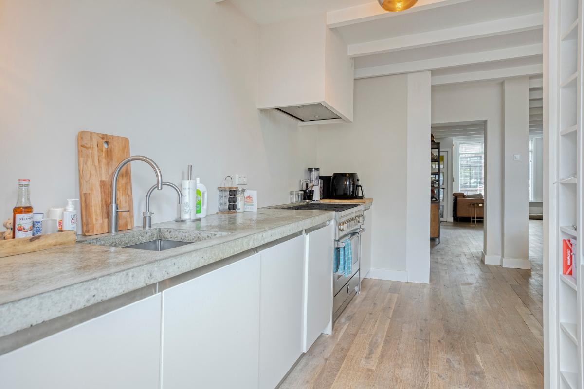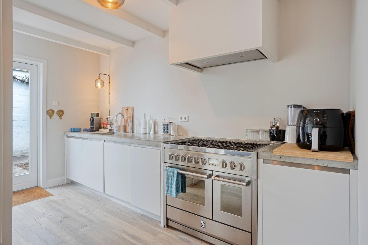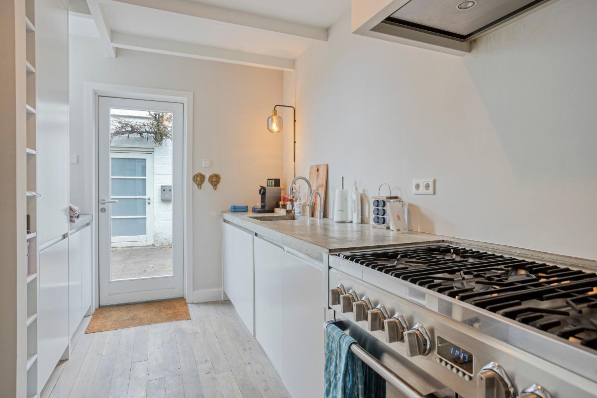 Keuken De luxe keuken is op maat gemaakt door Paul van de Kooi en kent een hoogwaardige afwerking. De keuken is voorzien van diverse apparatuur zoals een Quooker kraan, "Steel" 6-pits gasfornuis met dubbele oven en afzuigkap, vaatwasser en een koelkast en vriezer. Daarnaast zijn er diverse kastenwanden met ingebouwde, massief houten lades. Het fraaie werkblad is uitgevoerd in beton.