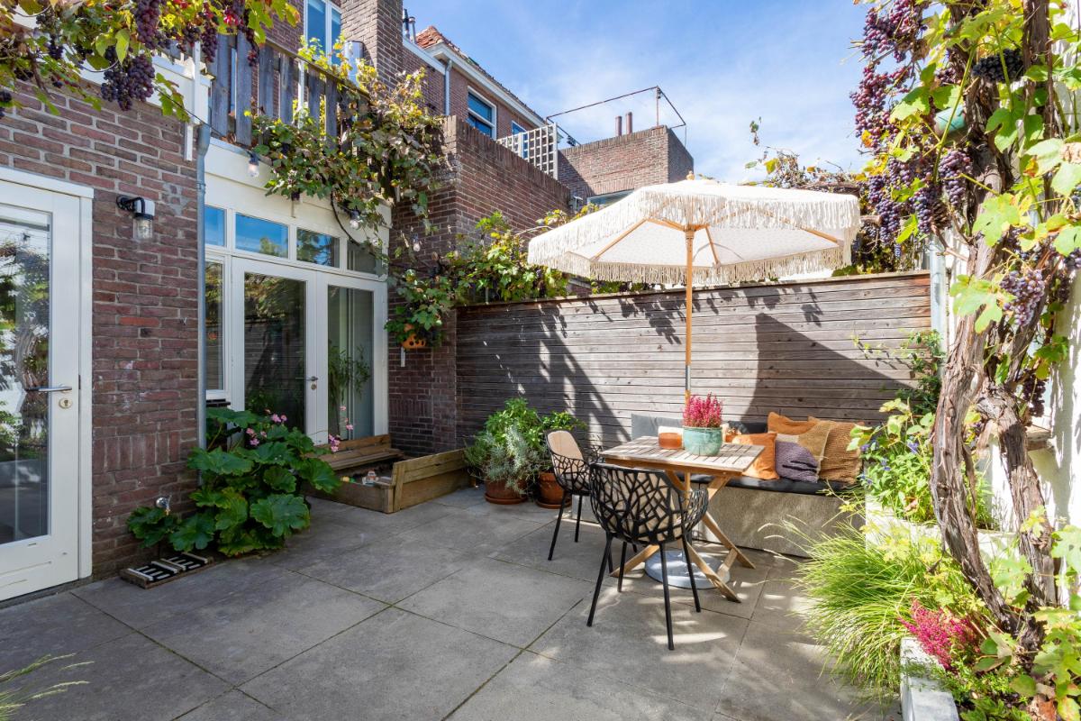 Tuin: De achtertuin is zeer sfeervol ingericht met zonneterras, plantenbakken, betonnen bank, tuinverlichting en een druivenstruik. De tuin is geheel omheind en voorzien van een achterom welke uitkomt in de gang aan de zijkant van de woning.