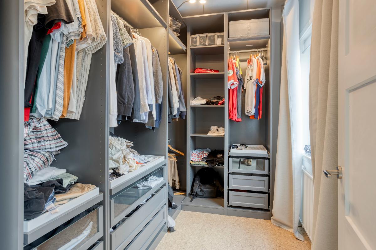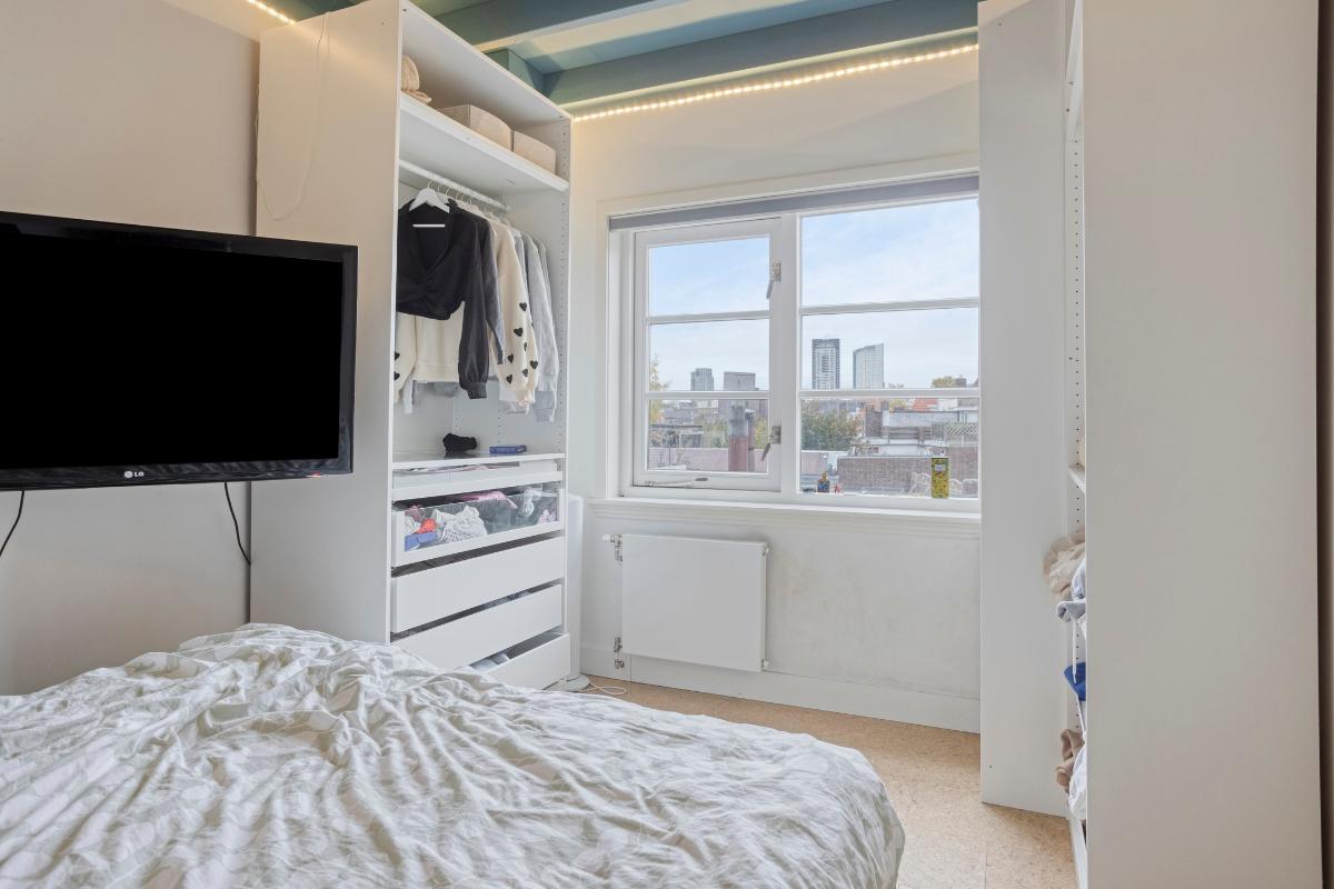 Slaapkamer 2 De kamer aan de achterzijde is momenteel in gebruik als kleedkamer maar kan ook prima dienen als kinderkamer. De afwerking is gelijk aan de kamer aan de voorzijde.