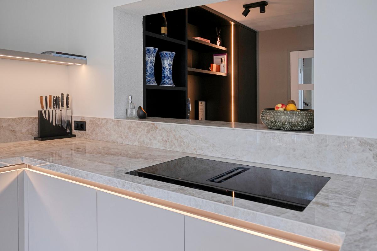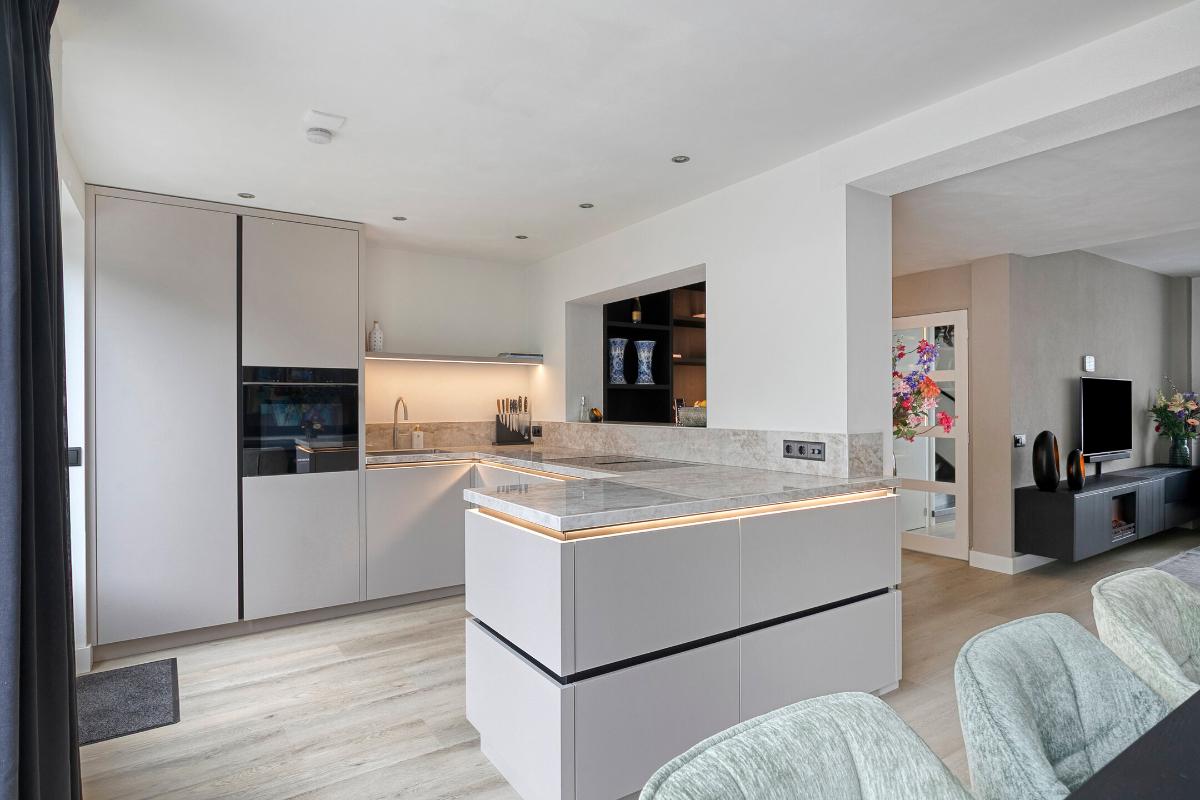 Keuken (2025, maatwerk Studio van Gennip) De keuken is volledig uitgerust met moderne apparatuur van Siemens (Studioline): vaatwasser, grote koelkast, grote vrieskast, inductie kookplaat met downdraft afzuiging, combimagnetron, Dekton (untracompact materiaal wat gemaakt is van glas, porselein en kwarts en is extreem sterk) aanrechtblad met daaronder led verlichting en een rvs spoelbak met Quoocker kraan met met (gekoelde) bruiswater functie. Deze zeer luxe keuken is de blikvanger van de woning en met het uitzicht op de tuin maakt koken hier extra plezierig.