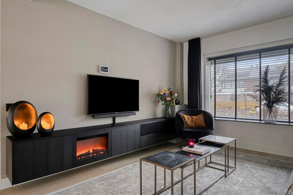 De woonkamer is het hart van het huis: een ruime, lichte leefruimte met een volledig vernieuwde erker die zorgt voor extra lichtinval en een prachtig uitzicht op de tuin. De erker is voorzien van een elektrisch bedienbare zonnescreen, die het hele jaar door voor een aangename temperatuur en privacy zorgt. De ruimte is verder uitgerust met airconditioning, een pvc-vloer met vloerverwarming (via de cv-ketel) en strakke stucwerk wanden en plafond. De open verbinding met de keuken creëert een sociale en gezellige sfeer. Tussen de keuken en de woonkamer bevindt zich een op maat gemaakte kastenwand met een wijnklimaatkast (maatwerk Studio van Gennip). Door middel van een schuifpui kunt u de tuin bereiken.