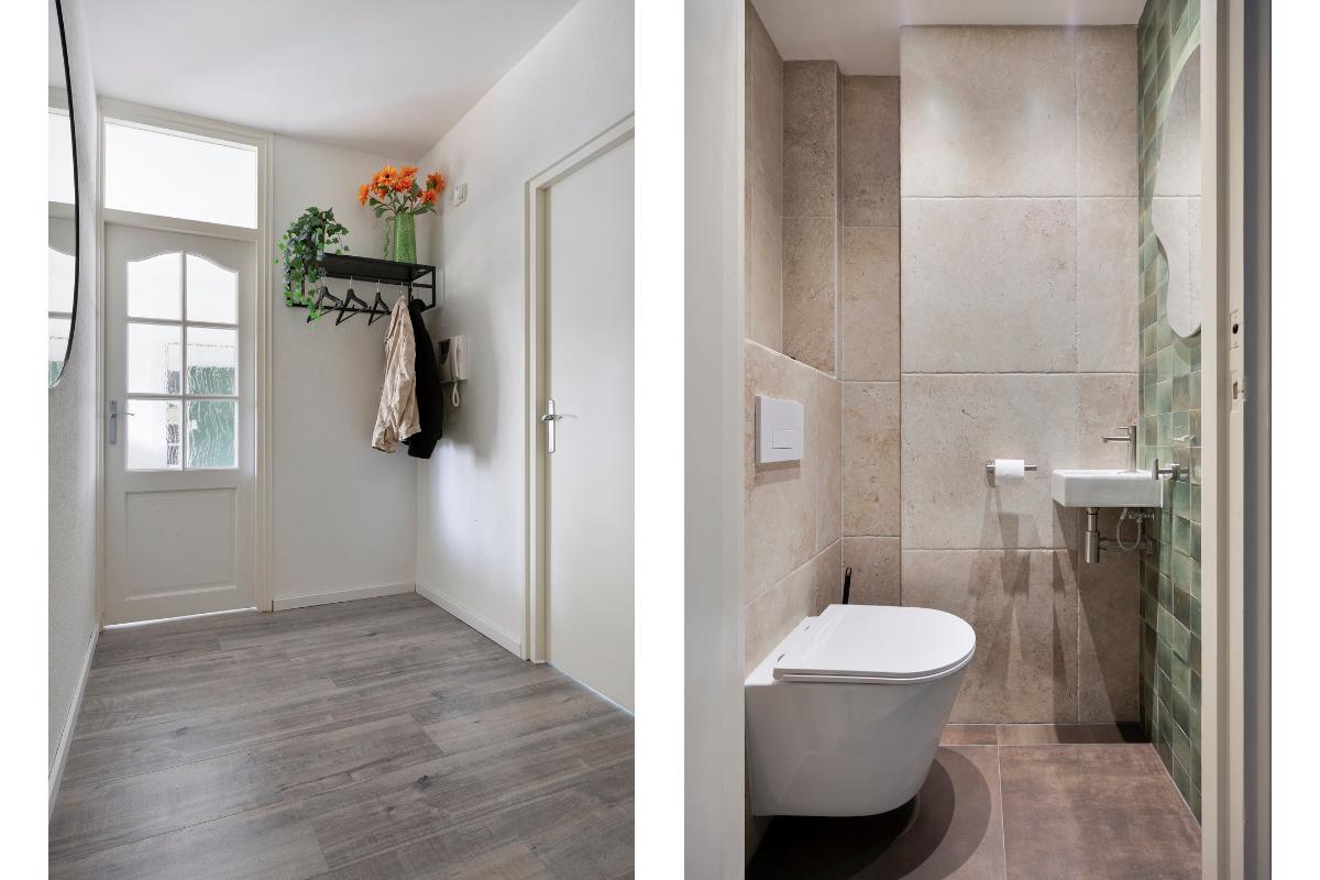 Entree / Hal Bij binnenkomst valt direct de frisse, lichte uitstraling van de hal op. De ruimte is afgewerkt met een moderne vloer die mooi doorloopt richting de overige vertrekken, wat zorgt voor een rustige en verzorgde uitstraling. De wanden zijn netjes en er is voldoende plaats voor een garderobe. Vanuit de hal zijn de woonkamer, slaapkamers en toiletruimte bereikbaar. Ook bevindt zich hier een praktische vaste kast voor extra opbergruimte. De glasdeur richting de woonkamer zorgt voor prettige lichtinval en een uitnodigende doorkijk naar het leefgedeelte. Toiletruimte De toiletruimte is in 2024 volledig vernieuwd en uitgevoerd in een moderne, luxe stijl. De combinatie van grote neutrale wandtegels en de groengetinte accenttegels geeft de ruimte een warme en eigentijdse uitstraling. Het toilet is voorzien van een wandcloset en een strak vormgegeven fontein.