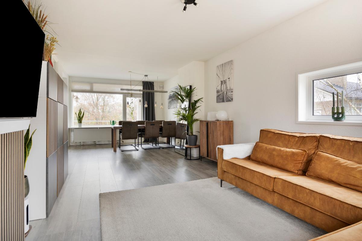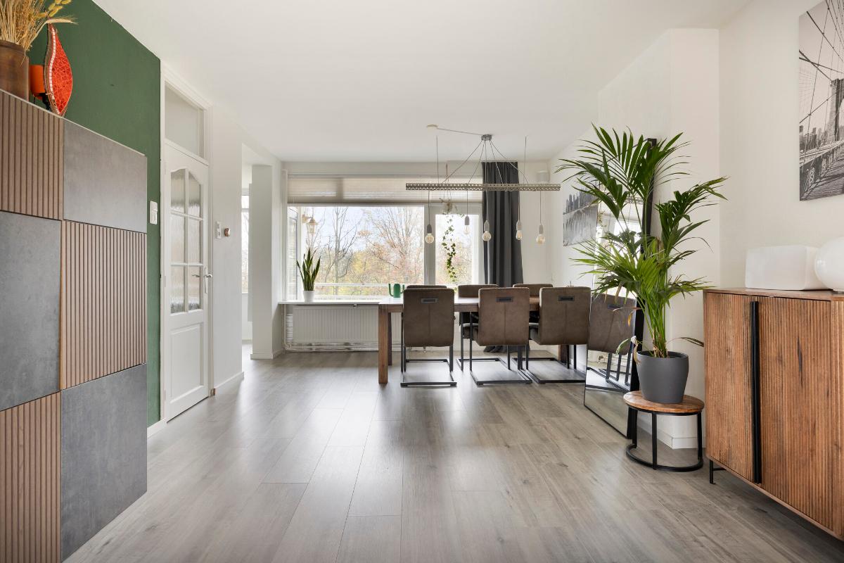 Woonkamer De royale woonkamer strekt zich uit over de volledige lengte van het appartement en is ingedeeld in een sfeervolle zithoek aan de voorzijde en een ruime eethoek aan de achterzijde. Dankzij de grote raampartijen aan beide kanten geniet de woonkamer de hele dag door van een prachtige lichtinval. Aan de voorzijde kijk je vrij uit over het groene grasveld met bomen. De zithoek biedt alle ruimte voor een grote bank en overige meubels. De strak afgewerkte wanden in combinatie met de neutrale laminaatvloer zorgen voor een rustige en moderne basis, terwijl de houten wandpanelen warmte en extra sfeer toevoegen.