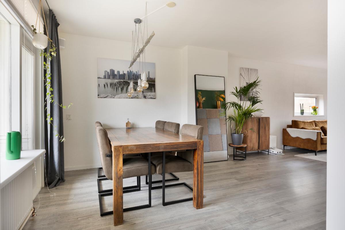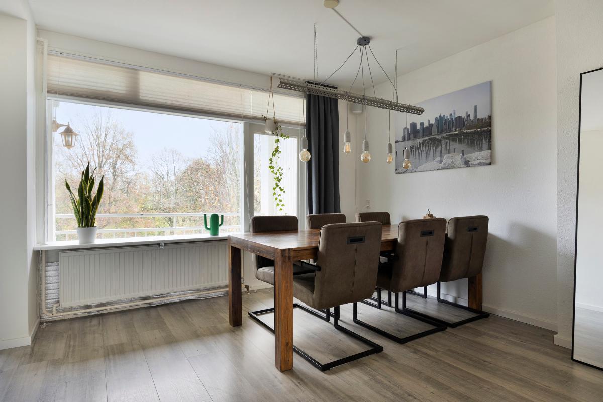 Aan de achterzijde bevindt zich de eethoek, met voldoende plek voor een royale eettafel. Door het grote raam én de deur naar het balkon heb je hier een direct zicht op het groen.