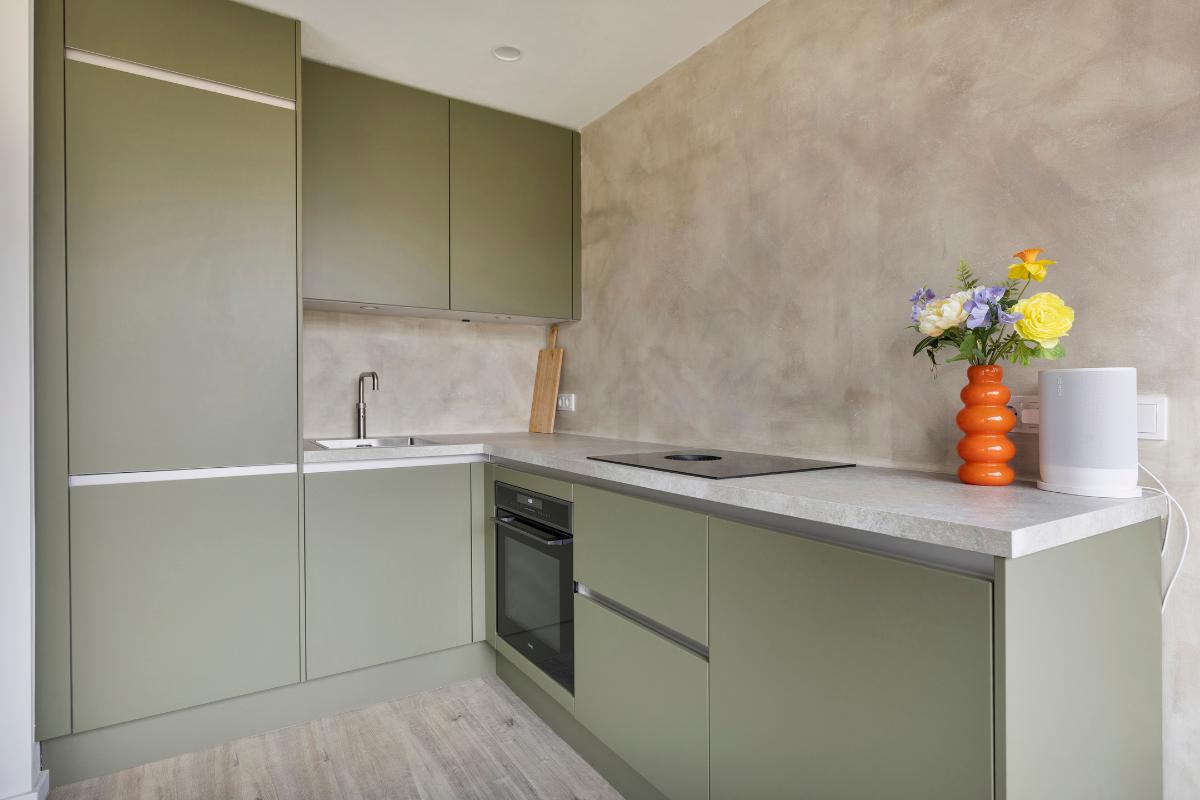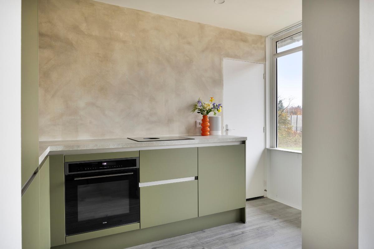 Keuken De halfopen keuken is zeer recent volledig vernieuwd en vormt een echte eyecatcher in het appartement. De moderne matte fronten in een stijlvolle groentint combineren prachtig met het lichte werkblad en de strakke betonlook achterwand, waardoor de keuken een rustige maar luxe uitstraling heeft.