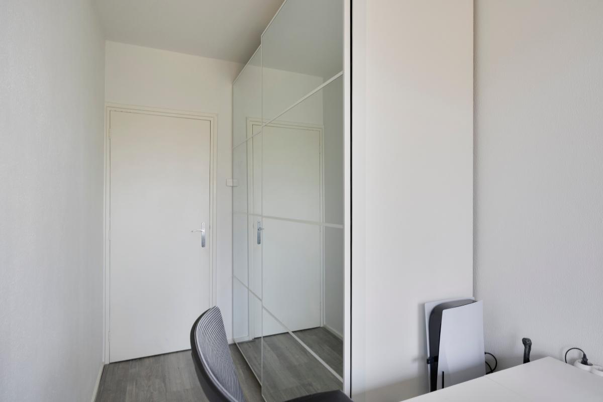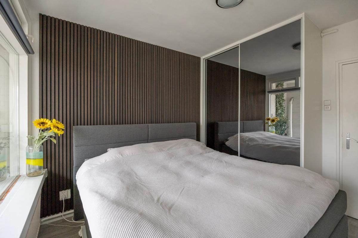 De kamer is keurig afgewerkt met dezelfde laminaatvloer en een nette wandafwerking. De wand achter het bed is voorzien van stijlvolle, verticale houten wandpanelen die de ruimte een luxe uitstraling en warme sfeer geven. Een grote schuifkast met spiegeldeuren biedt volop bergruimte voor kleding en linnengoed, terwijl de kamer zelf voldoende ruimte biedt voor een groot tweepersoonsbed.