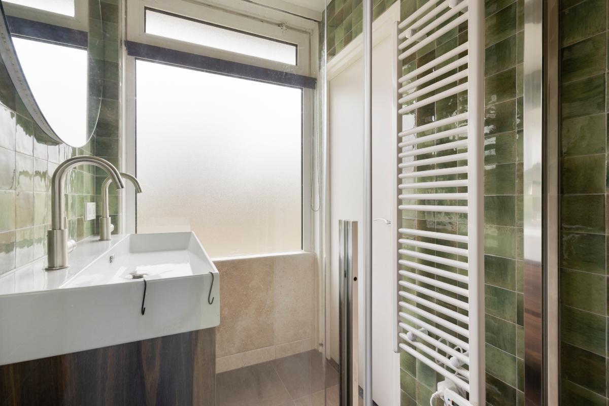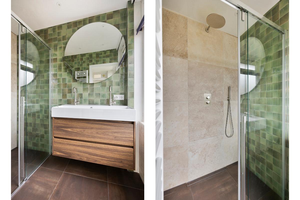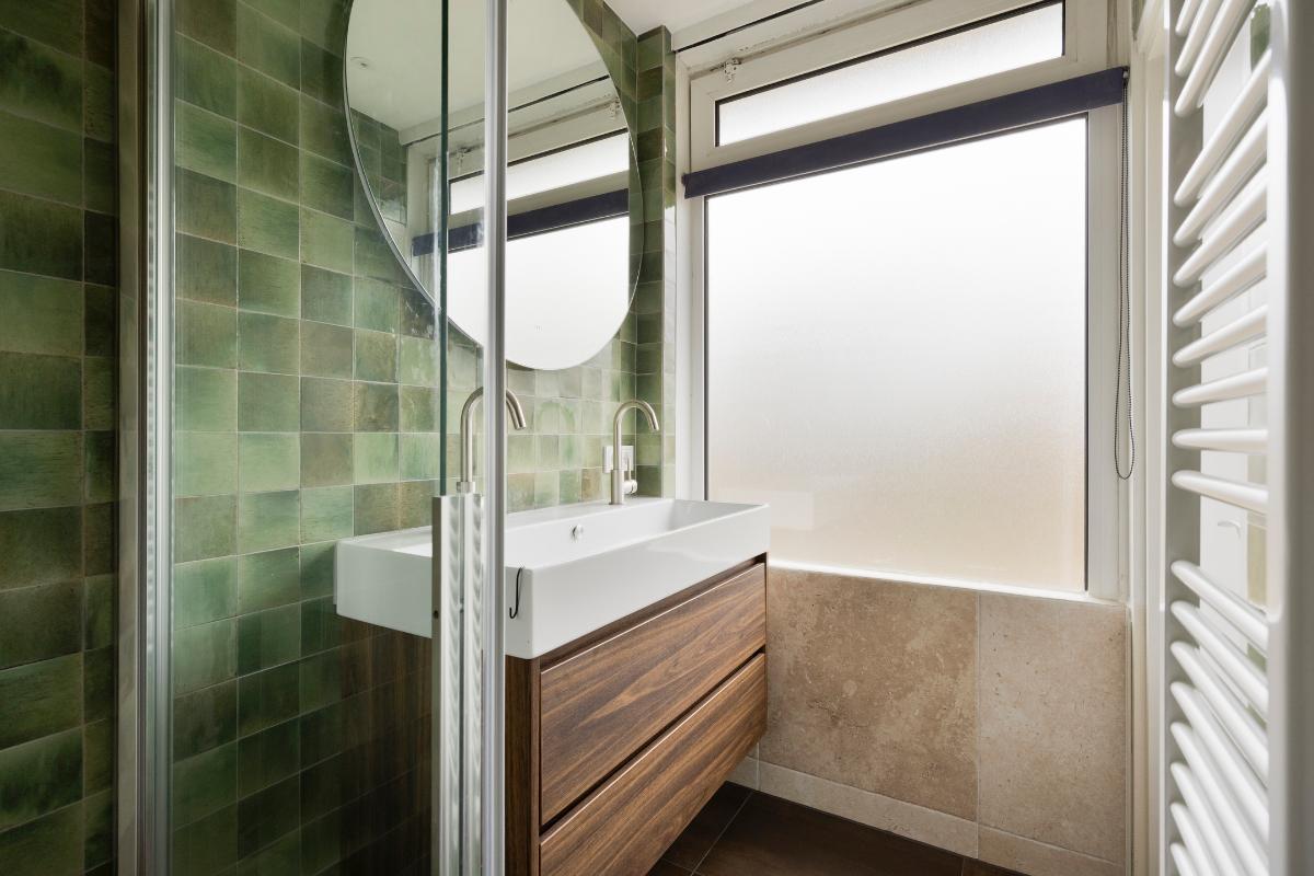 Badkamer De badkamer is stijlvol en luxe: de moderne groene wandtegels gecombineerd neutrale tinten en hoogwaardige materialen. De ruimte is uitgerust met een ruime inloopdouche met regendouche (inbouw) en een glazen schuifdeur, waardoor de badkamer open en licht aanvoelt. De grote wastafel met dubbel kraanwerk staat op een fraai houten badkamermeubel met veel bergruimte.