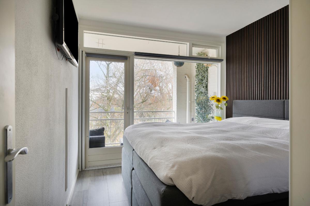 Slaapkamer 1 De hoofdslaapkamer van ca. 10m² is een lichte en sfeervolle ruimte met ook hier een heerlijk uitzicht. Dankzij de grote raampartij en de deur naar het balkon geniet je hier van veel daglicht.