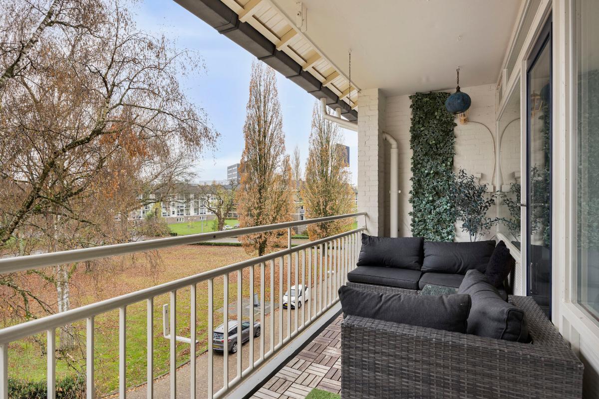 Balkon (voorzijde) Aan de voorzijde van het appartement bevindt zich een heerlijk, overdekt balkon dat bereikbaar is vanuit het zitgedeelte van de woonkamer en de slaapkamer. Dankzij de ligging op de verdiepingshoogte geniet je hier van een vrij uitzicht over het groene plantsoen en de volwassen bomen in de wijk. De houten terrastegels geven het balkon een warme uitstraling. Het balkon biedt voldoende ruimte voor een comfortabele loungeset, waardoor je hier makkelijk een fijne buitenplek creëert voor een kop koffie in de ochtend of een ontspannen moment aan het einde van de dag.