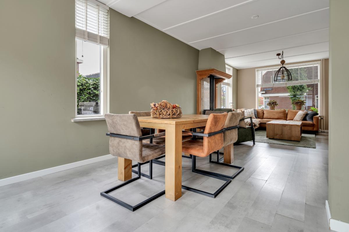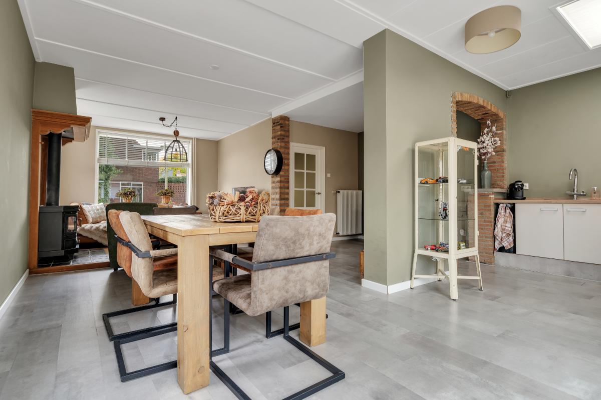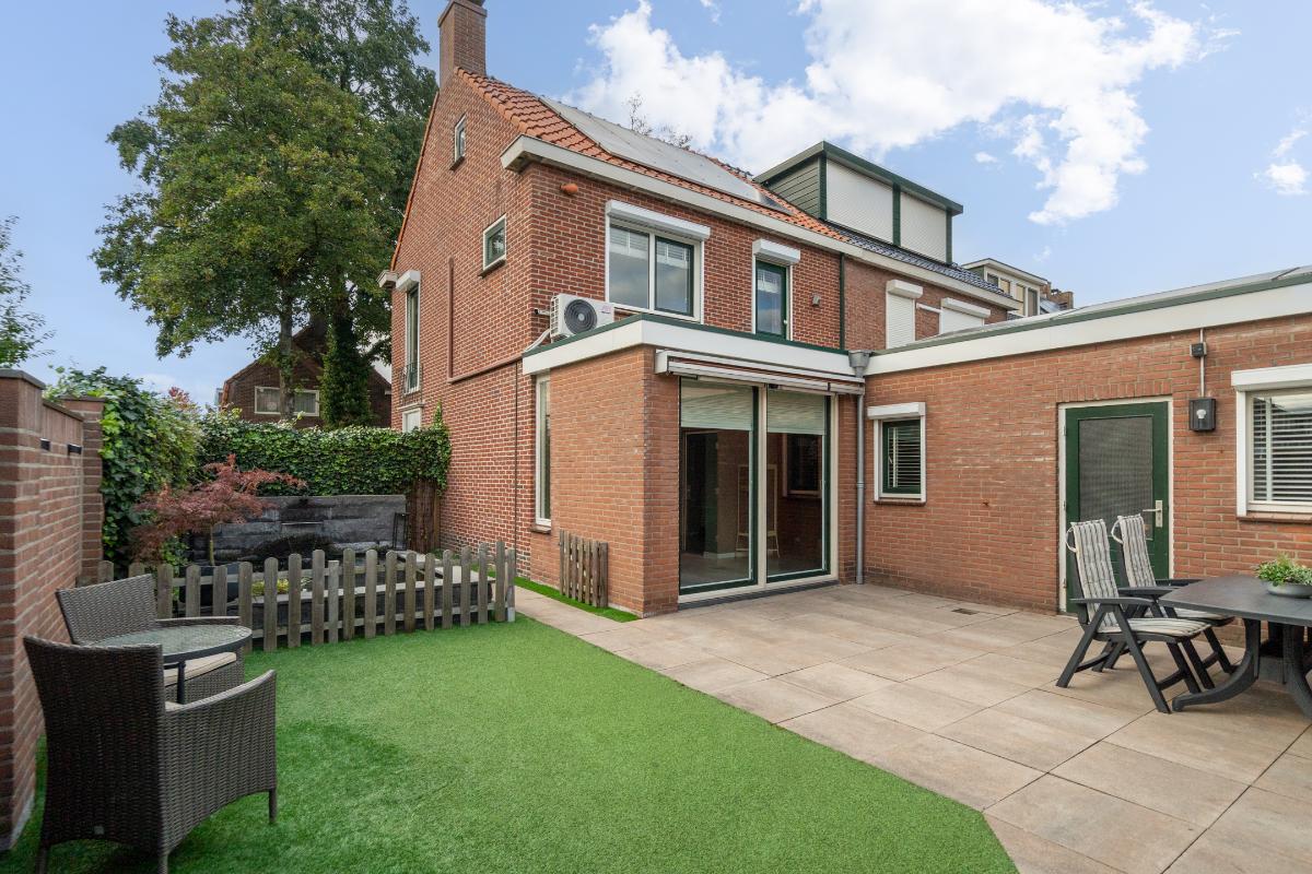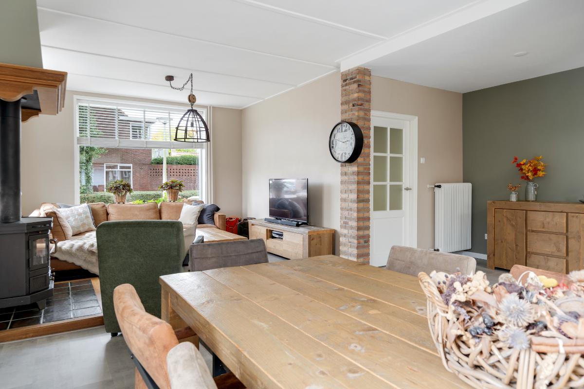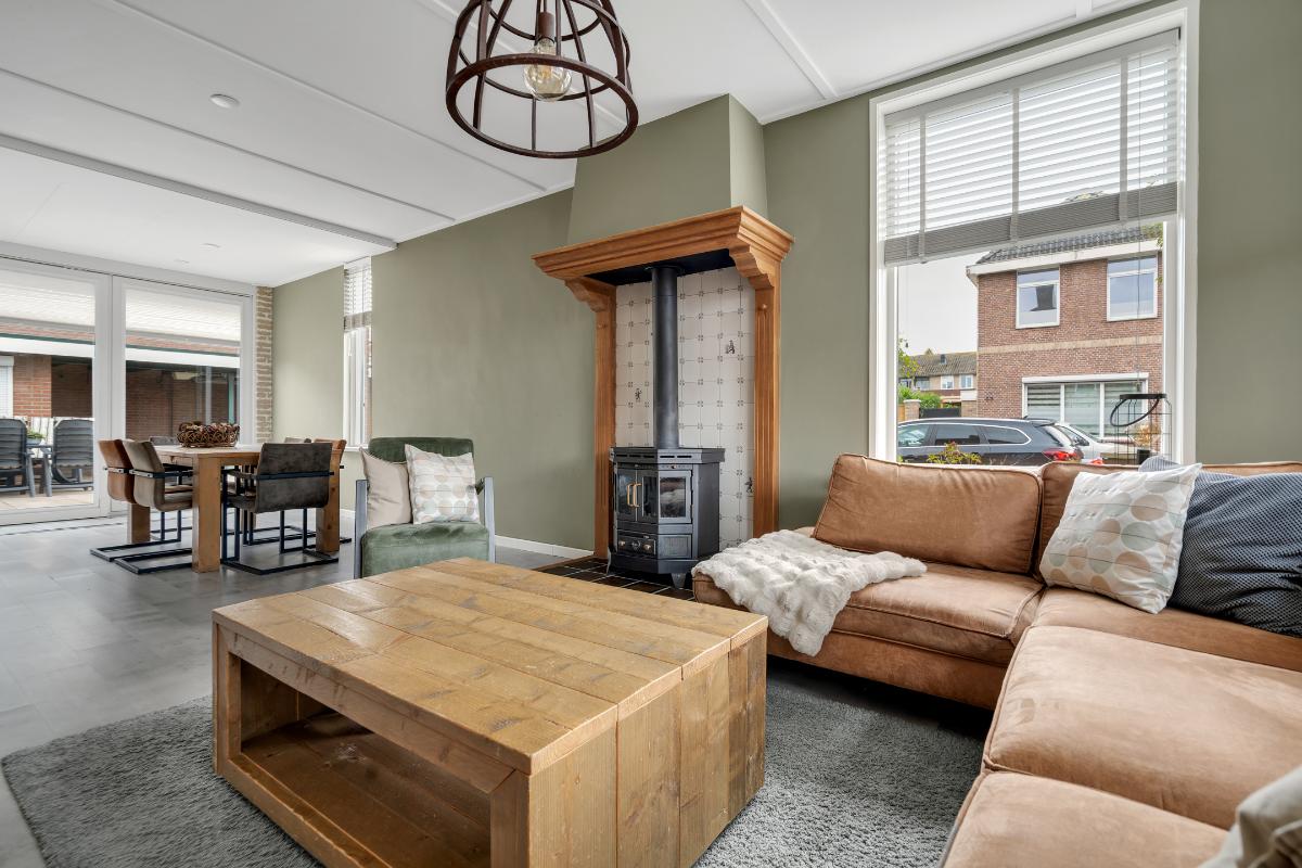 Begane grond: De begane grond van deze karakteristieke hoekwoning voelt direct warm en uitnodigend aan. Via de entree met toilet en trapkast stap je de ruime woonkamer binnen, waar authentieke details en hedendaags comfort elkaar perfect versterken. De fraaie houtkachel met klassieke schouw vormt het hart van de ruimte en zorgt voor een gezellige sfeer. Dankzij de uitbouw aan de achterzijde is er een royale living ontstaan, met voldoende plaats voor een eethoek die in directe verbinding staat met de moderne keuken. De keuken combineert strakke, lichte fronten met een warm houten werkblad en subtiele Portugese tegels op een deel van de achterwand. De keuken is voorzien van onder meer een ingebouwde oven, keramische kookplaat, afzuigkap en koelkast. Vanuit de keuken loop je door naar de praktische bijkeuken, waar extra bergruimte en de aansluitingen voor de wasmachine en droger zijn gerealiseerd. Een waterontharder zorgt voor lekker zacht water. Achter de schuifdeur bevindt zich de inpandige berging, ideaal voor fietsen of te gebruiken als hobbyruimte of thuiskantoor. De openslaande deuren vanuit de berging naar de overkapping en patio zorgen voor een natuurlijke overgang tussen binnen en buiten. Verder is vanuit de eetkamer de tuin te bereiken via de grote schuifpui.