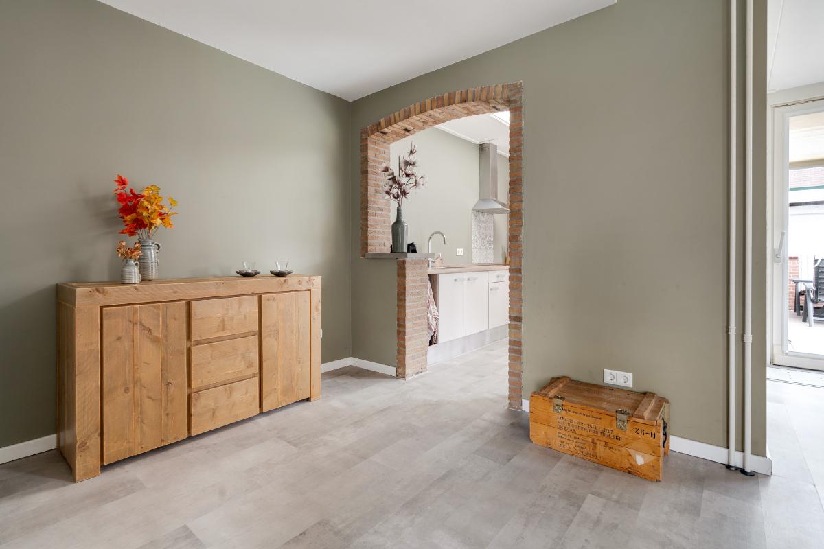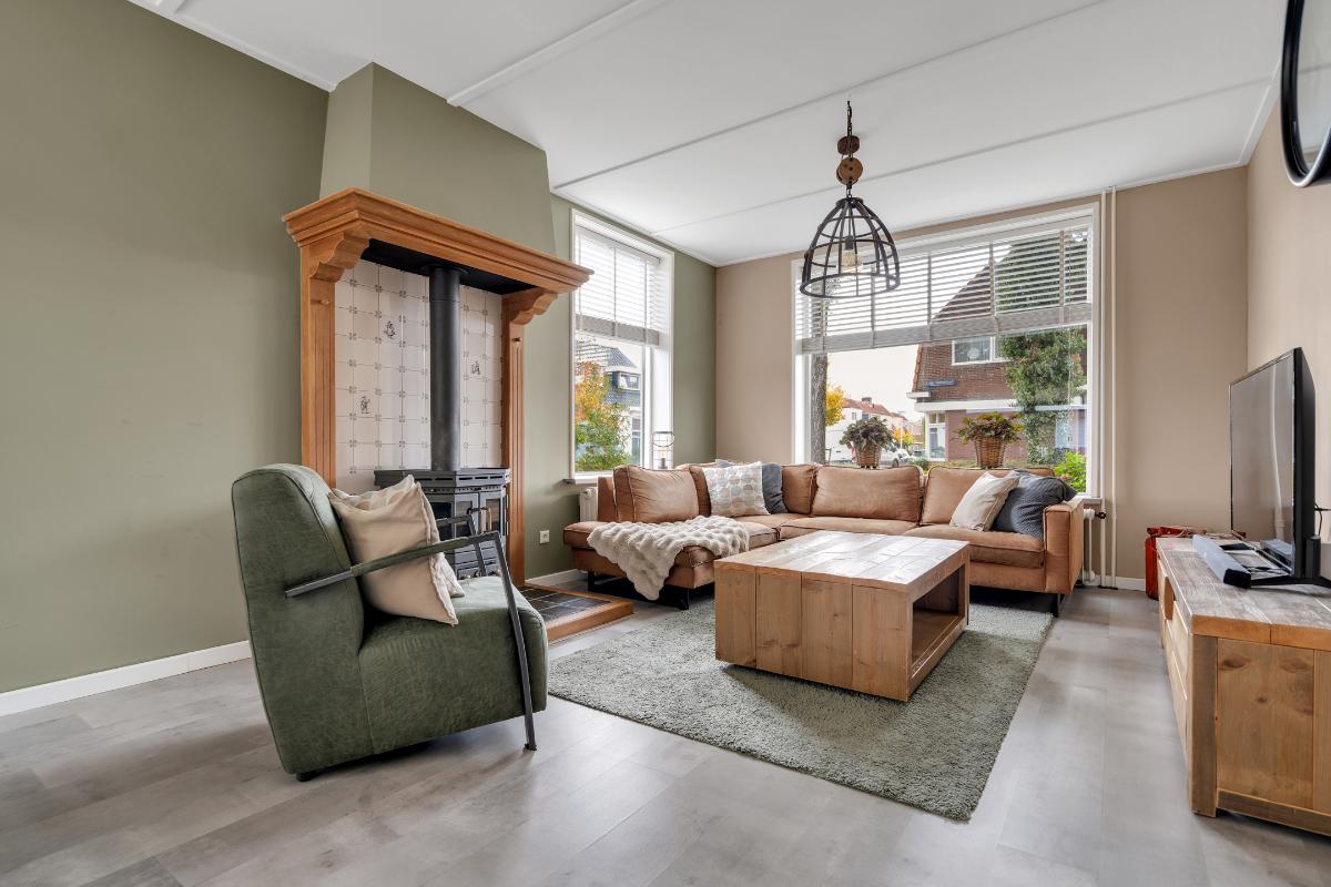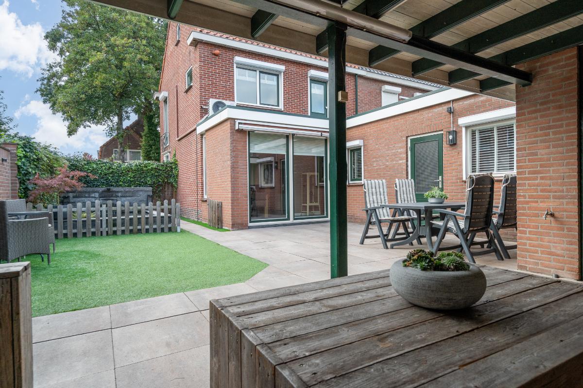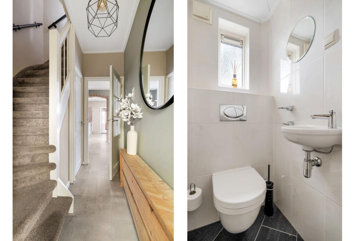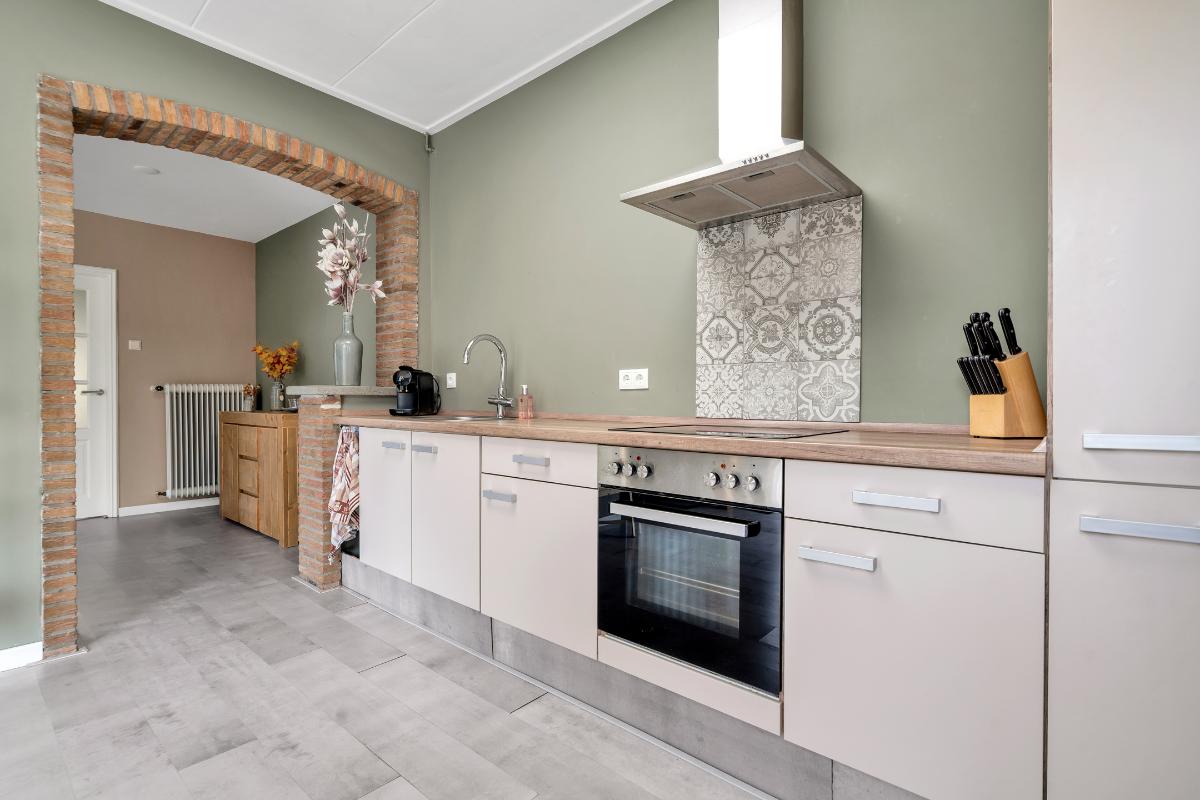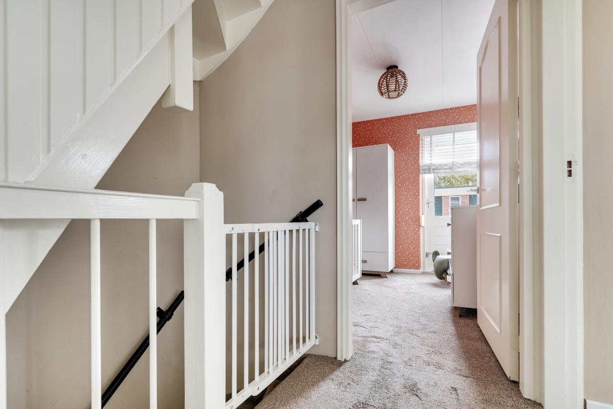 Begane grond: De begane grond van deze karakteristieke hoekwoning voelt direct warm en uitnodigend aan. Via de entree met toilet en trapkast stap je de ruime woonkamer binnen, waar authentieke details en hedendaags comfort elkaar perfect versterken. De fraaie houtkachel met klassieke schouw vormt het hart van de ruimte en zorgt voor een gezellige sfeer. Dankzij de uitbouw aan de achterzijde is er een royale living ontstaan, met voldoende plaats voor een eethoek die in directe verbinding staat met de moderne keuken. De keuken combineert strakke, lichte fronten met een warm houten werkblad en subtiele Portugese tegels op een deel van de achterwand. De keuken is voorzien van onder meer een ingebouwde oven, keramische kookplaat, afzuigkap en koelkast. Vanuit de keuken loop je door naar de praktische bijkeuken, waar extra bergruimte en de aansluitingen voor de wasmachine en droger zijn gerealiseerd. Een waterontharder zorgt voor lekker zacht water. Achter de schuifdeur bevindt zich de inpandige berging, ideaal voor fietsen of te gebruiken als hobbyruimte of thuiskantoor. De openslaande deuren vanuit de berging naar de overkapping en patio zorgen voor een natuurlijke overgang tussen binnen en buiten. Verder is vanuit de eetkamer de tuin te bereiken via de grote schuifpui.