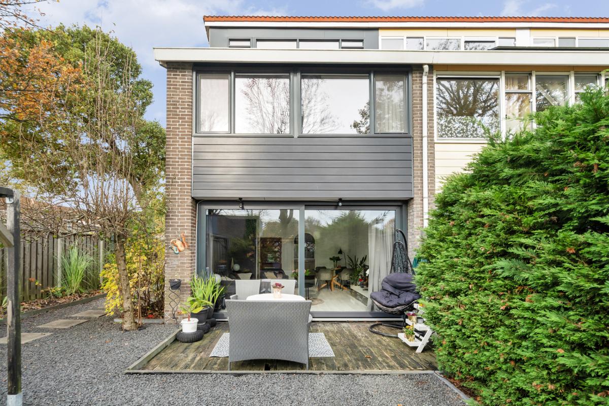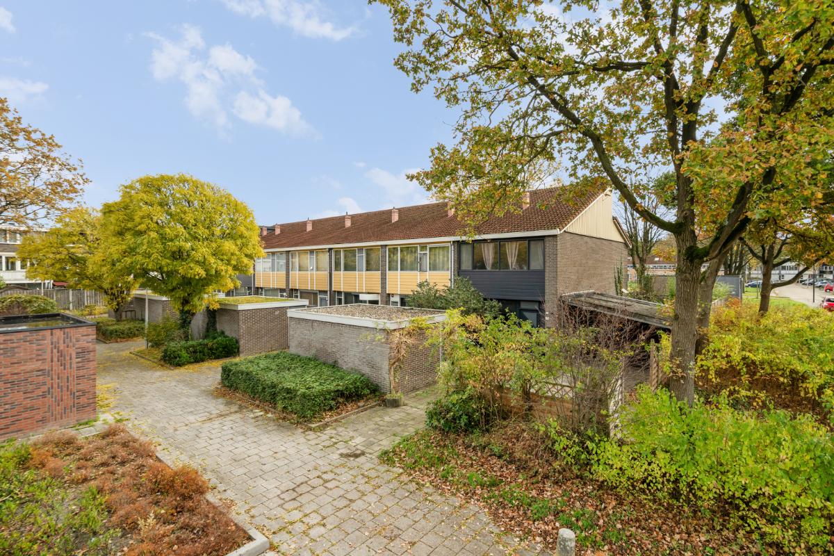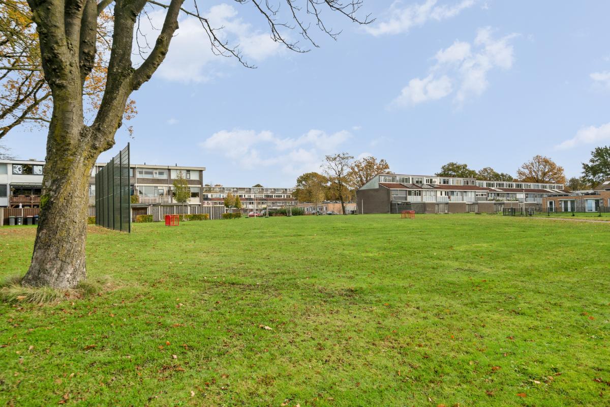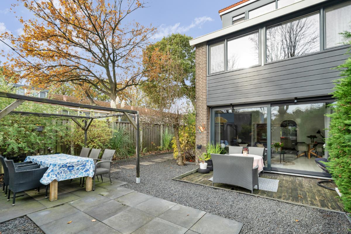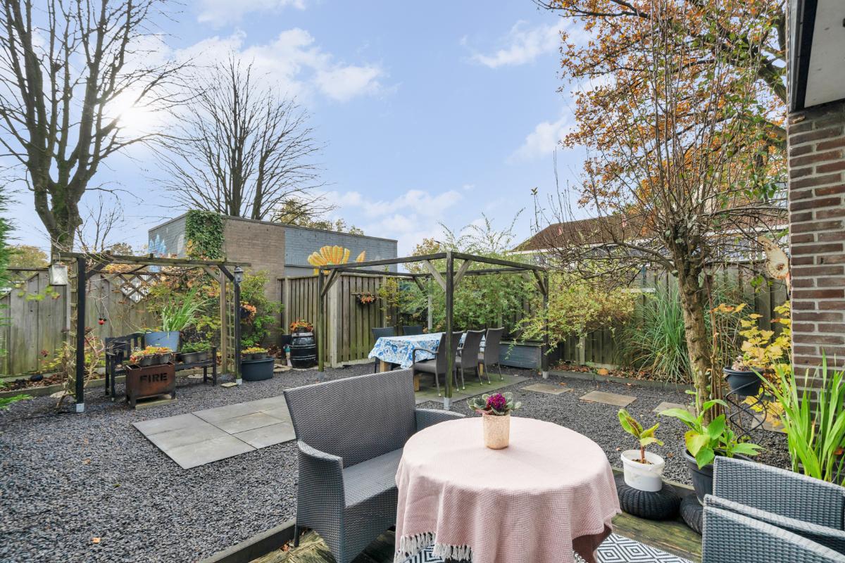 Tuin: Volg het pad tussen het groen en kom uit in de voortuin, een fijne, volledig betegelde ruimte met een handige stenen berging en een carport. Hier is plek genoeg voor je auto, fietsen en al je tuinspullen. Alles praktisch bij de hand. De onderhoudsvriendelijke tuin loopt door aan de achterzijde van de woning. Direct aan het huis ligt een terras waar je ’s ochtends geniet van een kop koffie in de zon. Verder wisselen grind, bestrating en beplanting elkaar speels af. Onder de houten pergola vind je een beschutte plek voor een grote eettafel. De borders met planten en potten zorgen voor een natuurlijke sfeer, terwijl de schuttingen en het groen rondom de tuin zorgen voor volledige privacy. Je zit hier heerlijk, zonder inkijk van buren. En misschien wel het mooiste van alles: direct achter de tuin ligt een groot groen voetbal/speelveld.