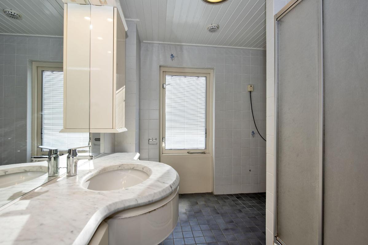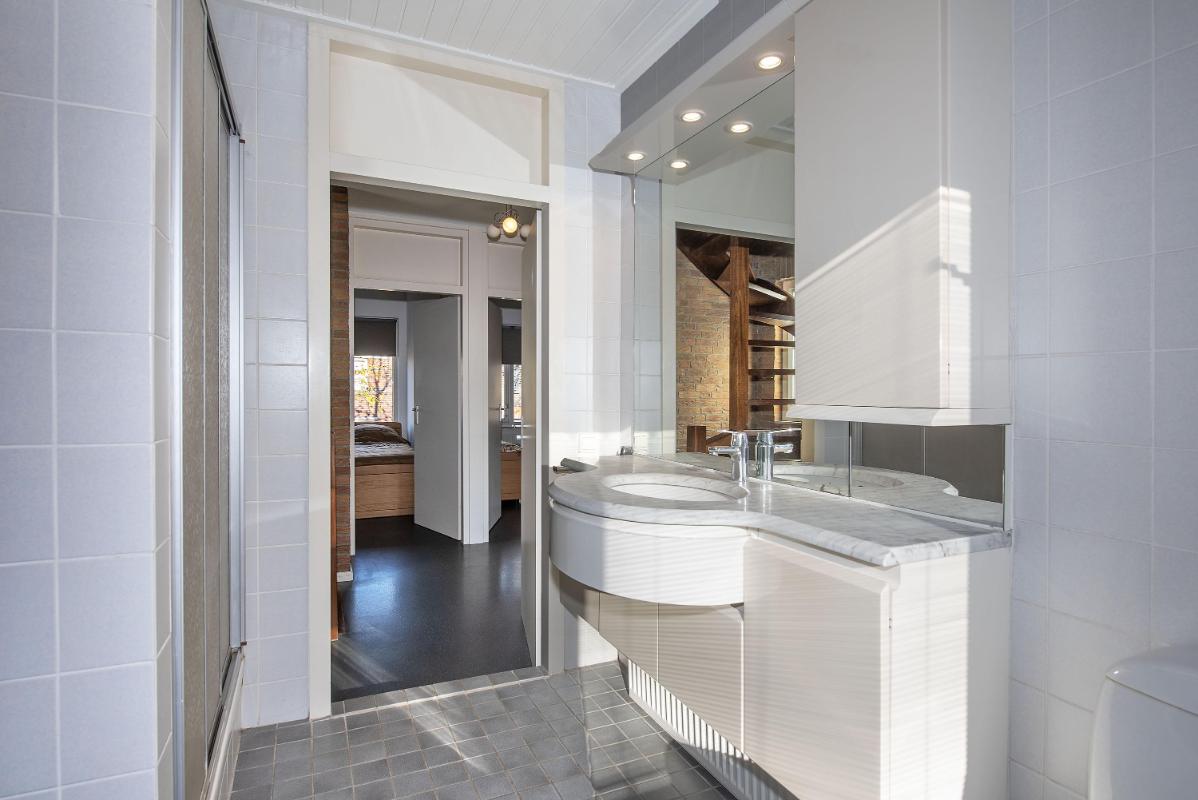 1e verdieping: Via de houten trap kom je uit op de ruime overloop die toegang biedt tot alle kamers op de eerste verdieping. Deze verdieping biedt drie royale slaapkamers, elk voorzien van grote ramen die de ruimtes vullen met licht en een open sfeer creëren. Één van de slaapkamers is bijzonder praktisch ingericht met vaste inbouwkasten en een eigen wasbak en spiegel, ideaal voor extra comfort en gemak. De ruime badkamer heeft lichtblauwe wandtegels met subtiele zilveren accenten en een marmeren blad met een elegante ovale vorm. Het wasmeubel biedt kastjes voor het netjes opbergen van spullen en de dichte douche met schuifdeuren zorgt voor een goede afscherming. Bovendien is in de badkamer een aansluiting voor de wasmachine aanwezig.