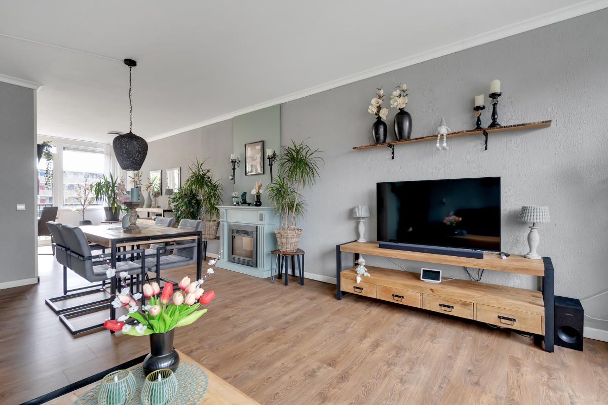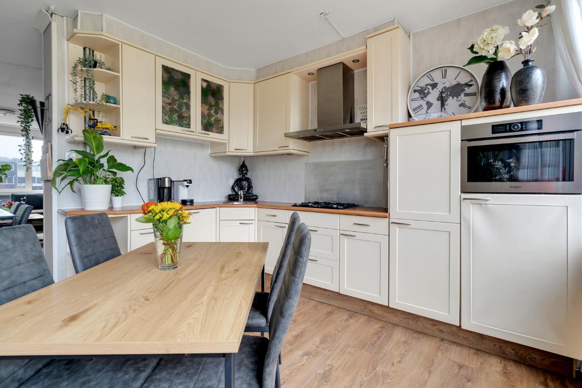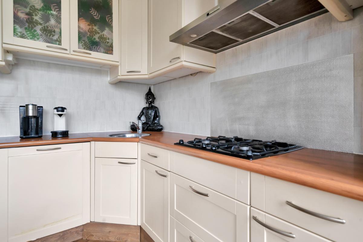 1e verdieping: Op de eerste verdieping bevindt zich de ruime en sfeervolle woonverdieping, een heerlijke plek waar wonen, koken en gezellig samenzijn samenkomen. De woonkamer strekt zich uit over de volledige lengte van de woning en dankzij de grote ramen aan de voorzijde is er veel lichtinval. Hier kun je lekker ontspannen na een dag werken en er is voldoende ruimte voor zowel een royale zithoek als een grote eettafel. Aan de achterzijde vind je de open woonkeuken, uitgevoerd in een lichte kleurstelling en voorzien van diverse inbouwapparatuur, waaronder een gaskookplaat, afzuigkap, oven en koelkast. De keuken biedt werk en bergruimte, perfect voor wie graag kookt of samen aan tafel wil borrelen terwijl het eten wordt klaargemaakt. De openslaande deuren zorgen bovendien voor een prettige verbinding met buiten en laten veel daglicht binnen.