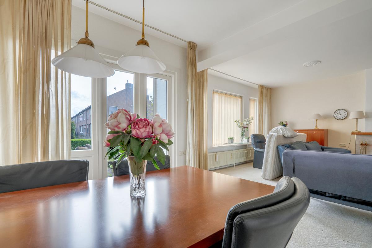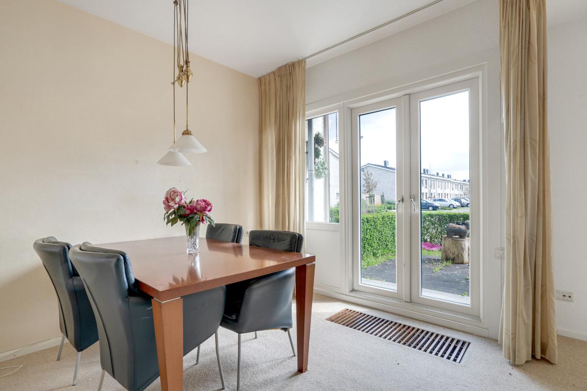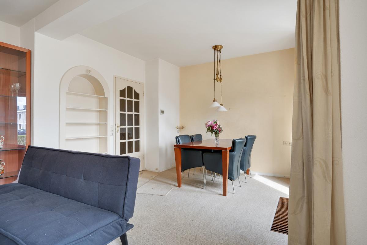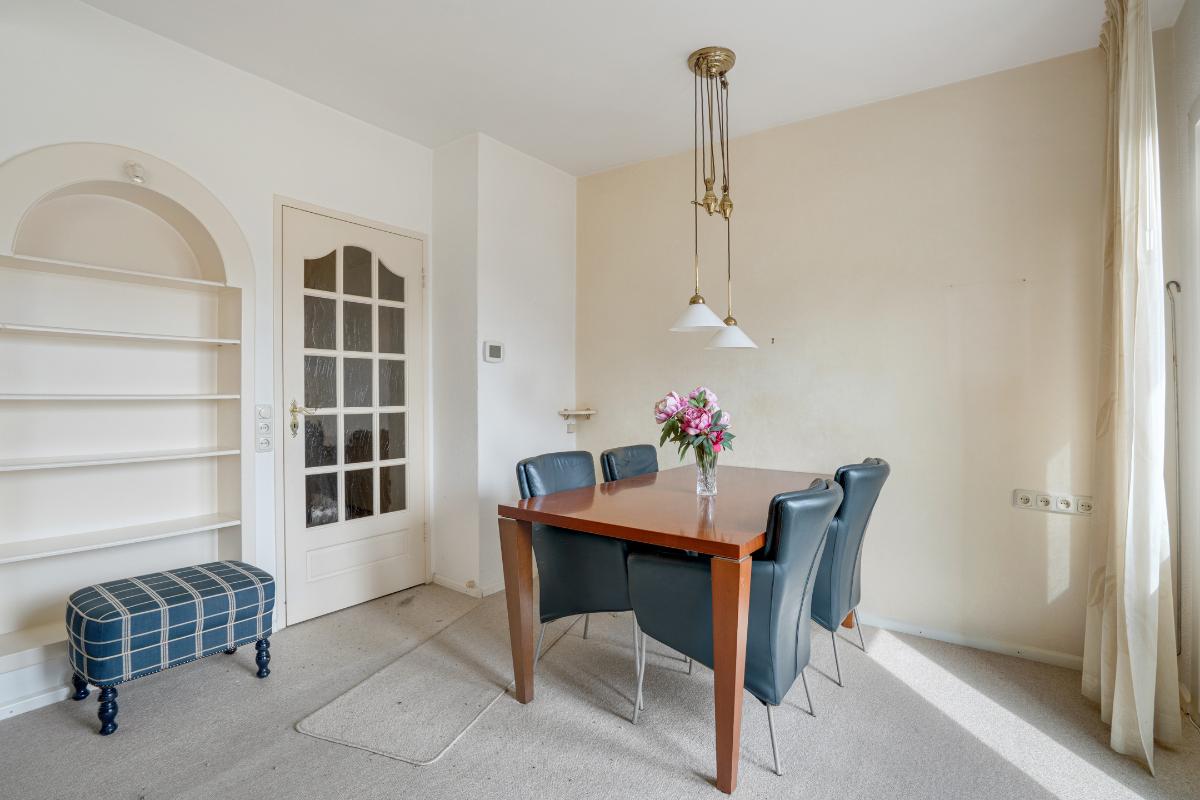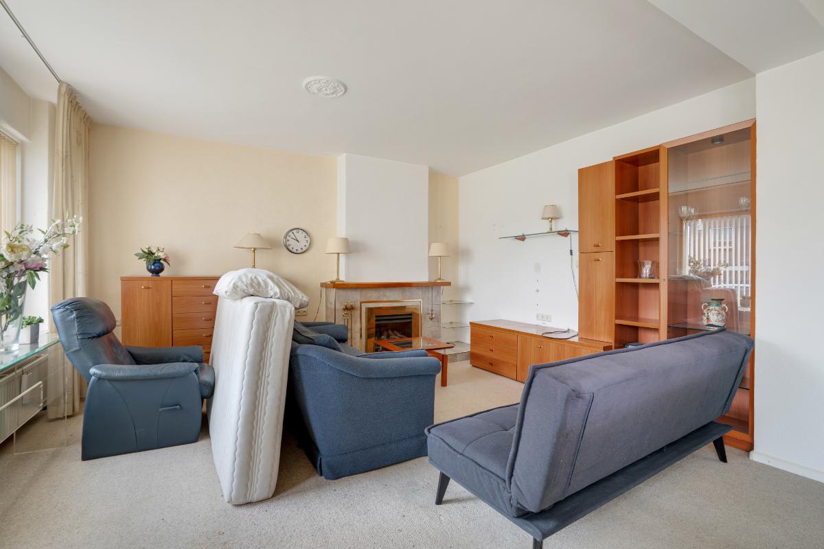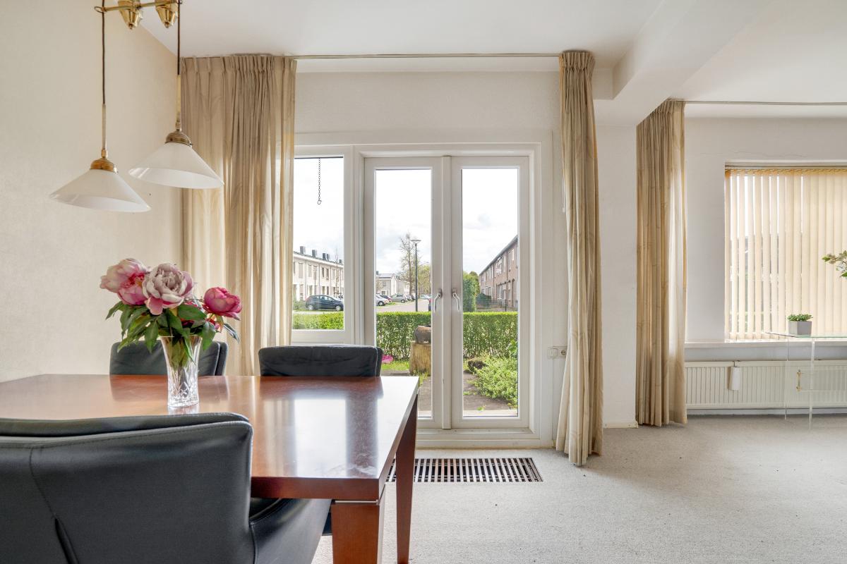 De woonkamer is ruim van opzet en heeft door de grote ramen een aangename lichtinval. Er is volop plek voor een zitgedeelte en een eettafel. De schouw geeft de ruimte extra uitstraling en vormt samen met de nis een mooi detail in het geheel. Via de openslaande deuren loop je zo je eigen terras op. Dat maakt het wonen op de begane grond hier extra aantrekkelijk.