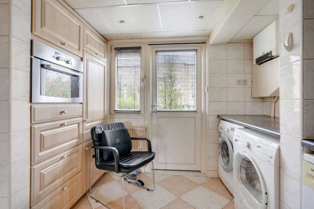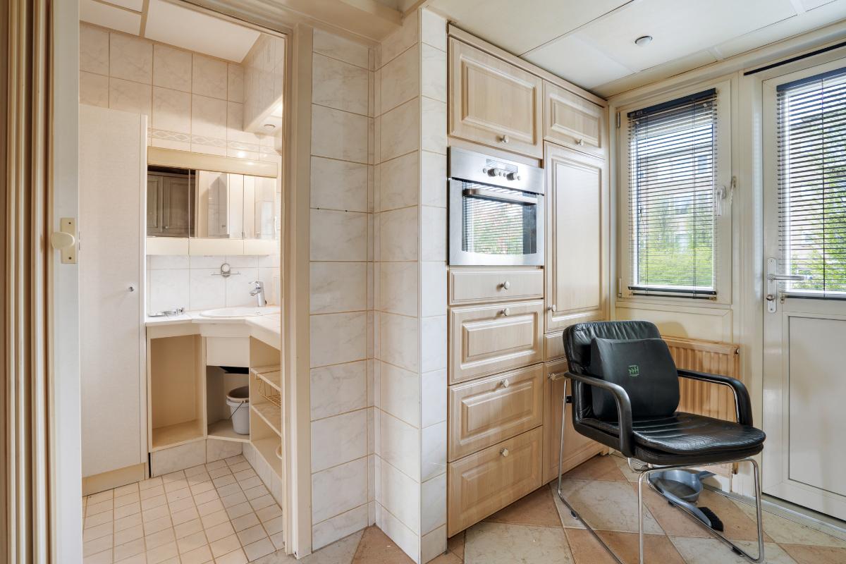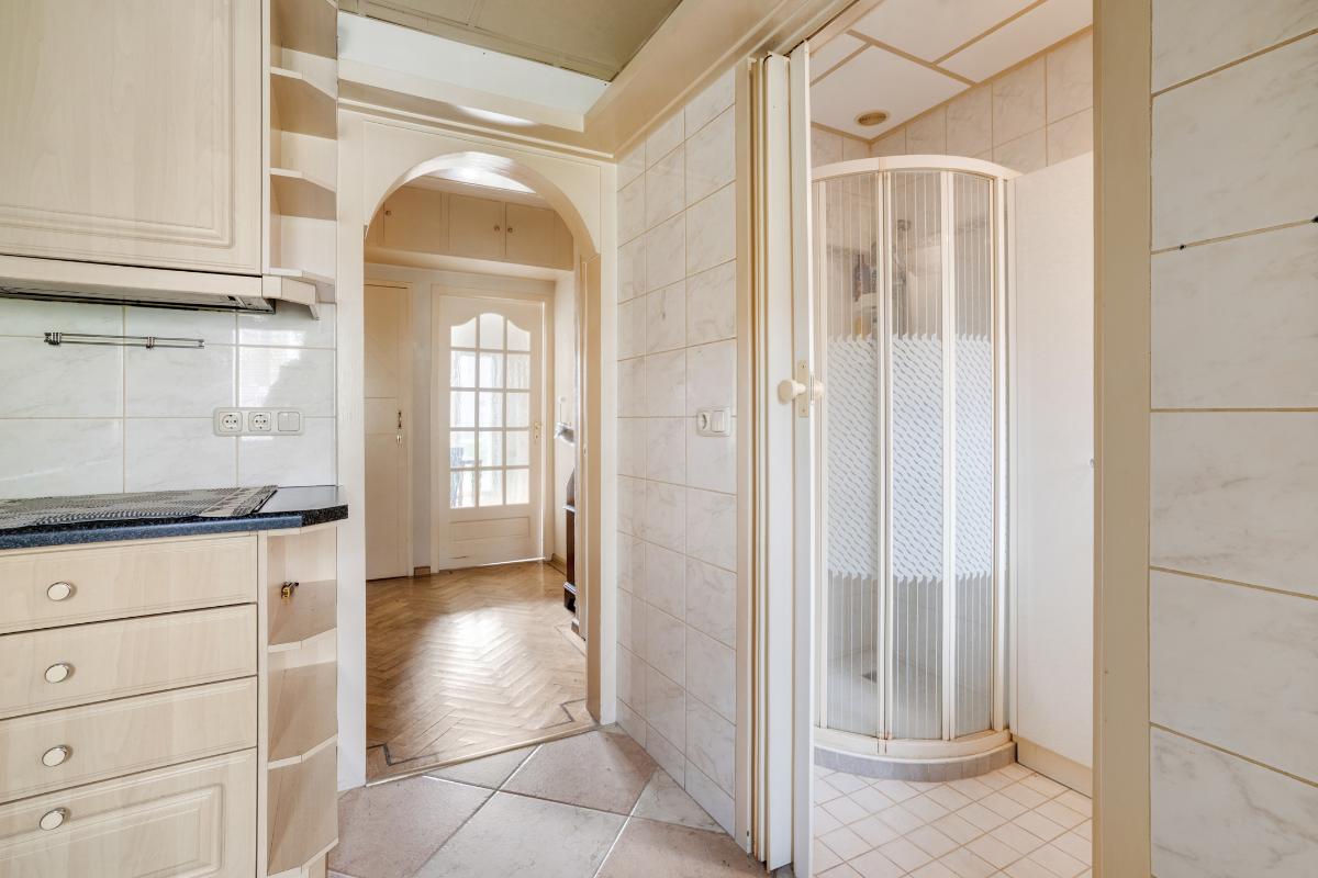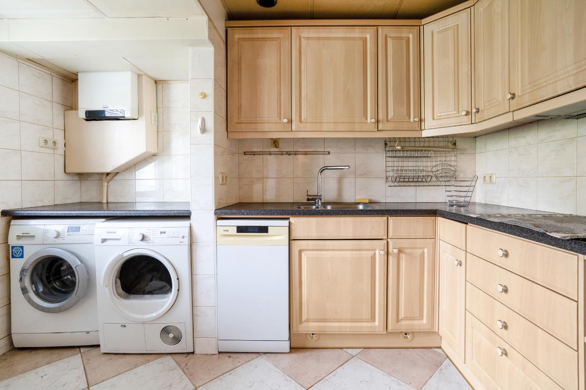 De keuken ligt apart van de woonkamer en is praktisch ingericht, met veel kastruimte en diverse inbouwapparatuur. Zo beschikt de keuken over een combimagnetron, inductiekookplaat, afzuigkap, koelkast, vriezer en vaatwasser. Ook is hier ruimte voor de wasmachine en droger. Aansluitend bevindt zich hier de badkamer, die is voorzien van een douche en wastafelmeubel. Het toilet is separaat en vanuit de hal bereikbaar.