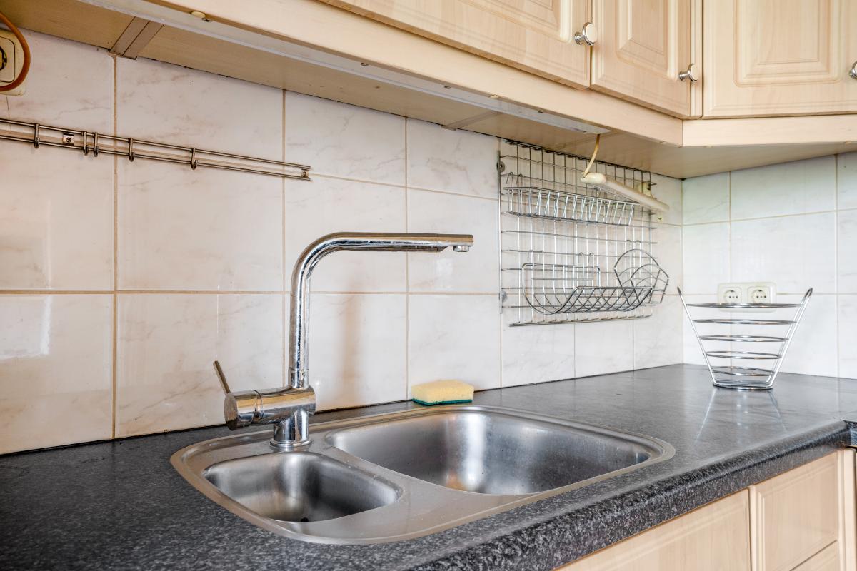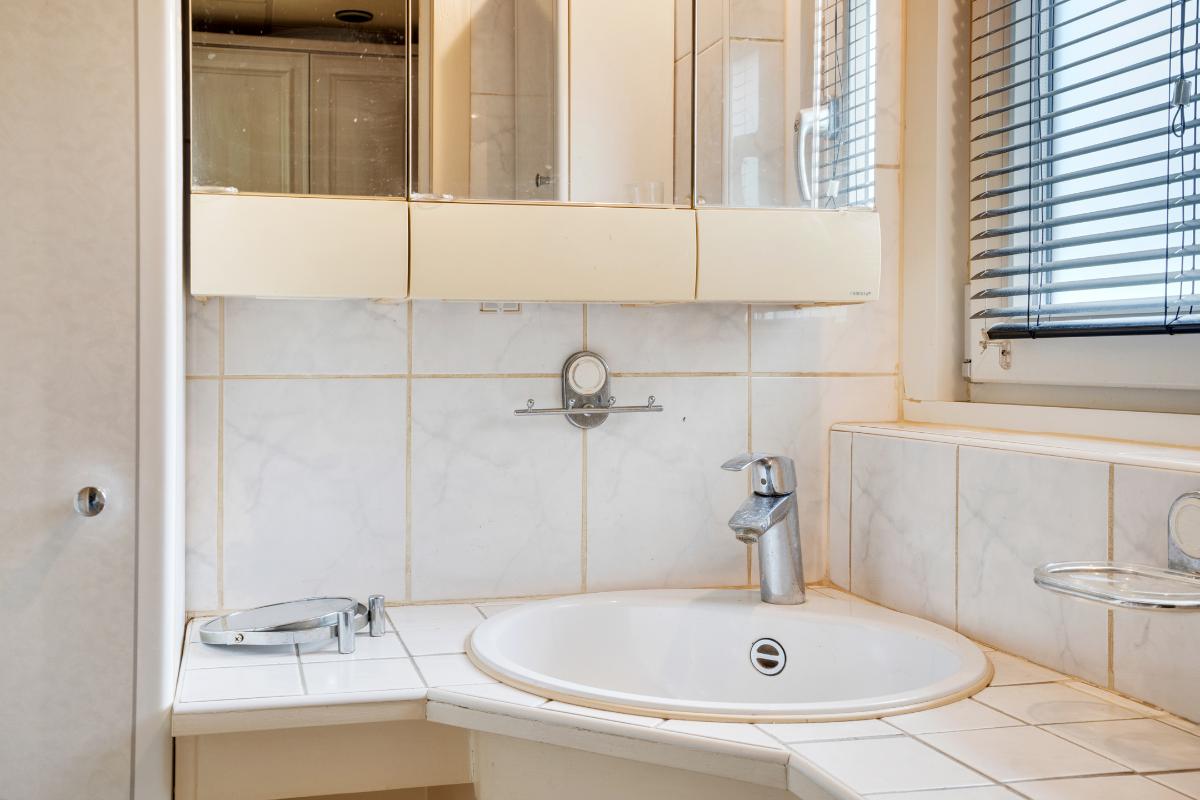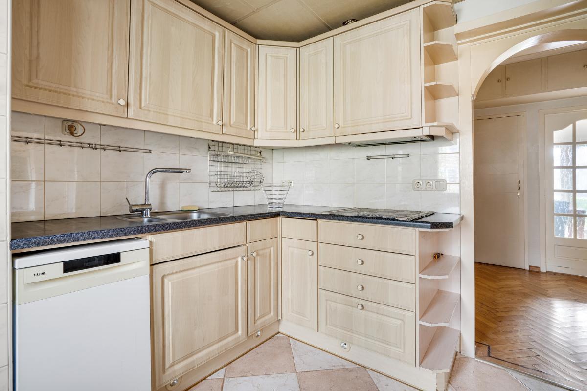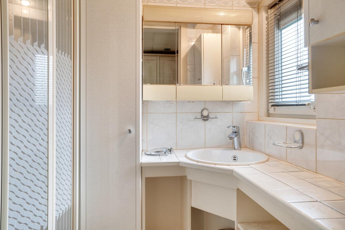 De keuken ligt apart van de woonkamer en is praktisch ingericht, met veel kastruimte en diverse inbouwapparatuur. Zo beschikt de keuken over een combimagnetron, inductiekookplaat, afzuigkap, koelkast, vriezer en vaatwasser. Ook is hier ruimte voor de wasmachine en droger. Aansluitend bevindt zich hier de badkamer, die is voorzien van een douche en wastafelmeubel. Het toilet is separaat en vanuit de hal bereikbaar.