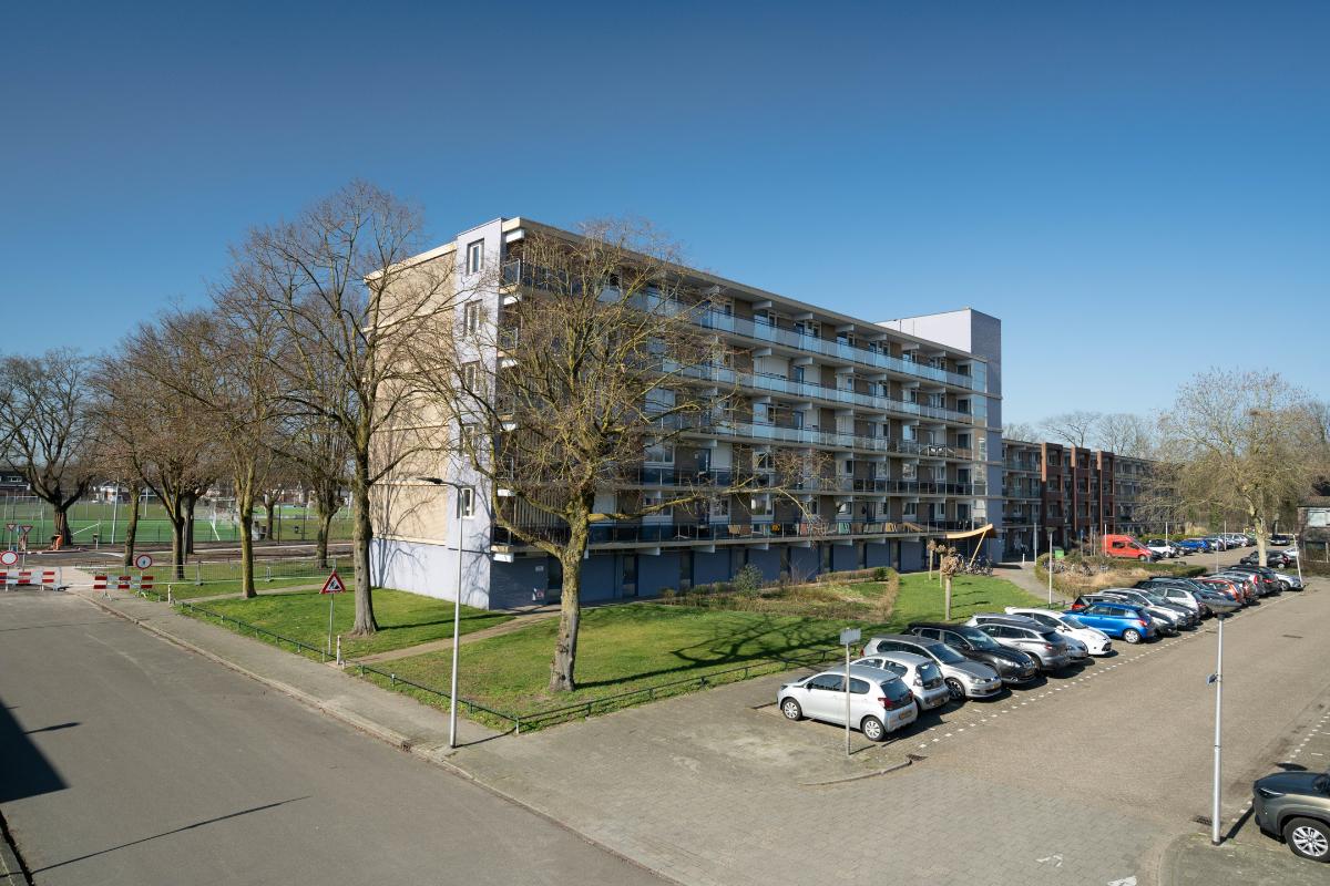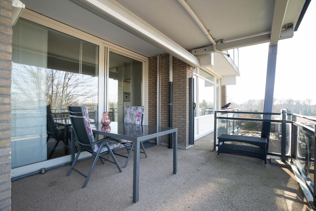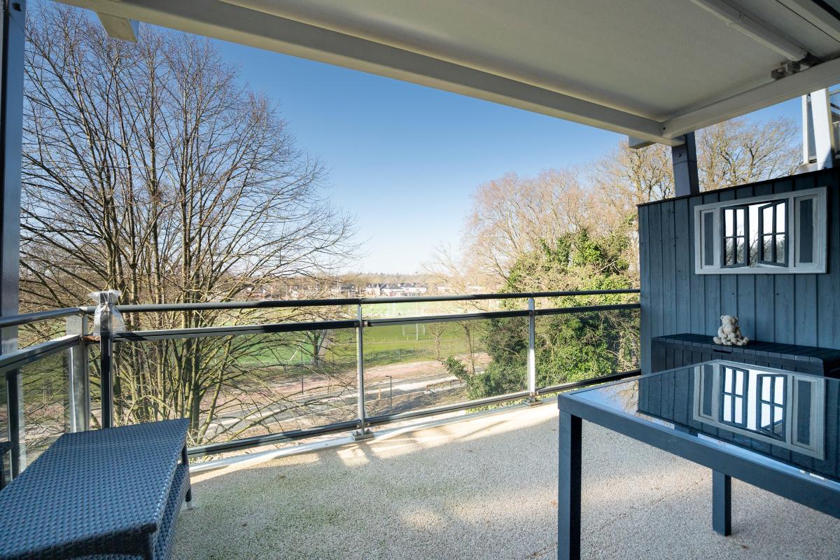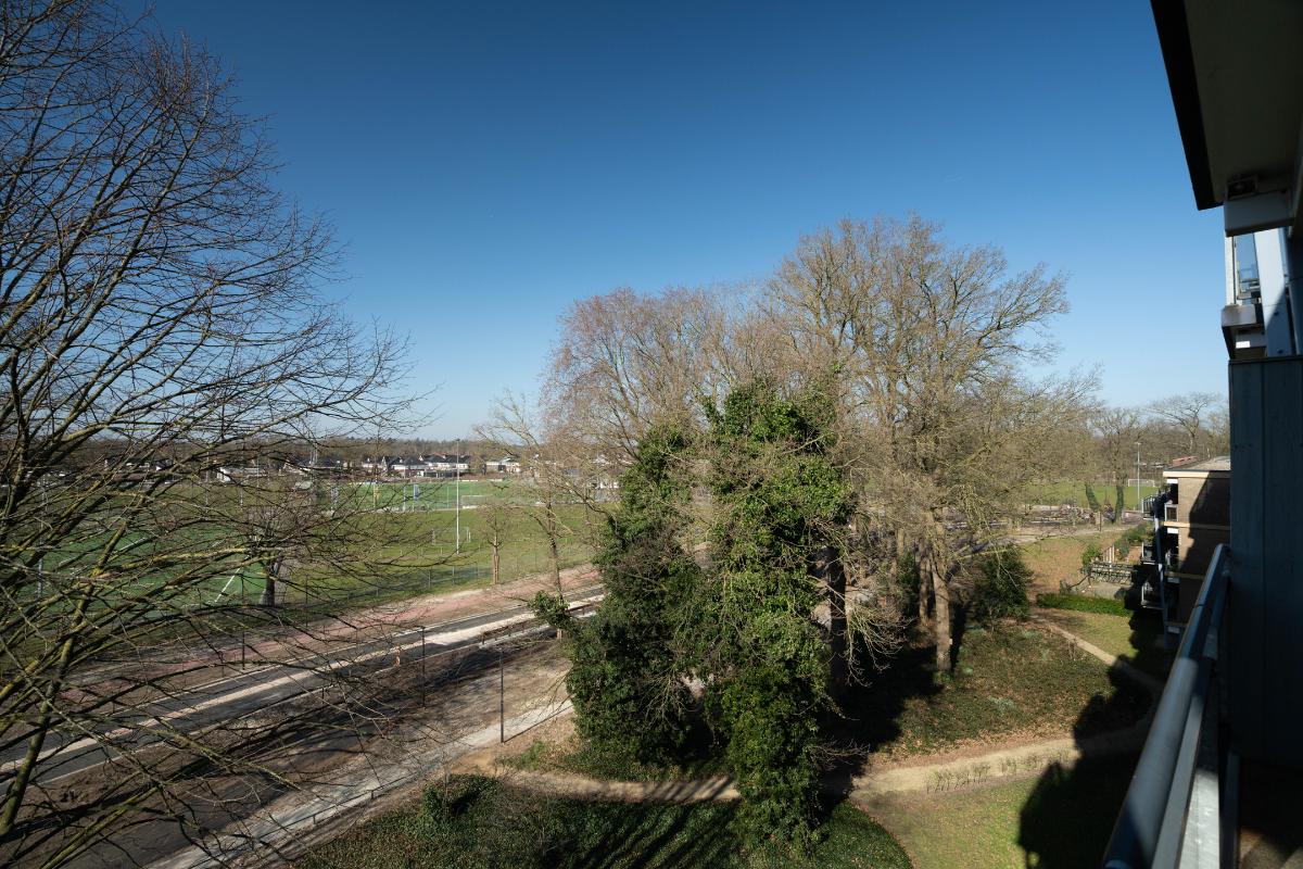 Vanuit zowel de woonkamer als de keuken ervaart u een prettig contact met buiten. Het balkon is royaal van formaat en biedt een fijne plek om beschut te zitten. Daarnaast is hier ook een vaste kast aanwezig, ideaal voor het opbergen van bijvoorbeeld kussens, schoonmaakspullen of andere praktische zaken. Door de ligging kijkt u prettig weg over de omgeving en richting de sportvelden, wat zorgt voor een vrij en levendig uitzicht.