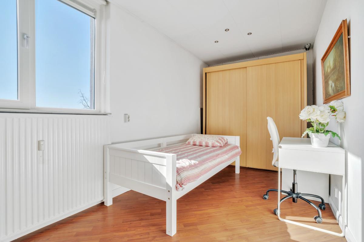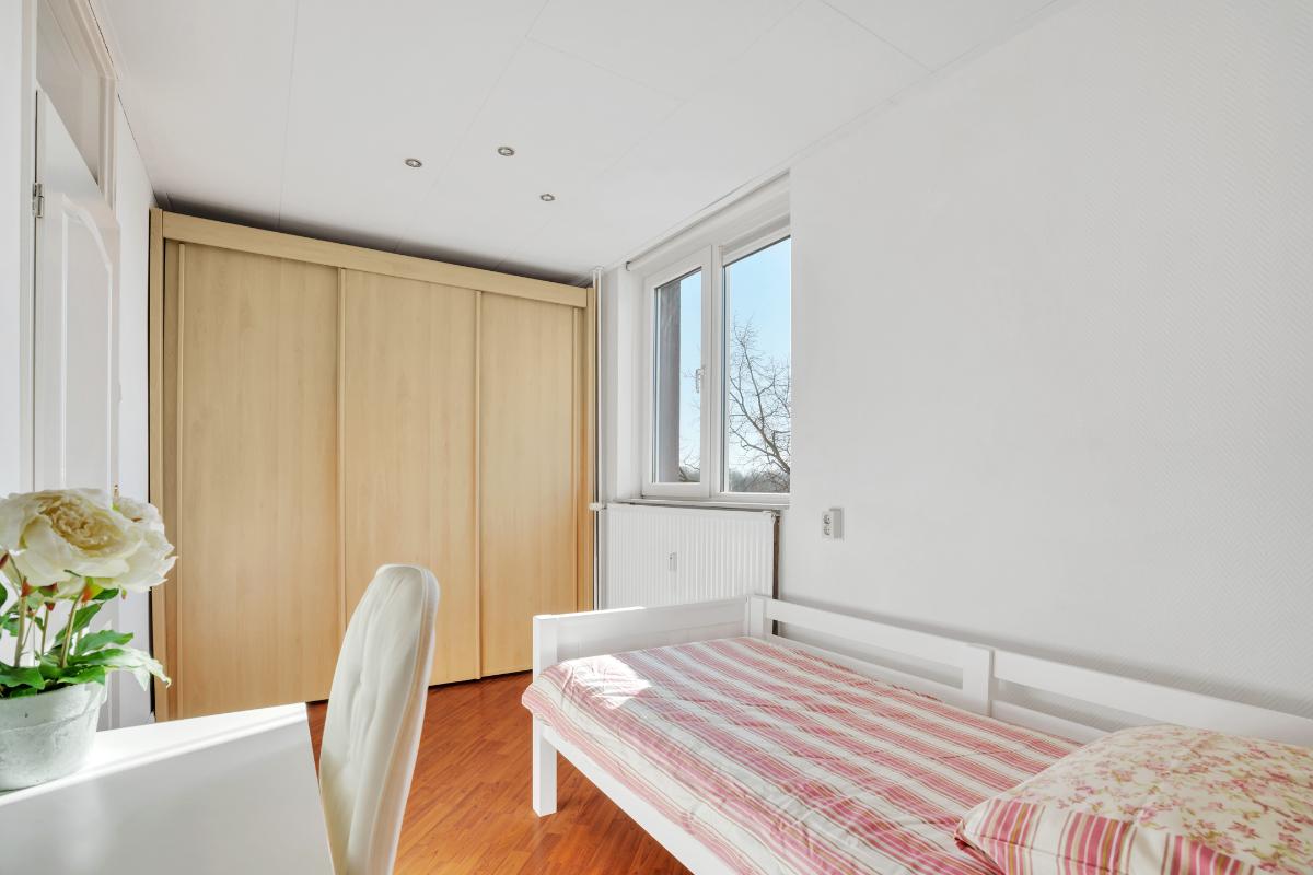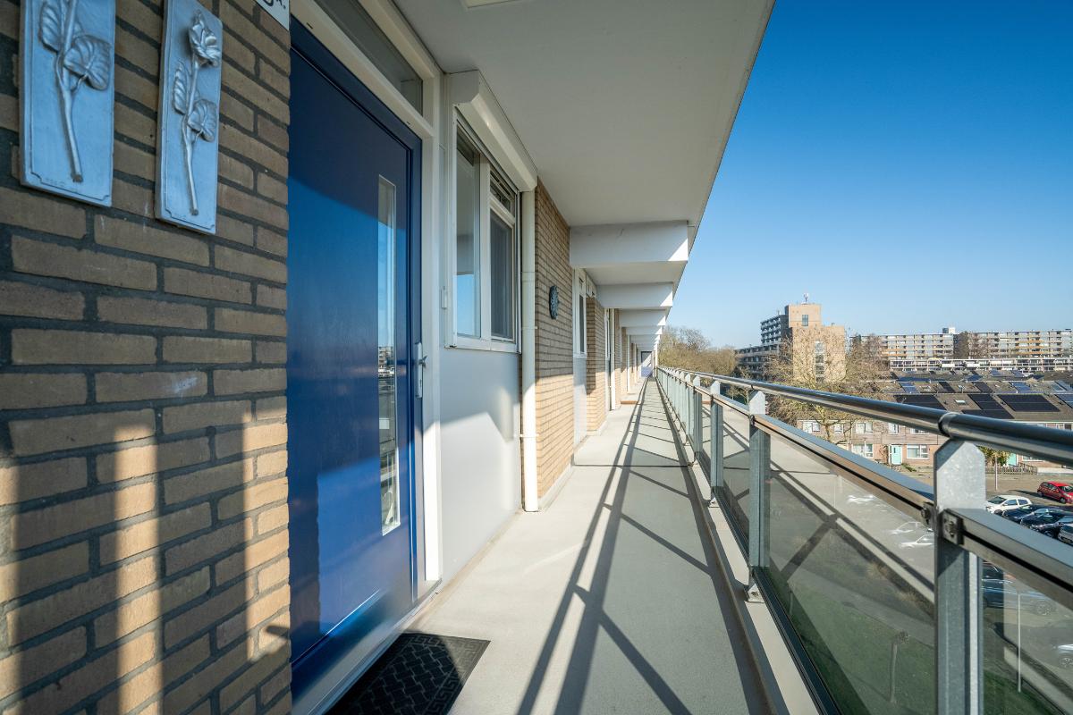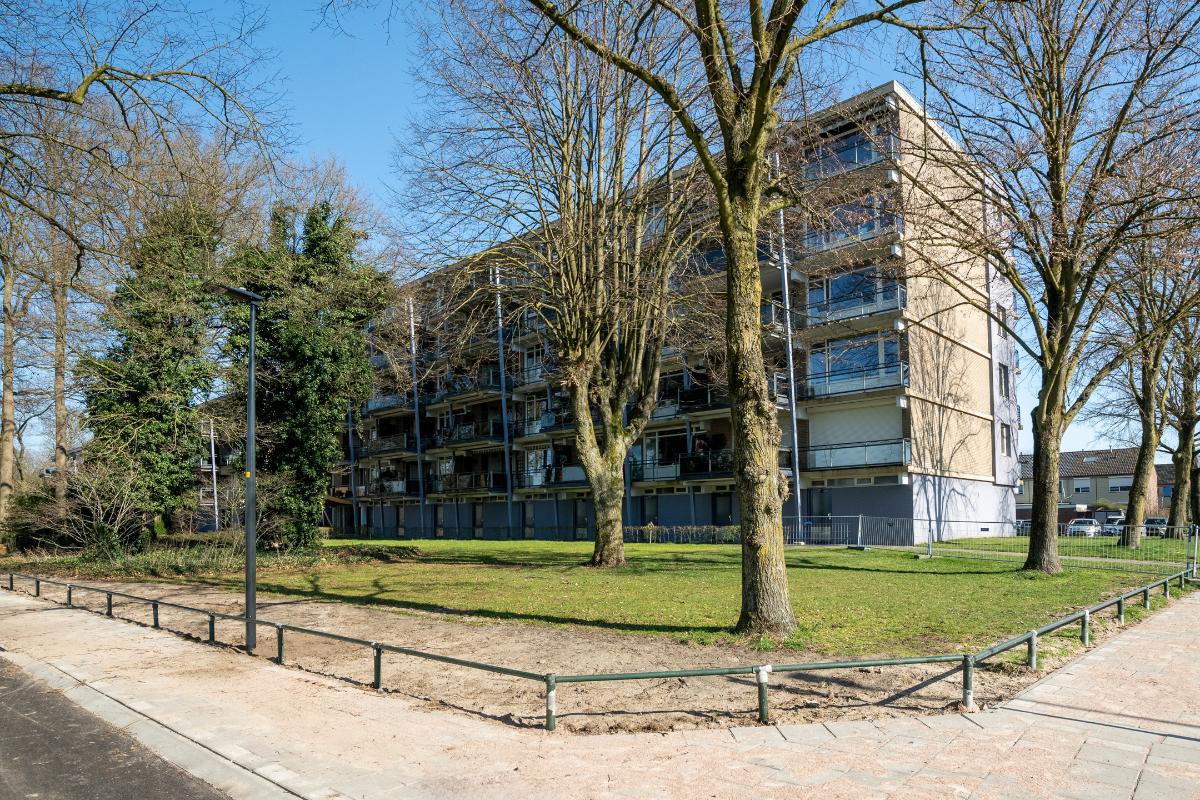 Vanuit zowel de woonkamer als de keuken ervaart u een prettig contact met buiten. Het balkon is royaal van formaat en biedt een fijne plek om beschut te zitten. Daarnaast is hier ook een vaste kast aanwezig, ideaal voor het opbergen van bijvoorbeeld kussens, schoonmaakspullen of andere praktische zaken. Door de ligging kijkt u prettig weg over de omgeving en richting de sportvelden, wat zorgt voor een vrij en levendig uitzicht.