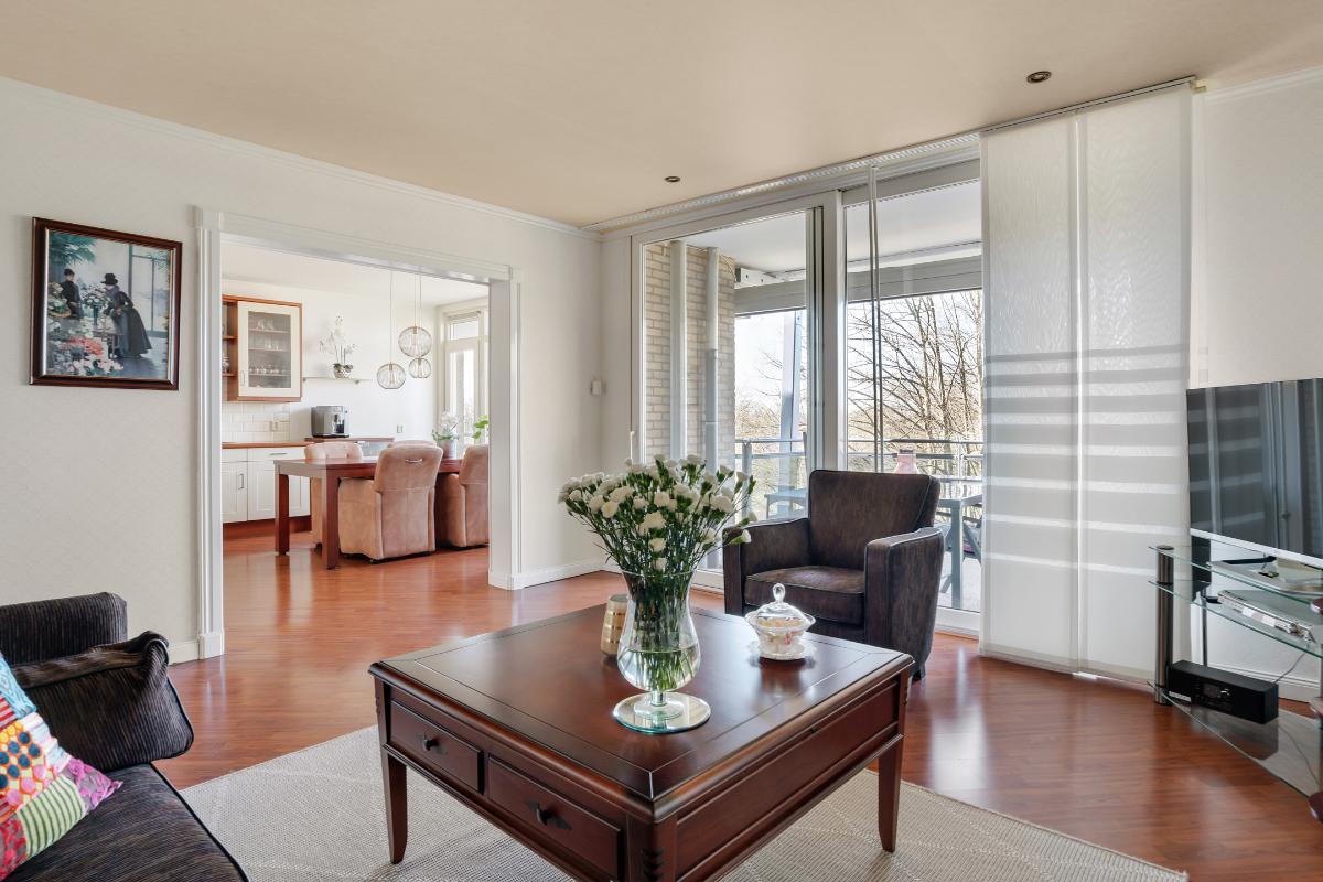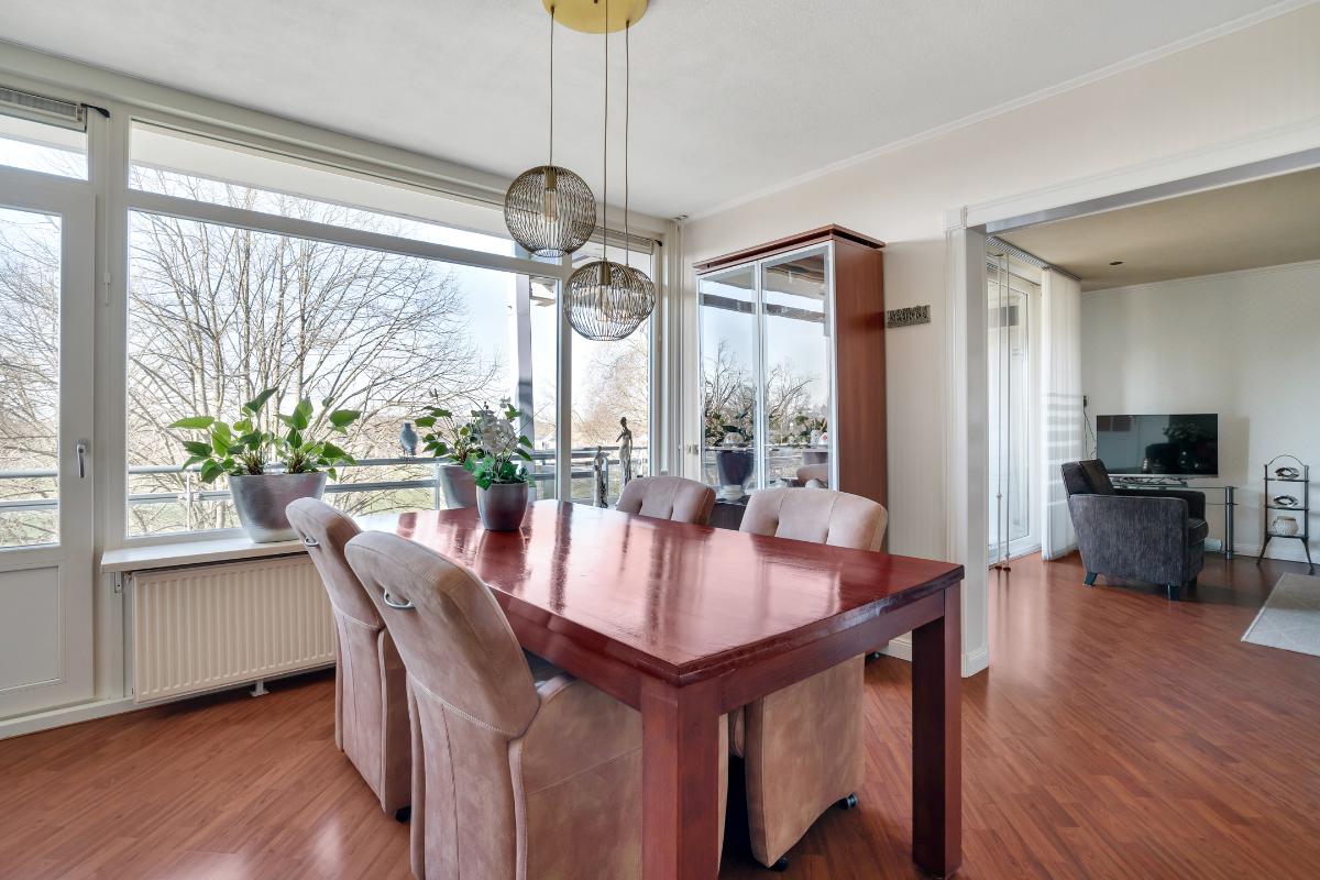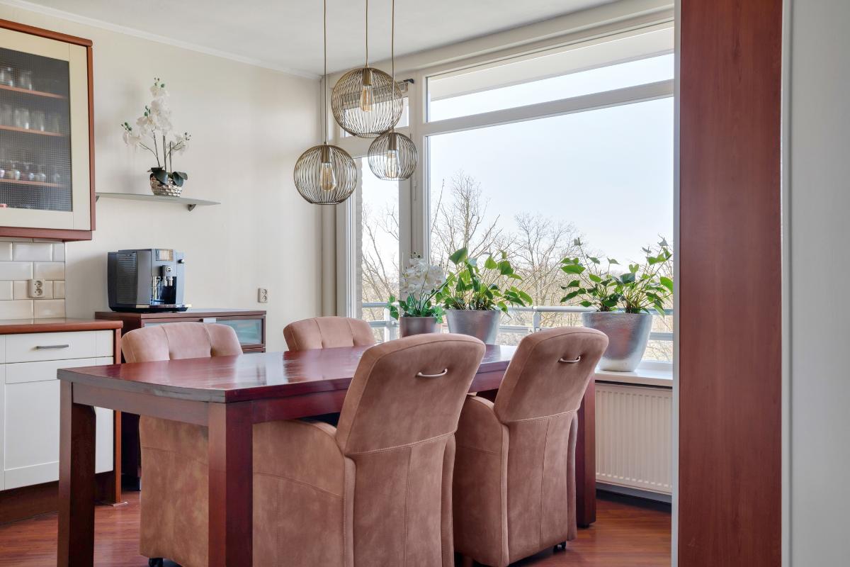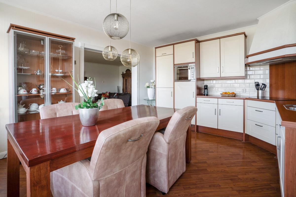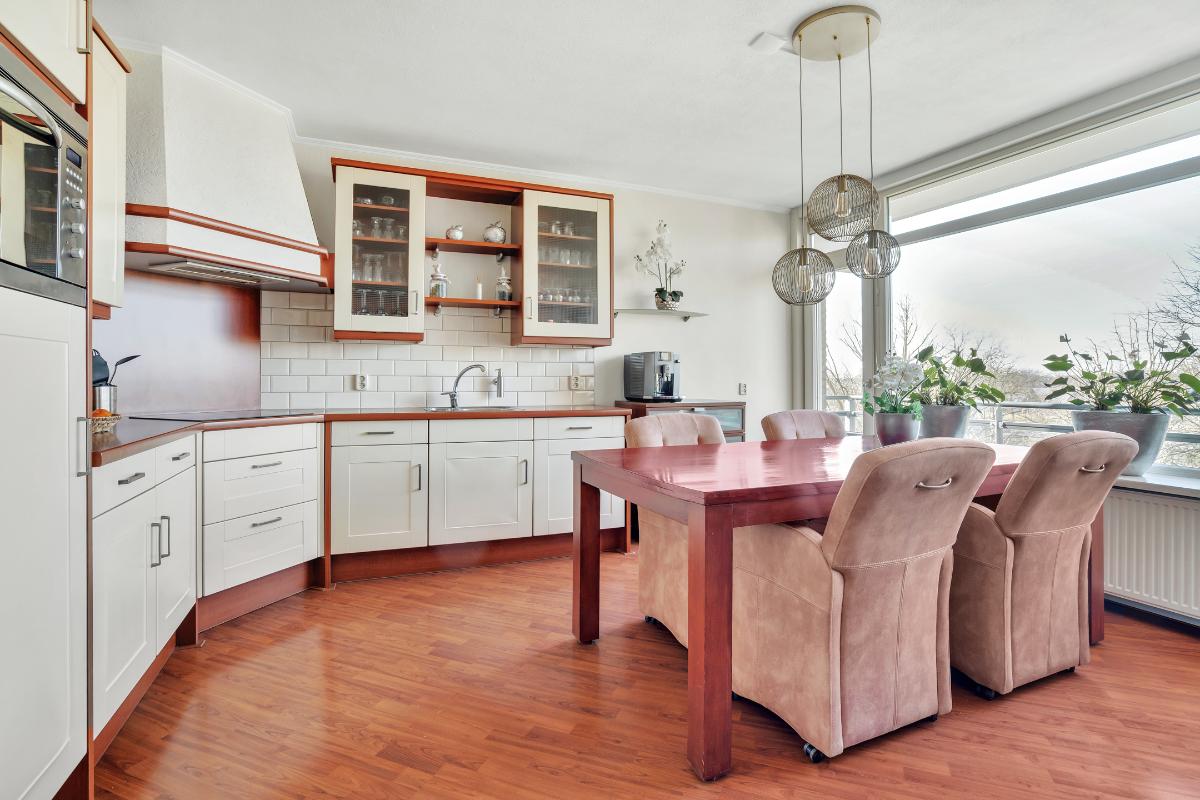 De woonkamer is ruim van opzet en aangenaam licht dankzij de grote raampartijen en de directe verbinding met het balkon. Het is een fijne leefruimte met ruim voldoende plaats voor een comfortabele zithoek. Aansluitend bevindt zich de keuken, die in een praktische L-opstelling is geplaatst. Hierdoor is er volop werk- en kastruimte aanwezig. De keuken is bovendien voorzien van diverse inbouwapparatuur, waaronder een inductie kookplaat, vaatwasser, afzuigkap, combi-oven-magnetron en koelkast.