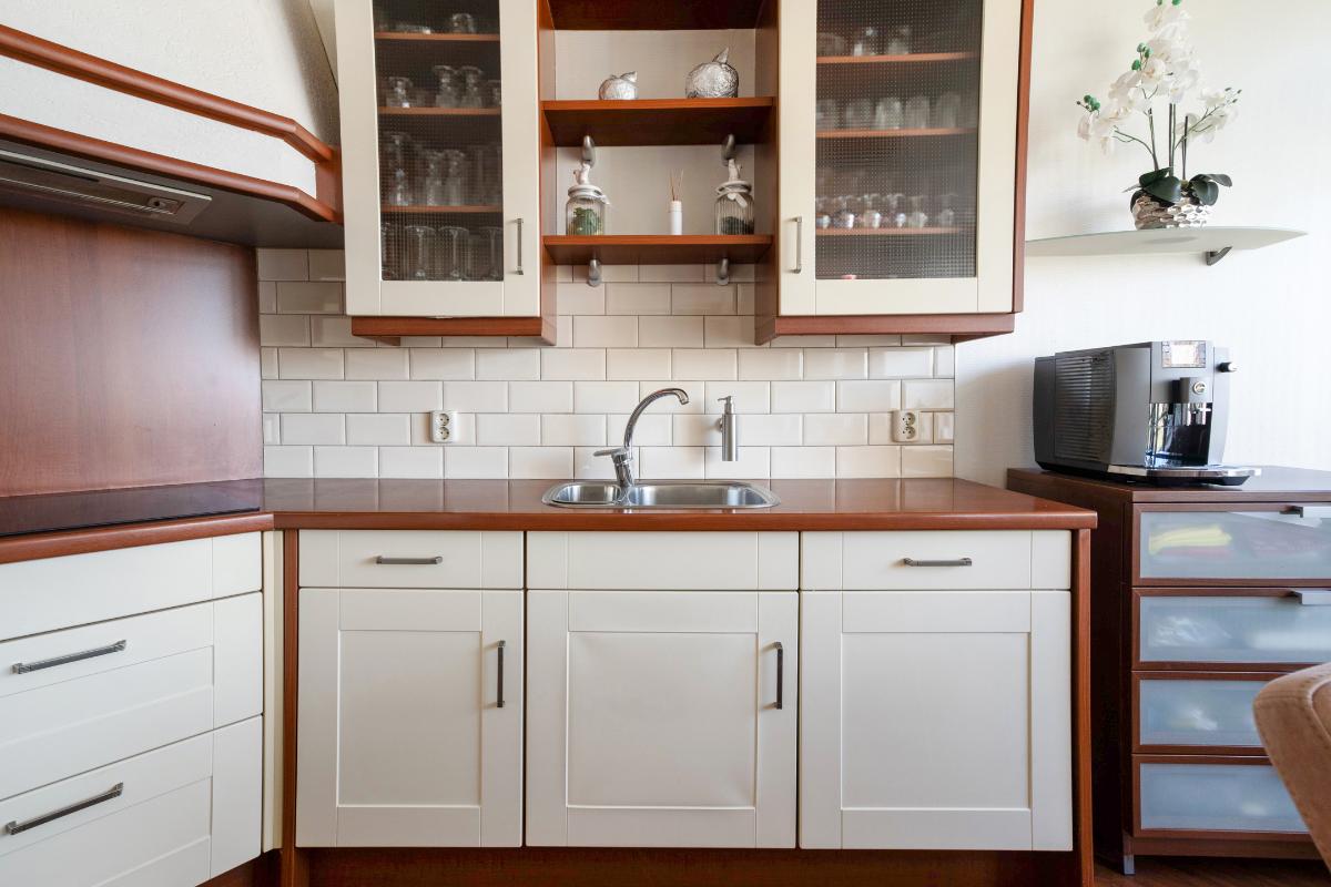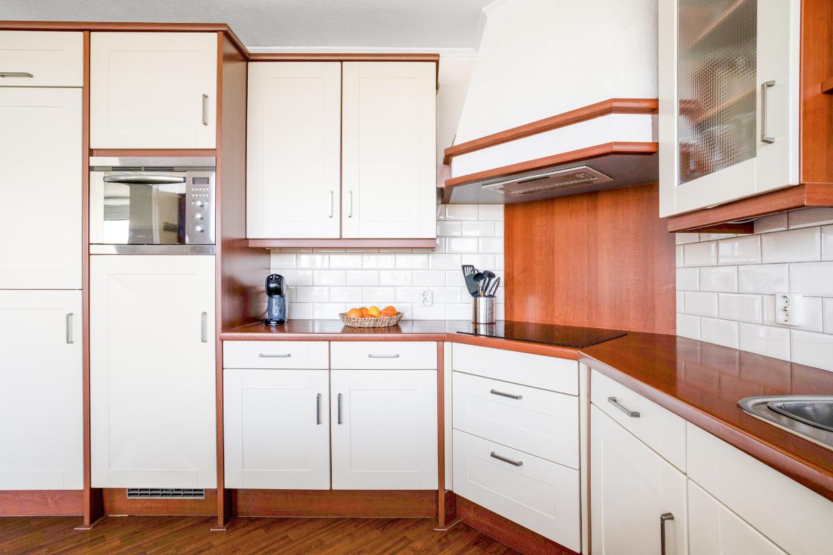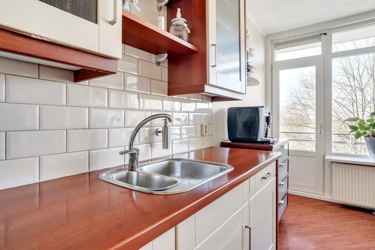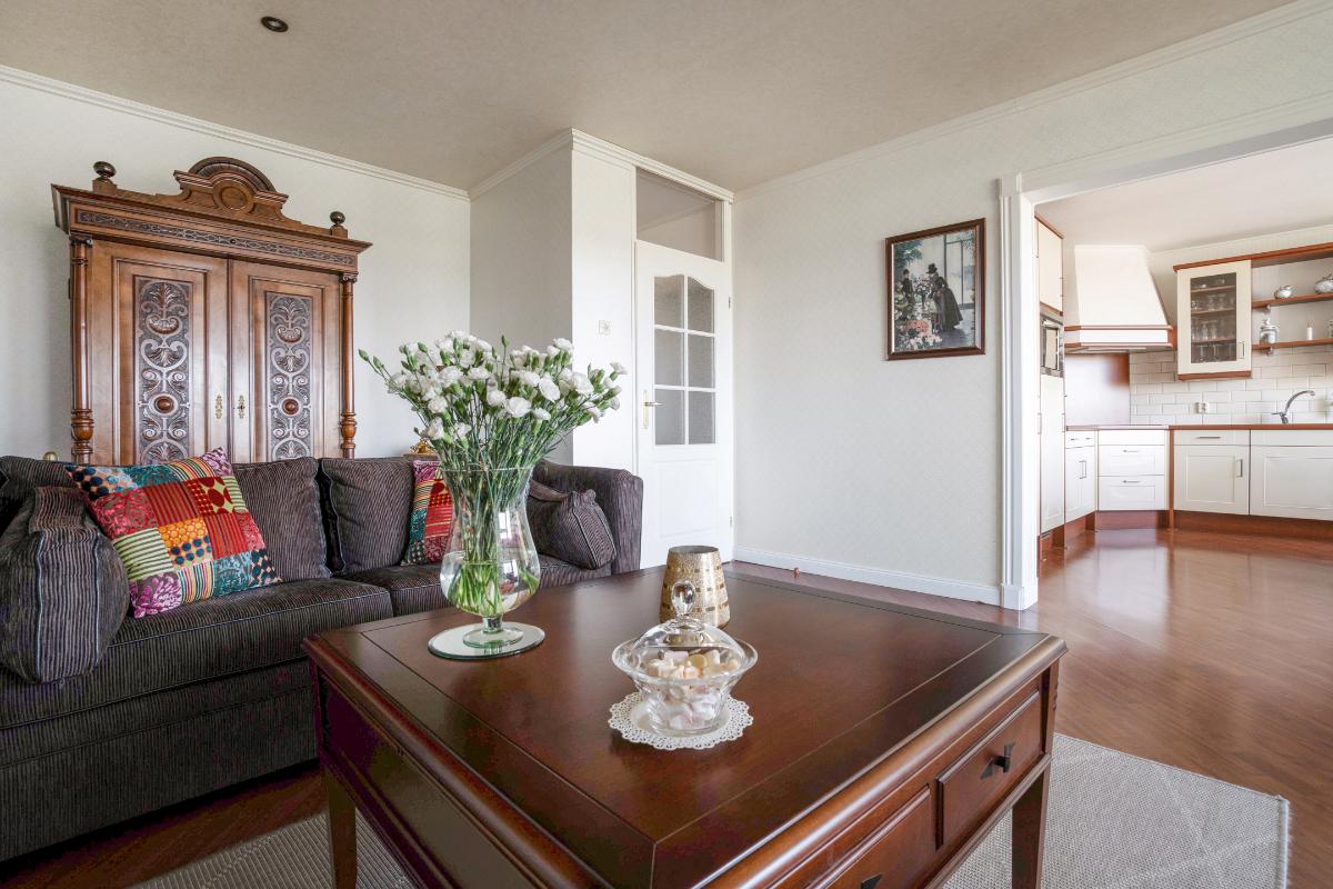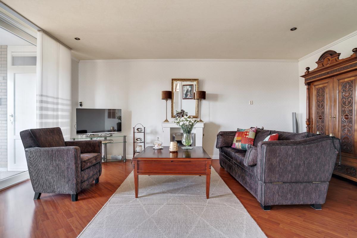 De woonkamer is ruim van opzet en aangenaam licht dankzij de grote raampartijen en de directe verbinding met het balkon. Het is een fijne leefruimte met ruim voldoende plaats voor een comfortabele zithoek. Aansluitend bevindt zich de keuken, die in een praktische L-opstelling is geplaatst. Hierdoor is er volop werk- en kastruimte aanwezig. De keuken is bovendien voorzien van diverse inbouwapparatuur, waaronder een inductie kookplaat, vaatwasser, afzuigkap, combi-oven-magnetron en koelkast.