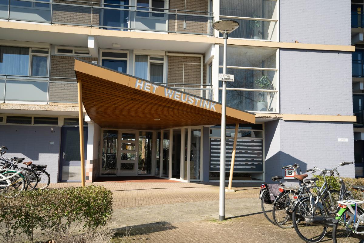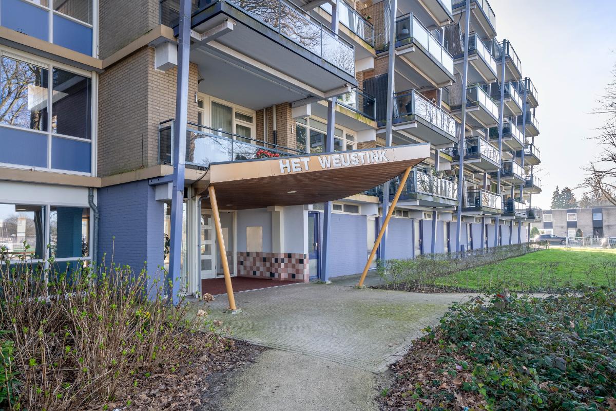 Complex: Deze woning maakt deel uit van Het Weustink, een verzorgd en ruim opgezet complex. Rondom het gebouw is volop parkeergelegenheid aanwezig, waardoor u doorgaans gemakkelijk een plek vindt voor de auto. De nette, overdekte entree zorgt voor een prettige ontvangst en biedt direct een verzorgd eerste aanzicht. Hier buiten bevinden zich de postvakken en de video-intercominstallatie, wat bijdraagt aan het comfort en het gevoel van veiligheid. Bij binnenkomst valt meteen het ruime en open karakter van het complex op. De centrale hal heeft veel lichtinval en geeft het gebouw een toegankelijke en verzorgde sfeer. Vanuit de hal bereikt u zowel het trappenhuis als de lift. Op de vierde woonlaag aangekomen loopt u via de overdekte galerij naar de voordeur. Deze buitenbalustrade is beschut gelegen, waardoor u hier met uitzicht over de wijk toch droog bij uw appartement aankomt. Daarnaast beschikt het appartement beneden over een ruime eigen berging. Deze berging is ideaal voor het opbergen van fietsen, koffers, gereedschap of andere spullen die u niet dagelijks nodig hebt.