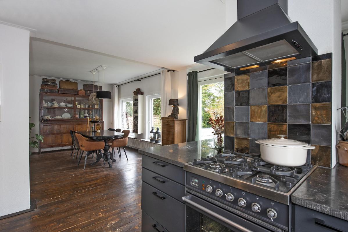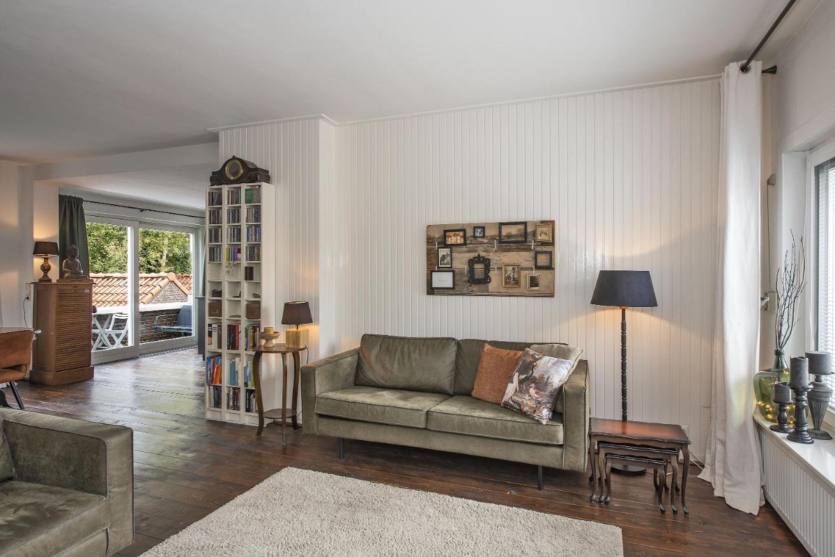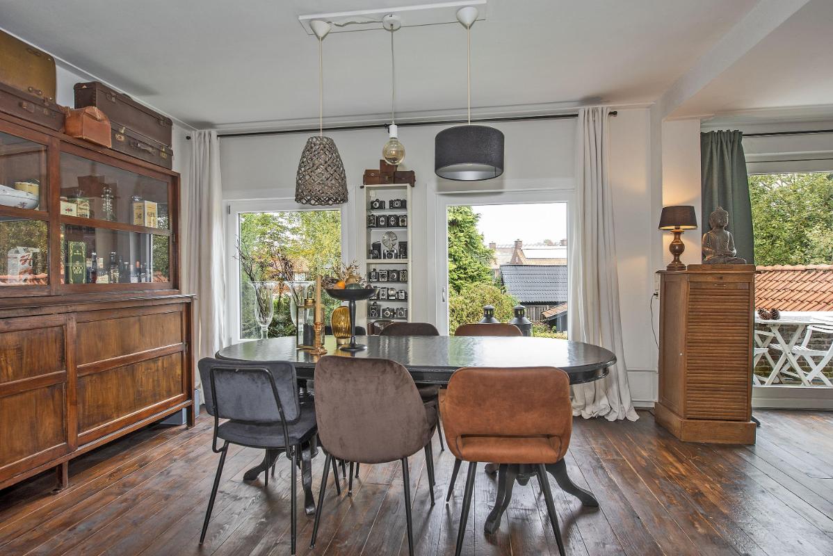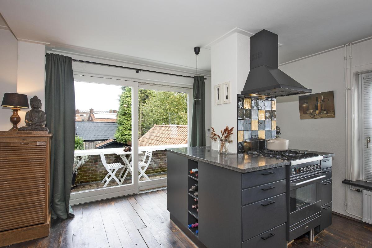 Eerste verdieping: Parkeer je auto op de oprit en kom binnen aan de zijkant van de woning. In het halletje is een garderobe en de trap brengt je naar de eerste verdieping van de maisonnette. Op de overloop vind je het aparte toilet en de badkamer, uitgerust met een douche en een wastafel. De overloop geeft toegang tot het hart van deze woning: de royale woon-eetkamer met open keuken. De ruimte is perfect opgedeeld in een sfeervolle zithoek aan de voorzijde, in het midden bevindt zicht de ruime eethoek en aangrenzend vind je de open keuken met een strak, donker design. De keuken is voorzien van een kookeiland en diverse inbouwapparatuur zoals een gasfornuis, boretti oven, vaatwasser en afzuigkap. Vanuit de keuken heb je toegang tot het knusse balkon, waar je heerlijk van het buitenleven kunt genieten. De donkere houten vloer loopt mooi door over de gehele verdieping, wat zorgt voor eenheid en een warme uitstraling.
