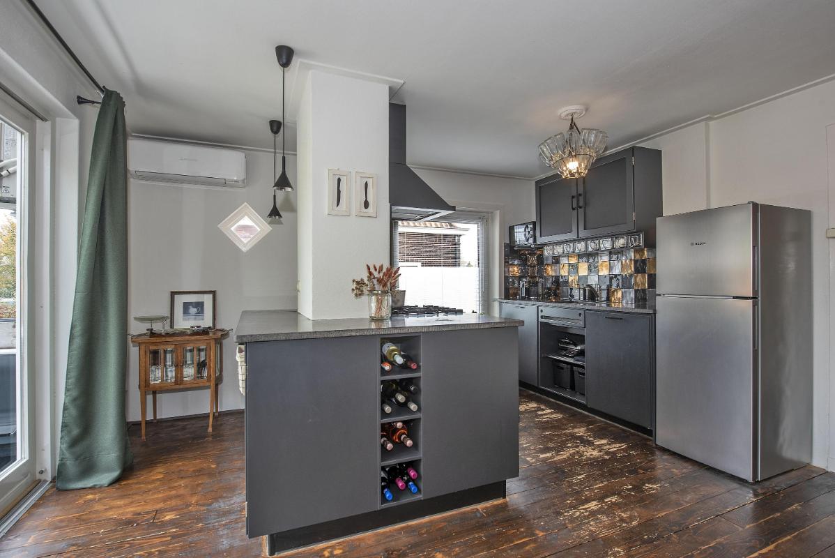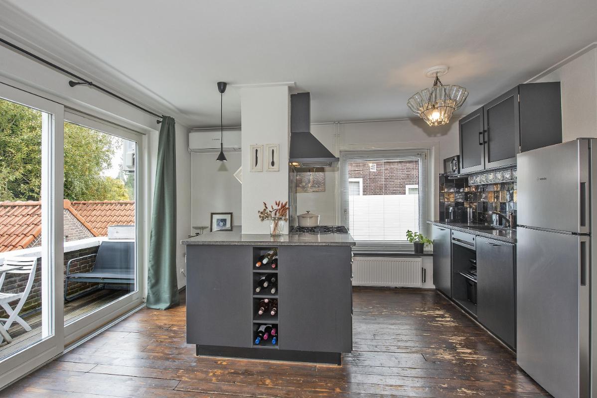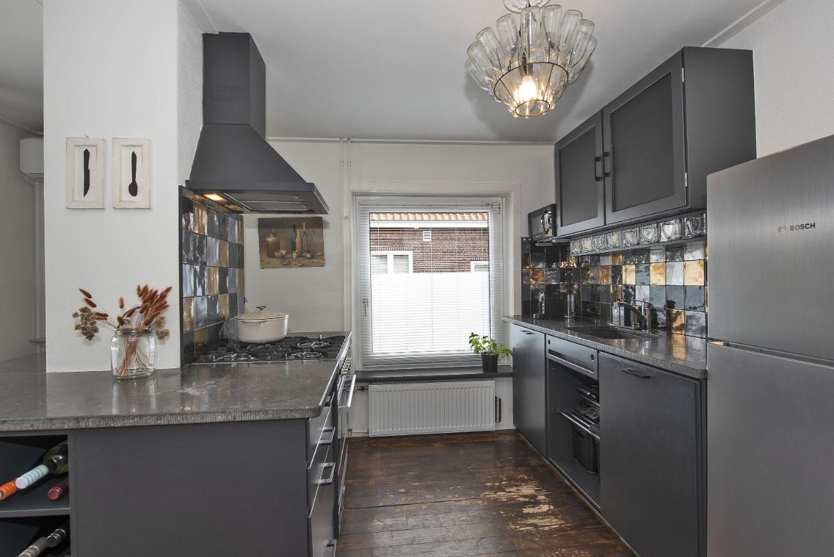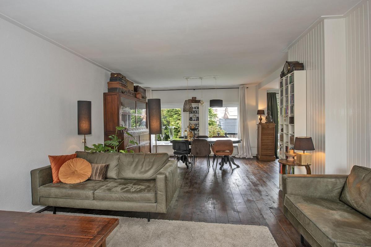 Eerste verdieping: Parkeer je auto op de oprit en kom binnen aan de zijkant van de woning. In het halletje is een garderobe en de trap brengt je naar de eerste verdieping van de maisonnette. Op de overloop vind je het aparte toilet en de badkamer, uitgerust met een douche en een wastafel. De overloop geeft toegang tot het hart van deze woning: de royale woon-eetkamer met open keuken. De ruimte is perfect opgedeeld in een sfeervolle zithoek aan de voorzijde, in het midden bevindt zicht de ruime eethoek en aangrenzend vind je de open keuken met een strak, donker design. De keuken is voorzien van een kookeiland en diverse inbouwapparatuur zoals een gasfornuis, boretti oven, vaatwasser en afzuigkap. Vanuit de keuken heb je toegang tot het knusse balkon, waar je heerlijk van het buitenleven kunt genieten. De donkere houten vloer loopt mooi door over de gehele verdieping, wat zorgt voor eenheid en een warme uitstraling.
