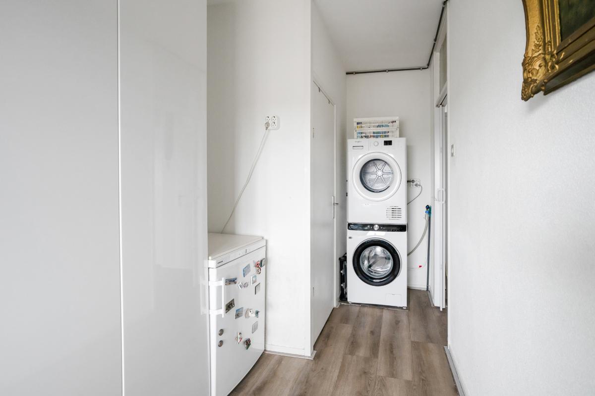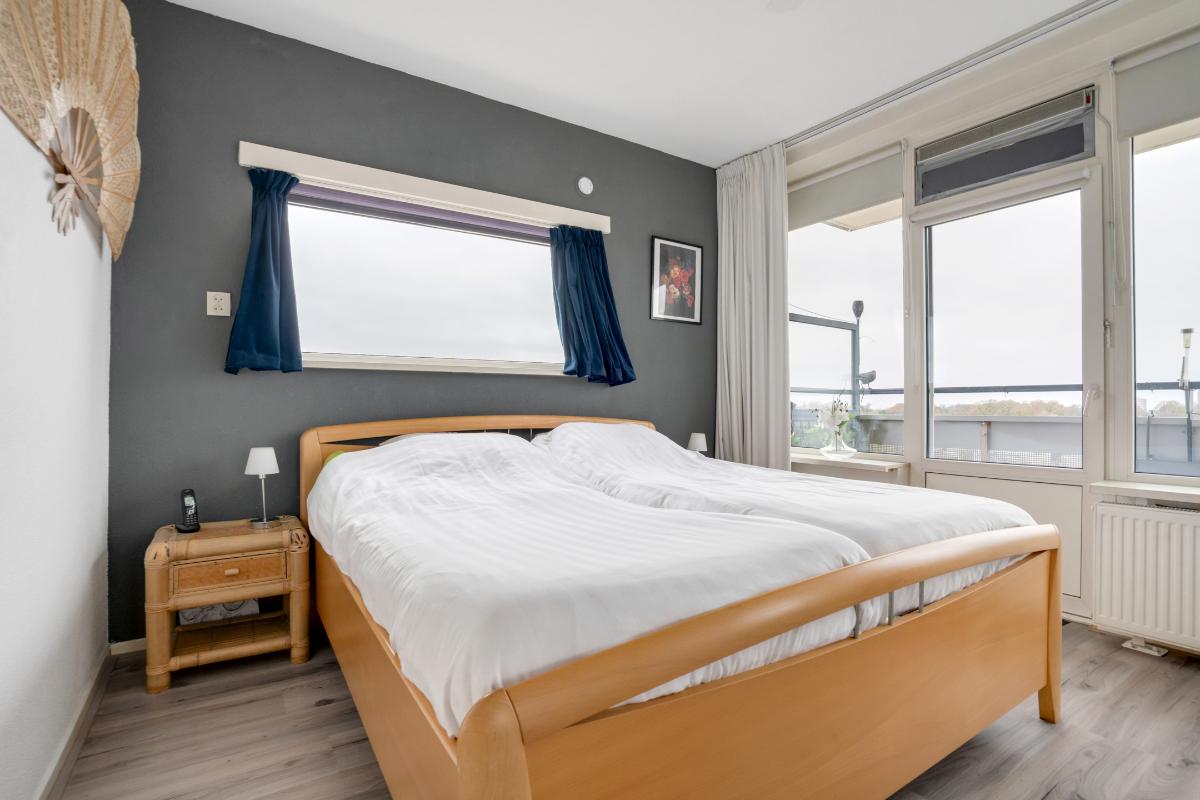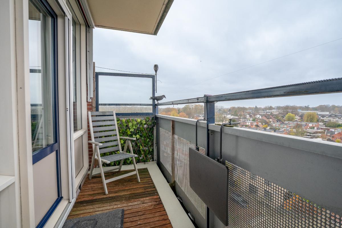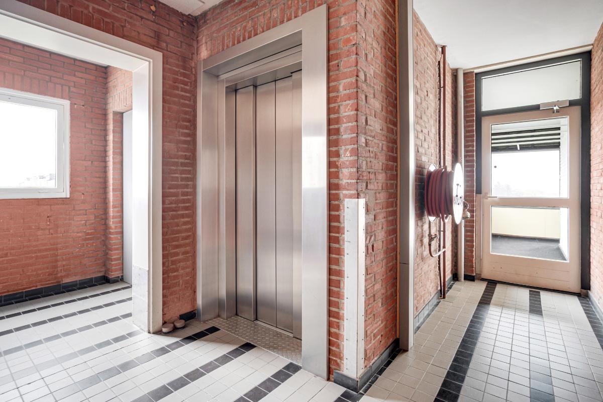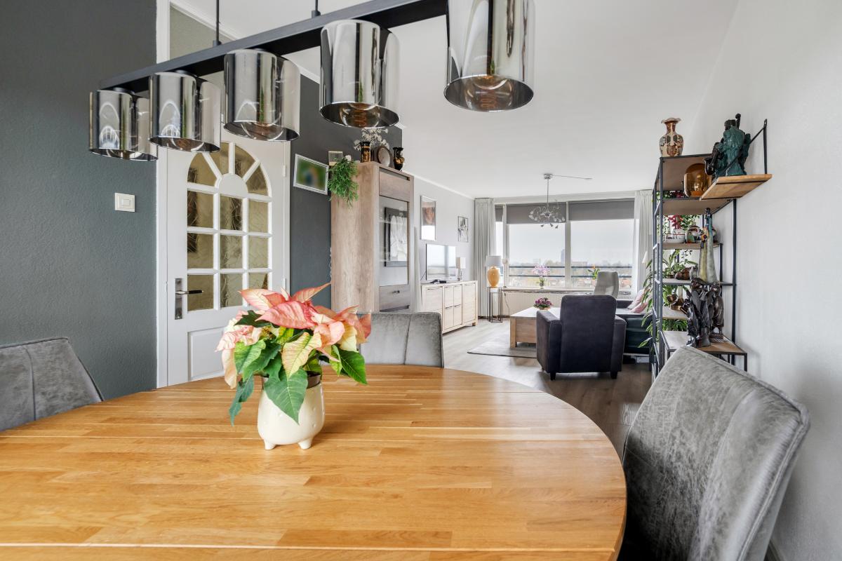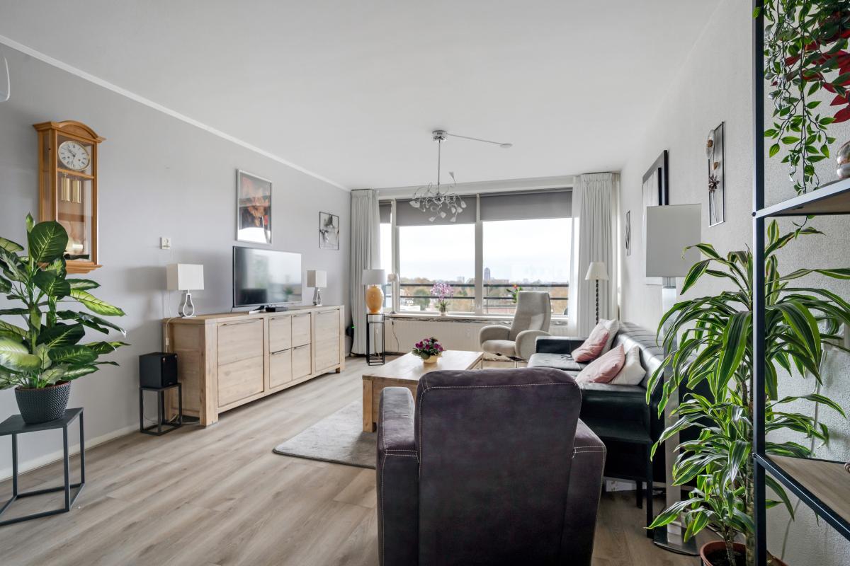 Appartement Bij binnenkomst door de glazen voordeur stap je een lichte entree binnen, waar ruimte is voor de jassen. Hier vind je ook het toilet met fontein en de deuren naar de overige vertrekken. Via twee glazen deuren, waarvan één een prachtige glas-in-lood deur met ronde boog, bereik je de lange woonkamer. Dankzij de ramen aan meerdere zijden voelt deze ruimte heerlijk licht en ruim aan. De lichte pvc-vloer geeft de woonkamer een strakke, warme basis, terwijl de glas-in-looddeur met zijn klassieke boog juist zorgt voor een tijdloos en karaktervol accent. Samen creëren ze een stijlvolle mix van modern en klassiek. De keuken ligt aan de andere zijde van de entree en combineert klassieke charme van lichte deuren met glaspanelen en donkere elementen. Deze keuken heeft volop kastruimte, een inductiekookplaat, ingebouwde koelkast en een ruim werkblad. Het is een praktische en prettige plek om te koken. Doordat de keuken een aparte ruimte is blijven kookgeuren uit de living en oogt alles netjes wanneer de deur dicht is. Het grote aanrechtblad biedt voldoende ruimte voor keukenapparatuur en het bereiden van maaltijden. Naast de keuken ligt een multifunctionele kamer, ideaal als werk-, hobby- of logeerkamer. In deze ruimte bevindt zich tevens de aansluiting voor de wasmachine en een handige opbergkast waarin de geiser zich bevindt. Via de frisse, wit afgewerkte badkamer, voorzien van een inloopdouche en een wastafelmeubel met fontein, kom je in de ruime slaapkamer. Deze kamer voelt extra licht dankzij het grote raam en biedt handige opbergruimte door de ingebouwde kast met spiegeldeuren. De schuifdeur waarmee je de slaapkamer binnenkomt zorgt daarnaast voor optimaal gebruik van de ruimte. Vanuit de slaapkamer bereik je direct het balkon. Dit overdekte balkon, afgewerkt met een houten vlonders, biedt voldoende plek voor twee stoelen. Door de overdekking/overkapping kun je er veel gebruik van maken, want je zit er heerlijk beschut. Vanaf de zesde etage geniet je hier van een prachtig, vrij uitzicht over de wijk, een heerlijke plek dus om de dag te beginnen of juist af te sluiten.