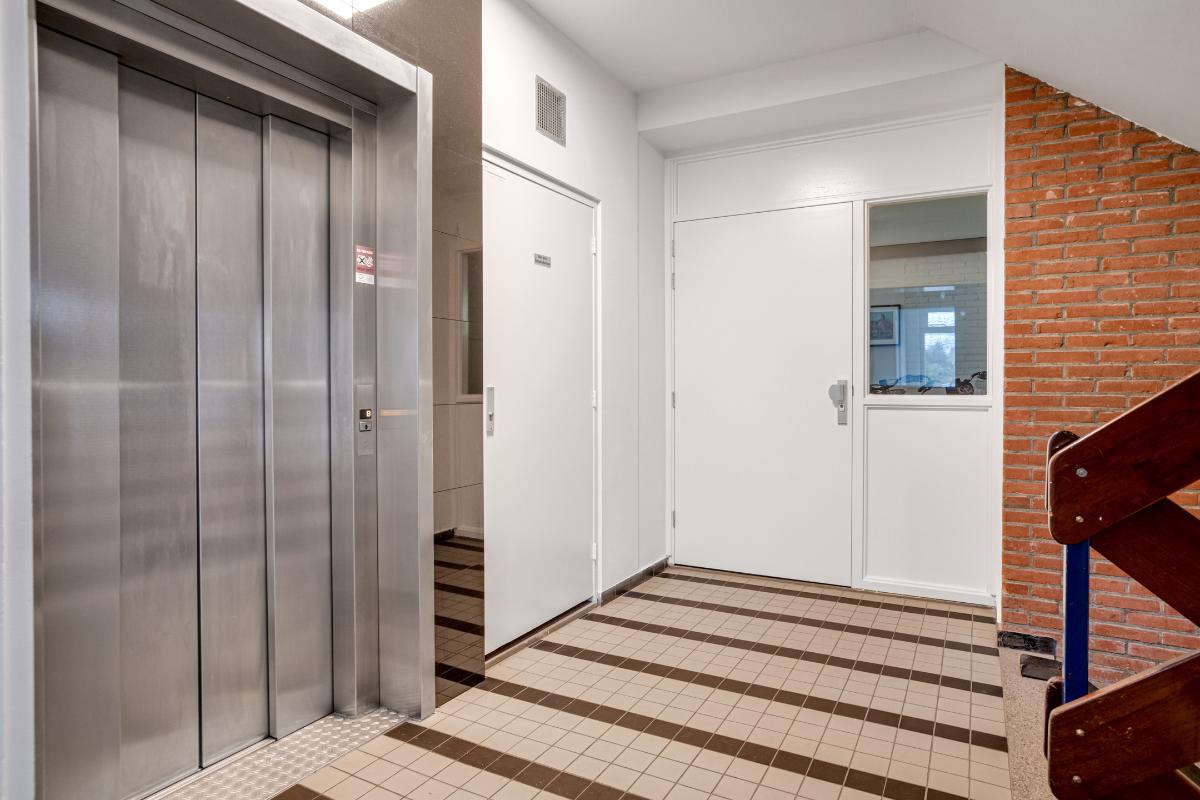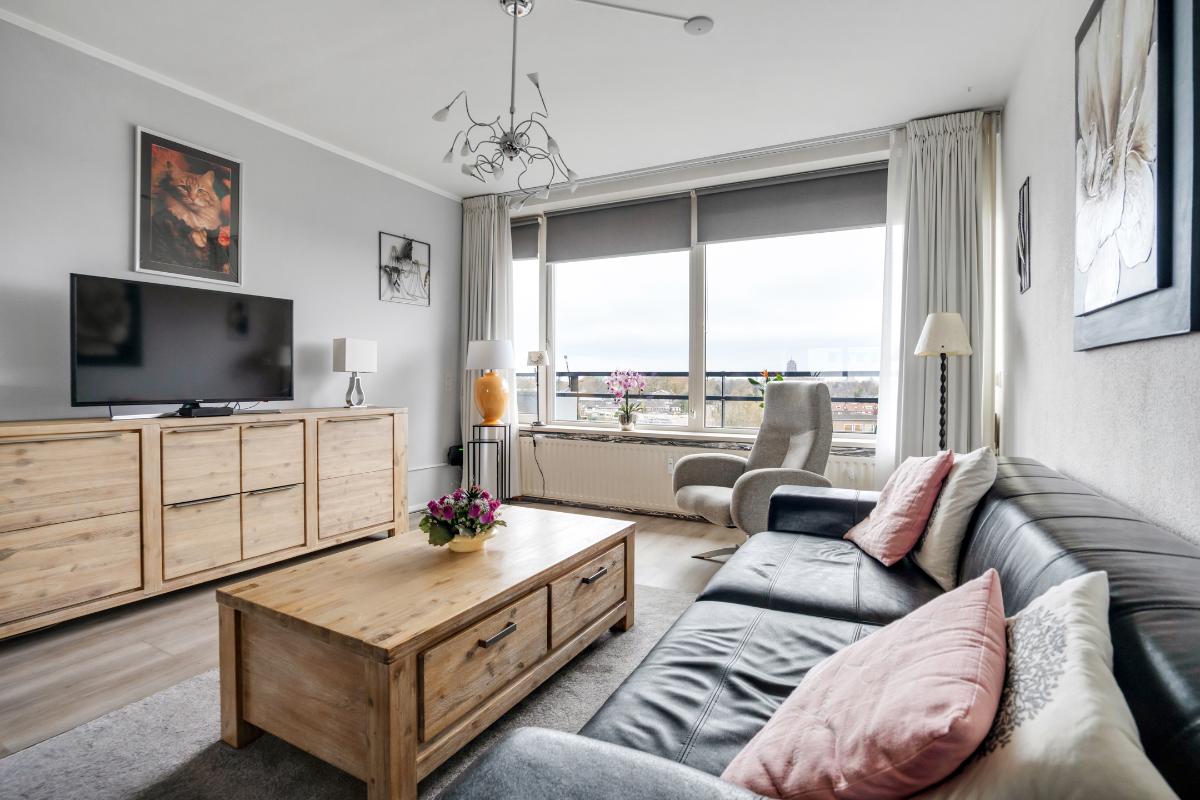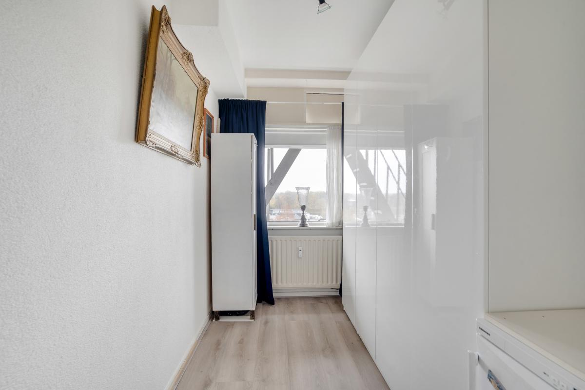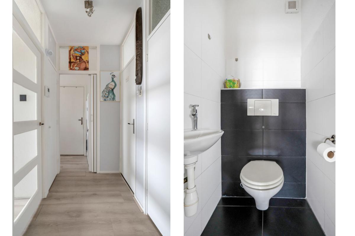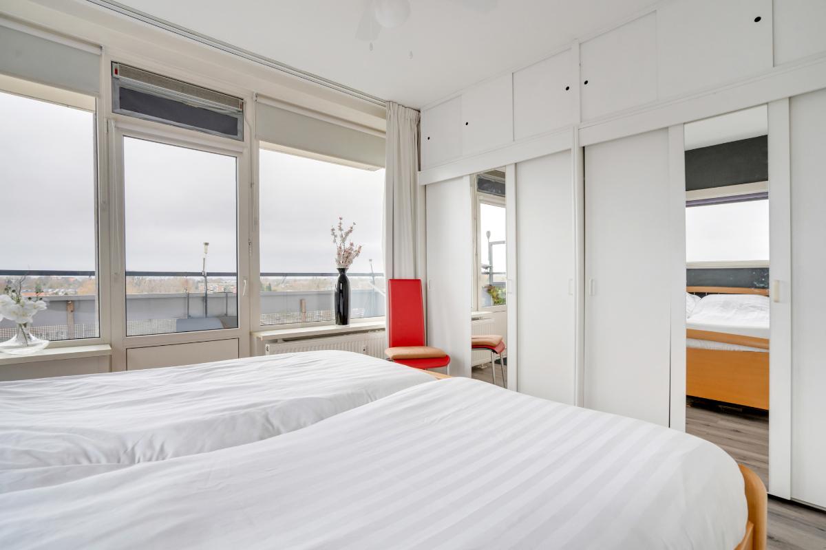 Appartement Bij binnenkomst door de glazen voordeur stap je een lichte entree binnen, waar ruimte is voor de jassen. Hier vind je ook het toilet met fontein en de deuren naar de overige vertrekken. Via twee glazen deuren, waarvan één een prachtige glas-in-lood deur met ronde boog, bereik je de lange woonkamer. Dankzij de ramen aan meerdere zijden voelt deze ruimte heerlijk licht en ruim aan. De lichte pvc-vloer geeft de woonkamer een strakke, warme basis, terwijl de glas-in-looddeur met zijn klassieke boog juist zorgt voor een tijdloos en karaktervol accent. Samen creëren ze een stijlvolle mix van modern en klassiek. De keuken ligt aan de andere zijde van de entree en combineert klassieke charme van lichte deuren met glaspanelen en donkere elementen. Deze keuken heeft volop kastruimte, een inductiekookplaat, ingebouwde koelkast en een ruim werkblad. Het is een praktische en prettige plek om te koken. Doordat de keuken een aparte ruimte is blijven kookgeuren uit de living en oogt alles netjes wanneer de deur dicht is. Het grote aanrechtblad biedt voldoende ruimte voor keukenapparatuur en het bereiden van maaltijden. Naast de keuken ligt een multifunctionele kamer, ideaal als werk-, hobby- of logeerkamer. In deze ruimte bevindt zich tevens de aansluiting voor de wasmachine en een handige opbergkast waarin de geiser zich bevindt. Via de frisse, wit afgewerkte badkamer, voorzien van een inloopdouche en een wastafelmeubel met fontein, kom je in de ruime slaapkamer. Deze kamer voelt extra licht dankzij het grote raam en biedt handige opbergruimte door de ingebouwde kast met spiegeldeuren. De schuifdeur waarmee je de slaapkamer binnenkomt zorgt daarnaast voor optimaal gebruik van de ruimte. Vanuit de slaapkamer bereik je direct het balkon. Dit overdekte balkon, afgewerkt met een houten vlonders, biedt voldoende plek voor twee stoelen. Door de overdekking/overkapping kun je er veel gebruik van maken, want je zit er heerlijk beschut. Vanaf de zesde etage geniet je hier van een prachtig, vrij uitzicht over de wijk, een heerlijke plek dus om de dag te beginnen of juist af te sluiten.