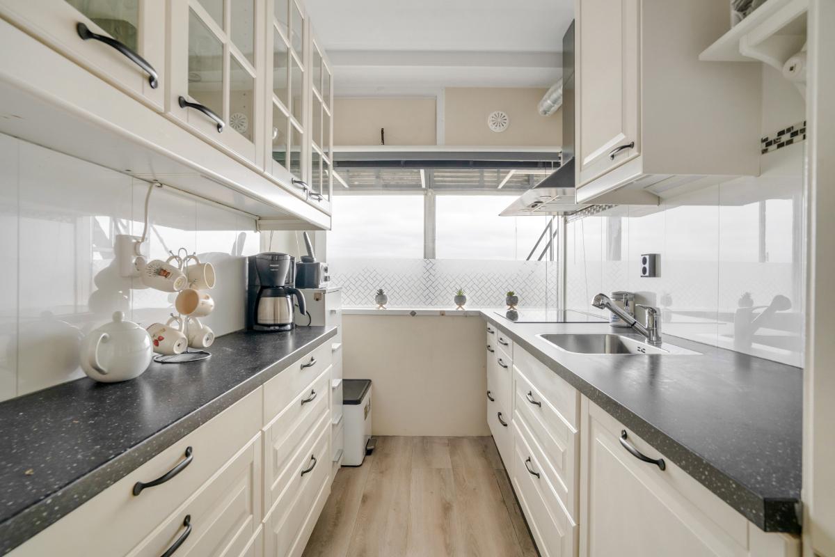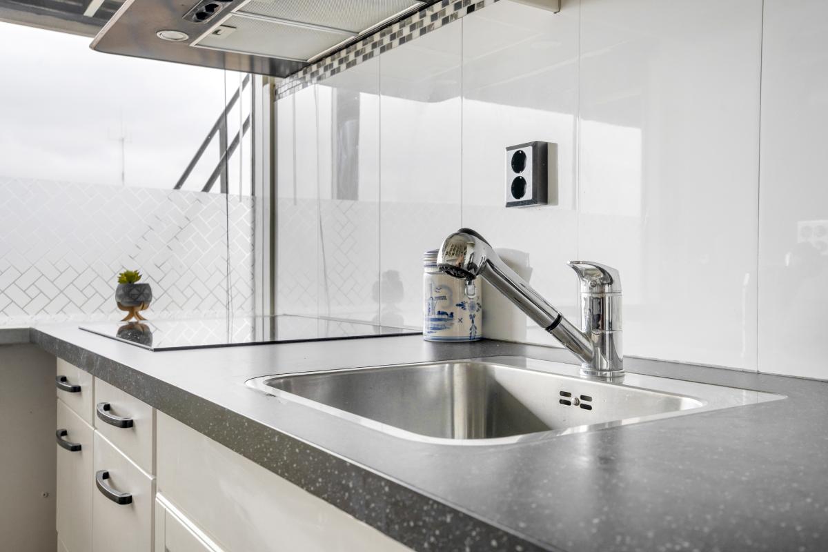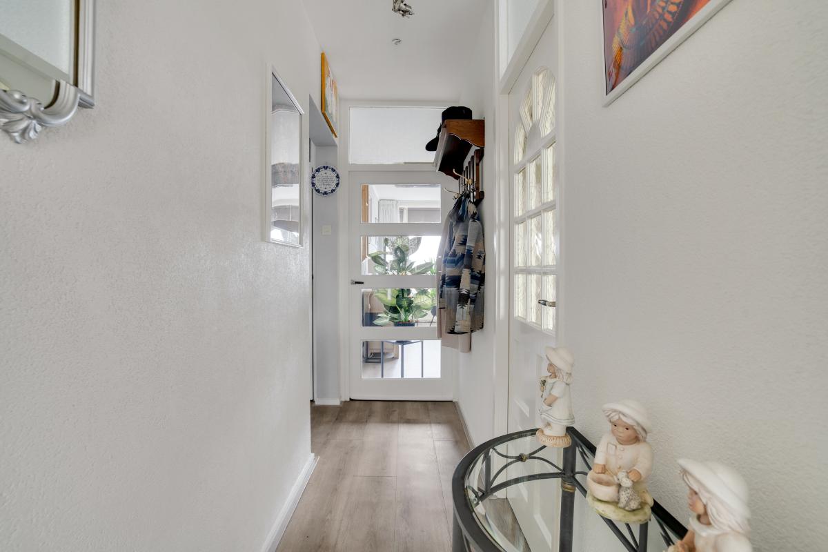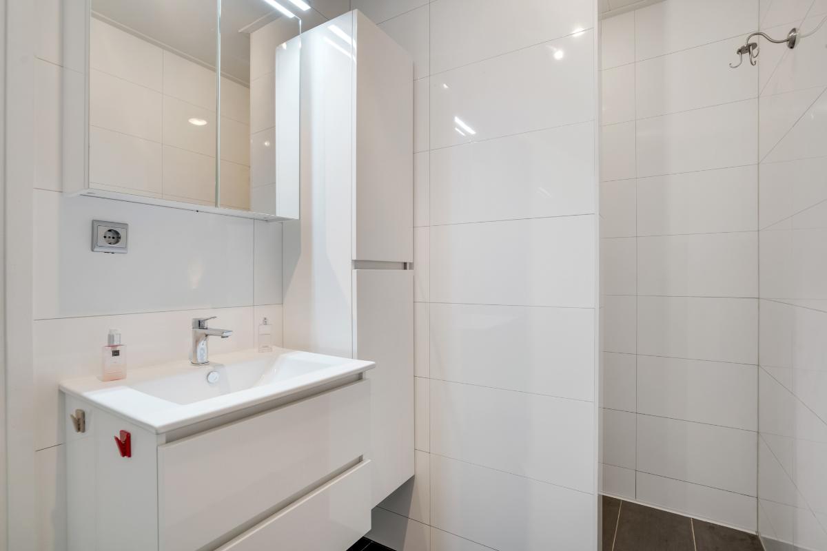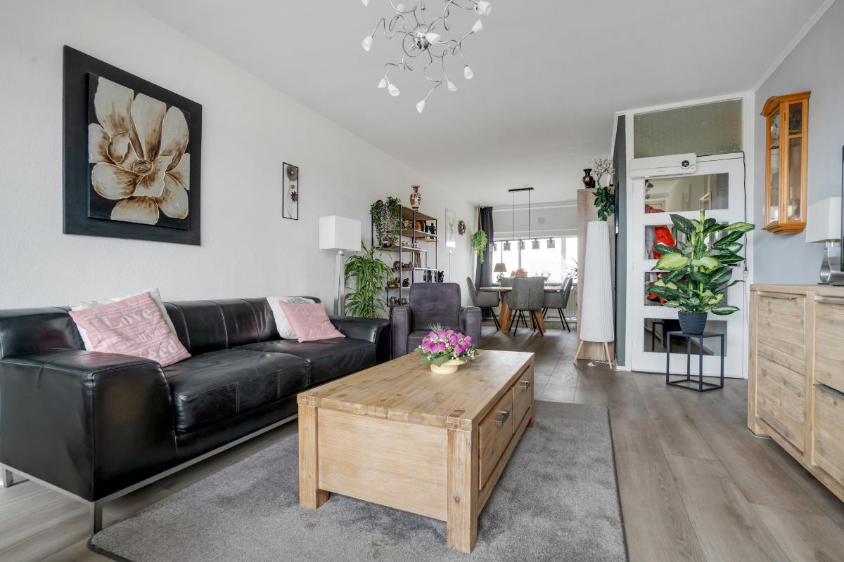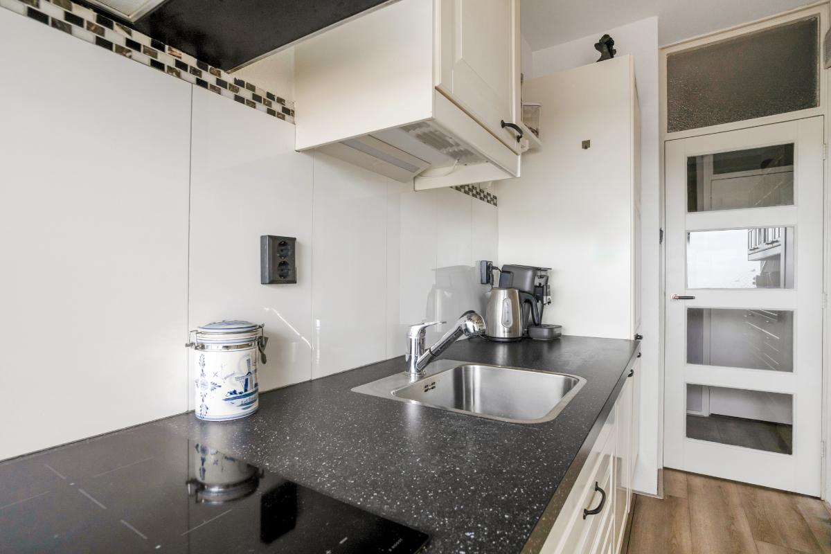 Appartement Bij binnenkomst door de glazen voordeur stap je een lichte entree binnen, waar ruimte is voor de jassen. Hier vind je ook het toilet met fontein en de deuren naar de overige vertrekken. Via twee glazen deuren, waarvan één een prachtige glas-in-lood deur met ronde boog, bereik je de lange woonkamer. Dankzij de ramen aan meerdere zijden voelt deze ruimte heerlijk licht en ruim aan. De lichte pvc-vloer geeft de woonkamer een strakke, warme basis, terwijl de glas-in-looddeur met zijn klassieke boog juist zorgt voor een tijdloos en karaktervol accent. Samen creëren ze een stijlvolle mix van modern en klassiek. De keuken ligt aan de andere zijde van de entree en combineert klassieke charme van lichte deuren met glaspanelen en donkere elementen. Deze keuken heeft volop kastruimte, een inductiekookplaat, ingebouwde koelkast en een ruim werkblad. Het is een praktische en prettige plek om te koken. Doordat de keuken een aparte ruimte is blijven kookgeuren uit de living en oogt alles netjes wanneer de deur dicht is. Het grote aanrechtblad biedt voldoende ruimte voor keukenapparatuur en het bereiden van maaltijden. Naast de keuken ligt een multifunctionele kamer, ideaal als werk-, hobby- of logeerkamer. In deze ruimte bevindt zich tevens de aansluiting voor de wasmachine en een handige opbergkast waarin de geiser zich bevindt. Via de frisse, wit afgewerkte badkamer, voorzien van een inloopdouche en een wastafelmeubel met fontein, kom je in de ruime slaapkamer. Deze kamer voelt extra licht dankzij het grote raam en biedt handige opbergruimte door de ingebouwde kast met spiegeldeuren. De schuifdeur waarmee je de slaapkamer binnenkomt zorgt daarnaast voor optimaal gebruik van de ruimte. Vanuit de slaapkamer bereik je direct het balkon. Dit overdekte balkon, afgewerkt met een houten vlonders, biedt voldoende plek voor twee stoelen. Door de overdekking/overkapping kun je er veel gebruik van maken, want je zit er heerlijk beschut. Vanaf de zesde etage geniet je hier van een prachtig, vrij uitzicht over de wijk, een heerlijke plek dus om de dag te beginnen of juist af te sluiten.