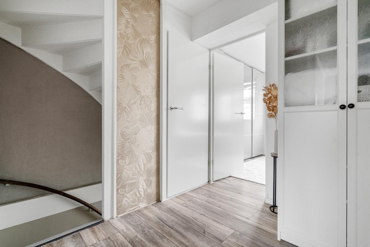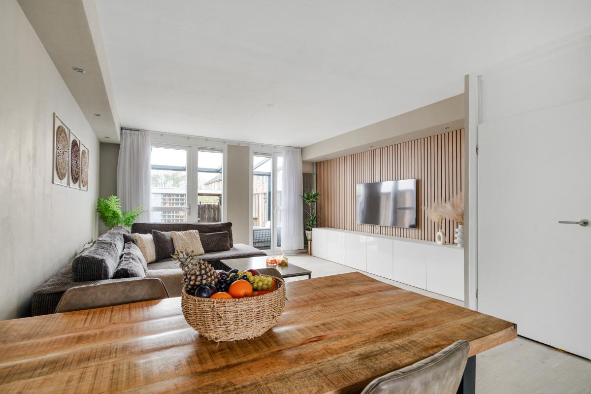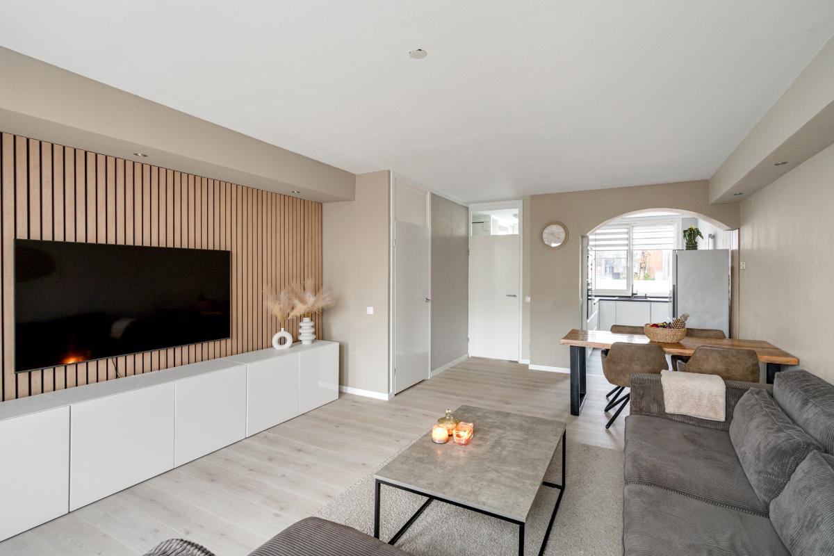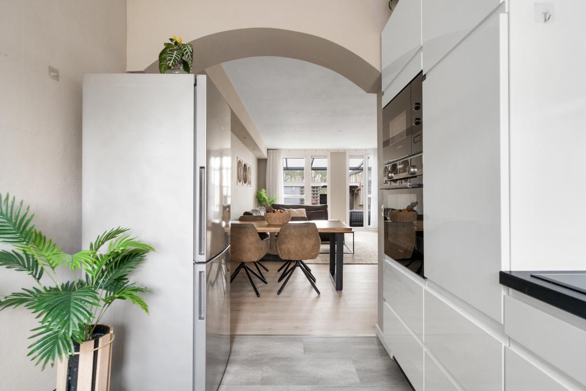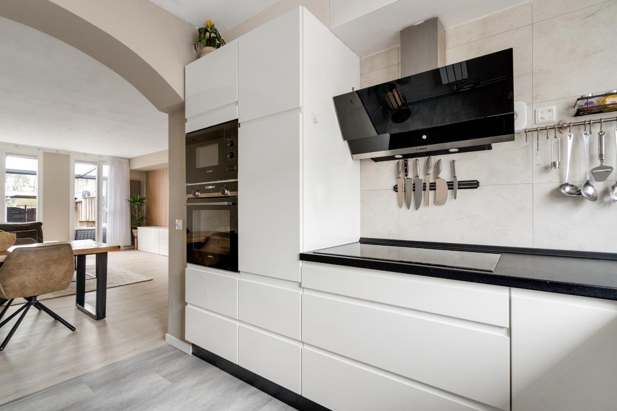 Begane grond: Voor het huis ligt een nette betegelde voortuin met een vriendelijk laag hek, waardoor de woning een open en uitnodigende uitstraling heeft. Bij binnenkomst sta je in de entree, waar je het toilet met fontein, de meterkast en de trap naar boven hebt. Vanuit hier loop je door naar de living. De living voelt direct ruim en modern aan. De lichte vloer vormt een rustige basis en trekt de ruimte mooi door richting de achterzijde. Daar valt je oog meteen op de glazen ramen die van de vloer tot het plafond lopen en uitzicht geven op de tuin met de overkapping. Ook is er een praktische vaste kast, ideaal voor spullen die je uit het zicht wilt opbergen. Langs het plafond loopt een verspringing met ingebouwde spots, wat extra sfeer en karakter aan de woonkamer geeft. Dat karakter komt ook terug in de brede boog die de woonkamer aan de keuken verbindt. Aan de voorzijde van het huis ligt de open L-vormige keuken. Een strakke, tijdloze witte keuken met een zwart werkblad en volop bergruimte in de kasten en lades. Koken doe je hier op de inductiekookplaat, met een oven, magnetron, vaatwasser en afzuigkap tot je beschikking.