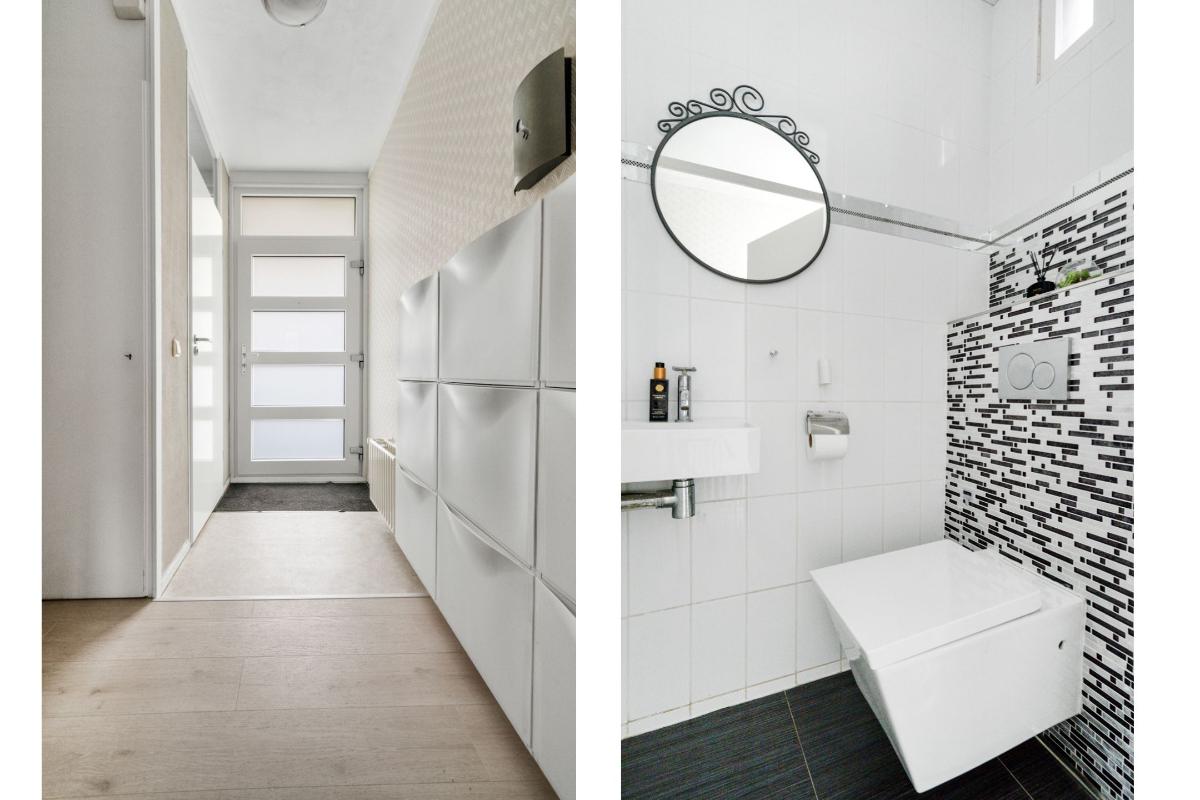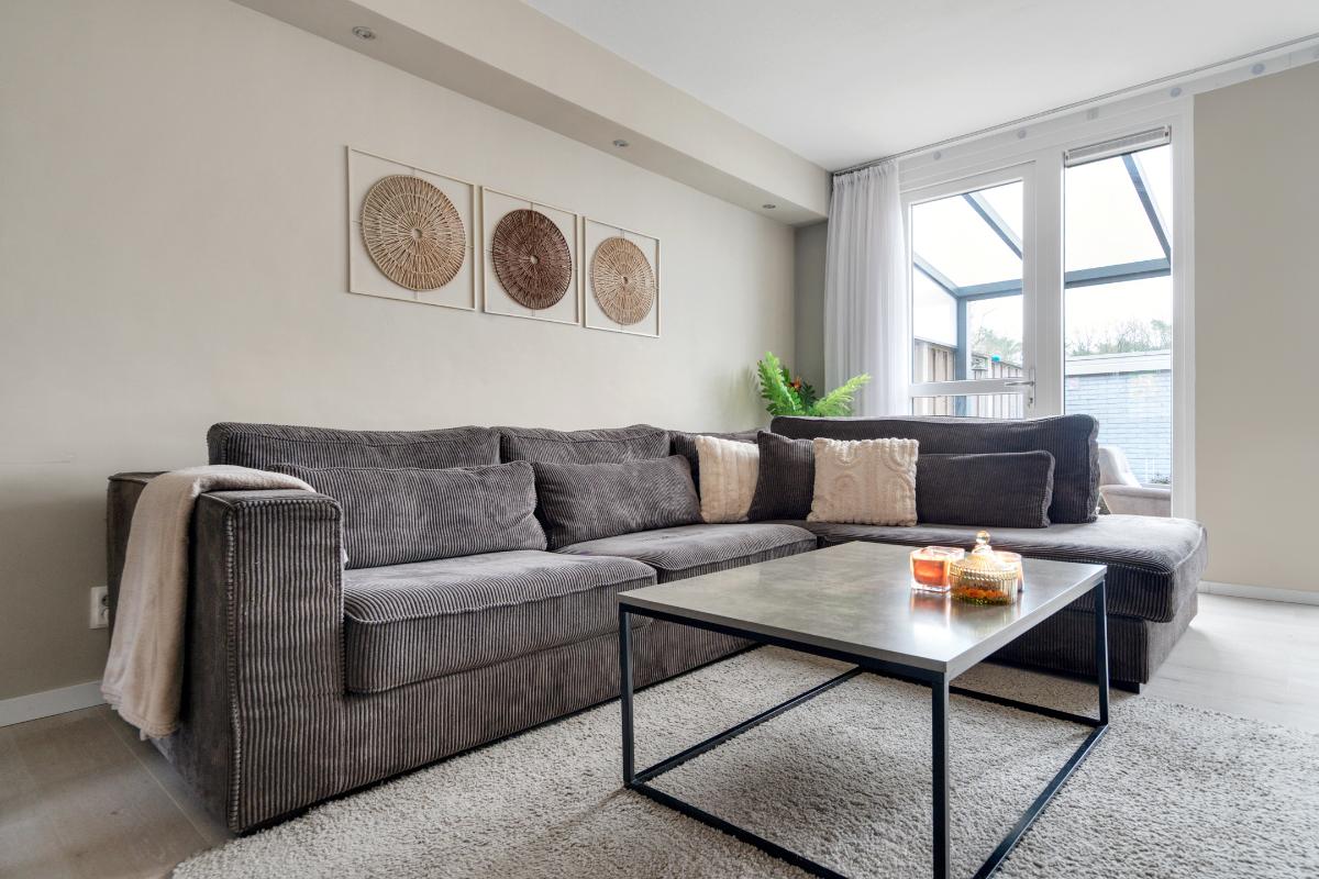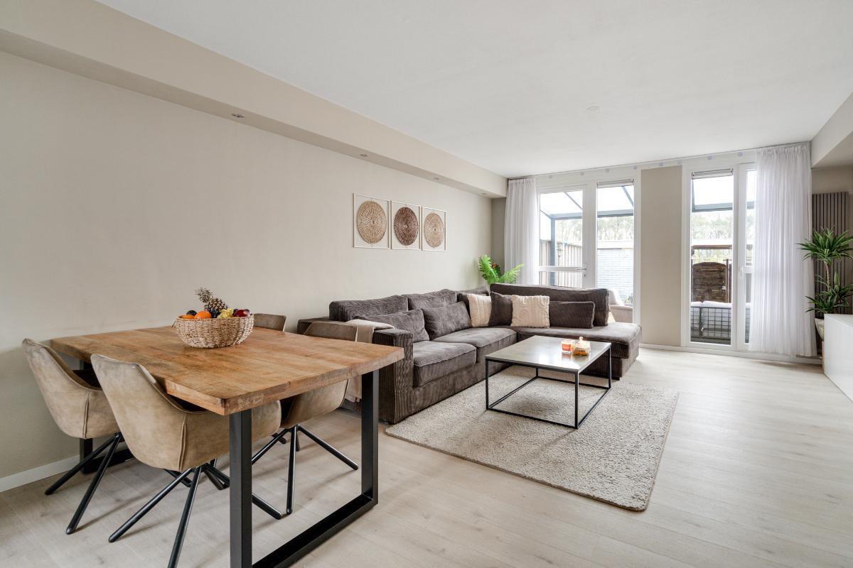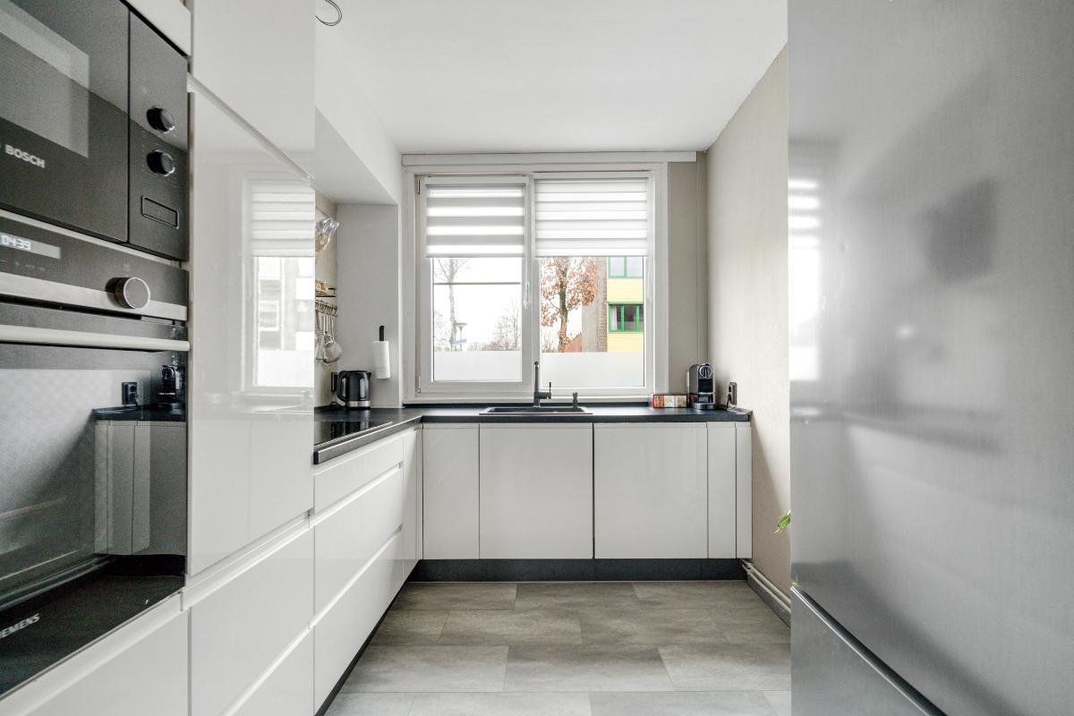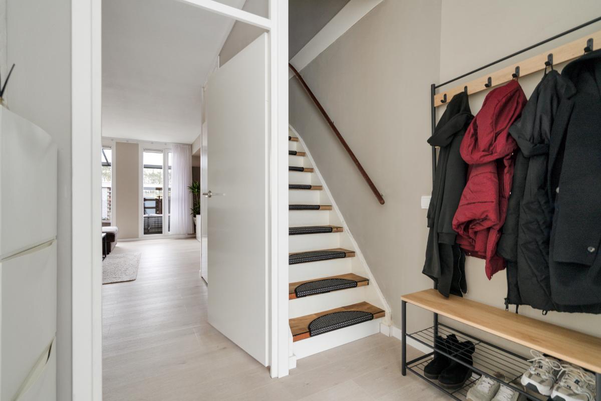 Begane grond: Voor het huis ligt een nette betegelde voortuin met een vriendelijk laag hek, waardoor de woning een open en uitnodigende uitstraling heeft. Bij binnenkomst sta je in de entree, waar je het toilet met fontein, de meterkast en de trap naar boven hebt. Vanuit hier loop je door naar de living. De living voelt direct ruim en modern aan. De lichte vloer vormt een rustige basis en trekt de ruimte mooi door richting de achterzijde. Daar valt je oog meteen op de glazen ramen die van de vloer tot het plafond lopen en uitzicht geven op de tuin met de overkapping. Ook is er een praktische vaste kast, ideaal voor spullen die je uit het zicht wilt opbergen. Langs het plafond loopt een verspringing met ingebouwde spots, wat extra sfeer en karakter aan de woonkamer geeft. Dat karakter komt ook terug in de brede boog die de woonkamer aan de keuken verbindt. Aan de voorzijde van het huis ligt de open L-vormige keuken. Een strakke, tijdloze witte keuken met een zwart werkblad en volop bergruimte in de kasten en lades. Koken doe je hier op de inductiekookplaat, met een oven, magnetron, vaatwasser en afzuigkap tot je beschikking.