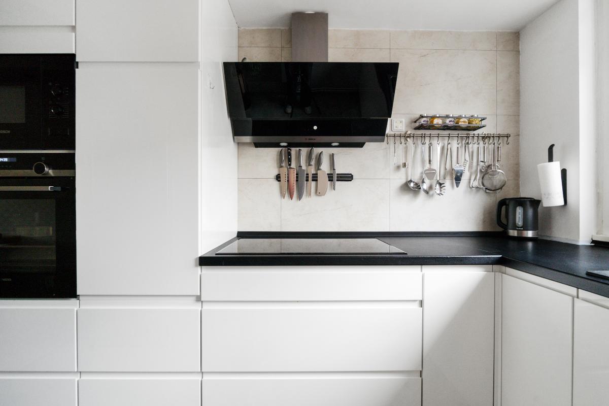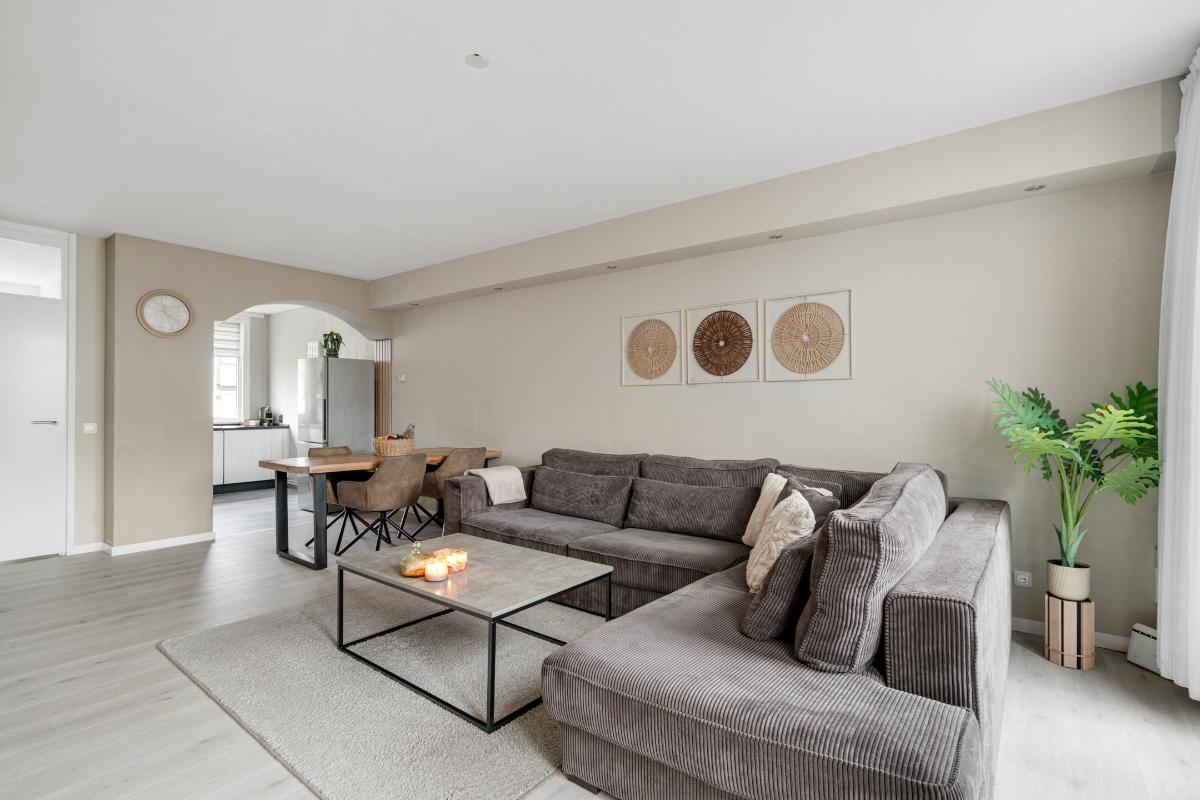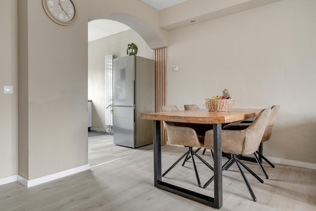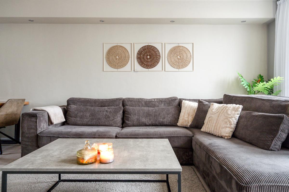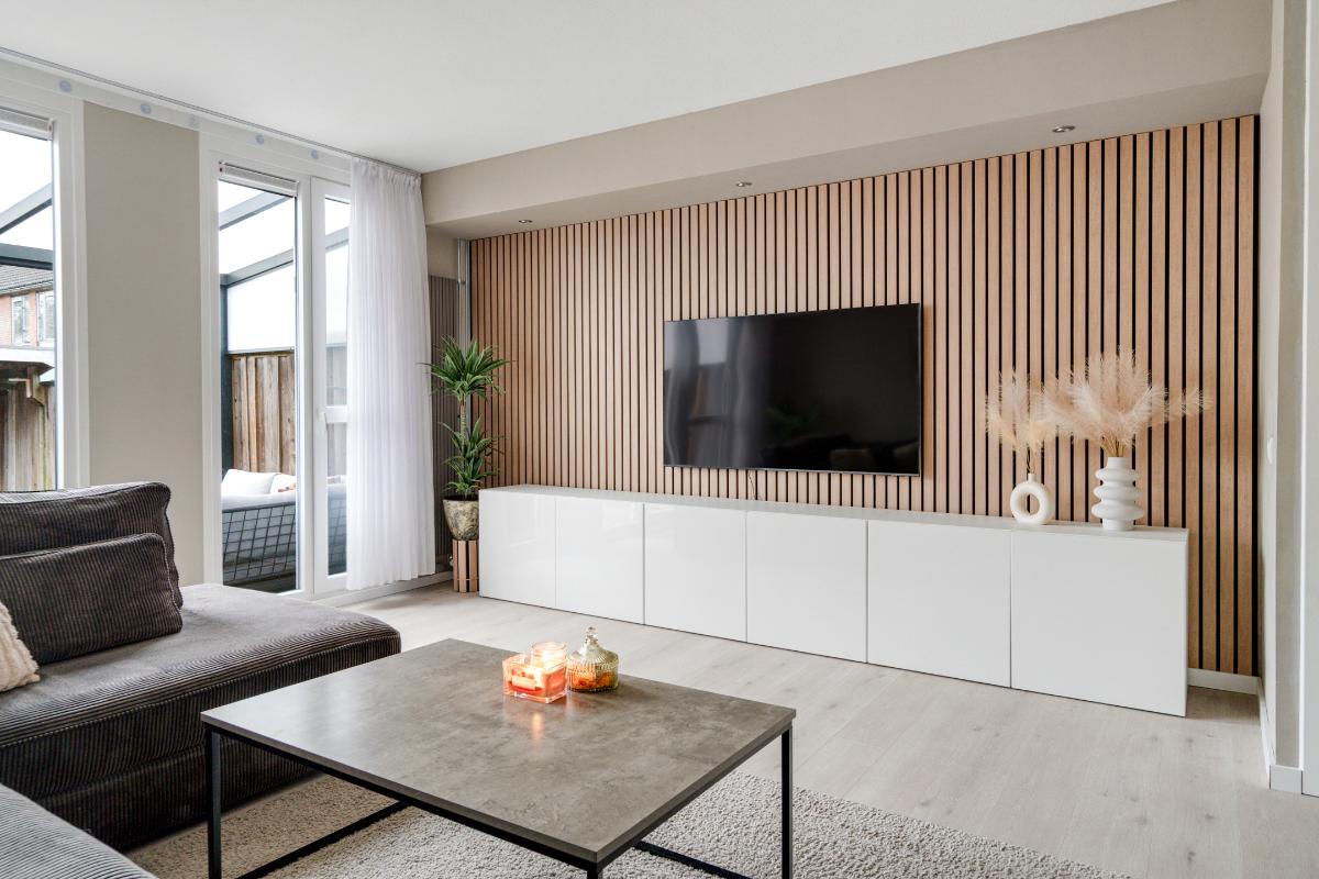 Begane grond: Voor het huis ligt een nette betegelde voortuin met een vriendelijk laag hek, waardoor de woning een open en uitnodigende uitstraling heeft. Bij binnenkomst sta je in de entree, waar je het toilet met fontein, de meterkast en de trap naar boven hebt. Vanuit hier loop je door naar de living. De living voelt direct ruim en modern aan. De lichte vloer vormt een rustige basis en trekt de ruimte mooi door richting de achterzijde. Daar valt je oog meteen op de glazen ramen die van de vloer tot het plafond lopen en uitzicht geven op de tuin met de overkapping. Ook is er een praktische vaste kast, ideaal voor spullen die je uit het zicht wilt opbergen. Langs het plafond loopt een verspringing met ingebouwde spots, wat extra sfeer en karakter aan de woonkamer geeft. Dat karakter komt ook terug in de brede boog die de woonkamer aan de keuken verbindt. Aan de voorzijde van het huis ligt de open L-vormige keuken. Een strakke, tijdloze witte keuken met een zwart werkblad en volop bergruimte in de kasten en lades. Koken doe je hier op de inductiekookplaat, met een oven, magnetron, vaatwasser en afzuigkap tot je beschikking.