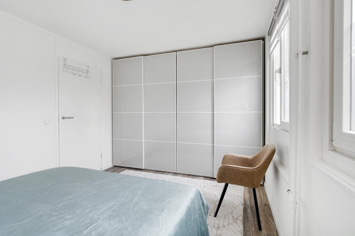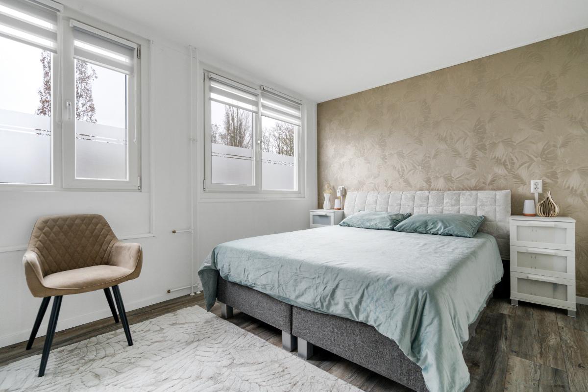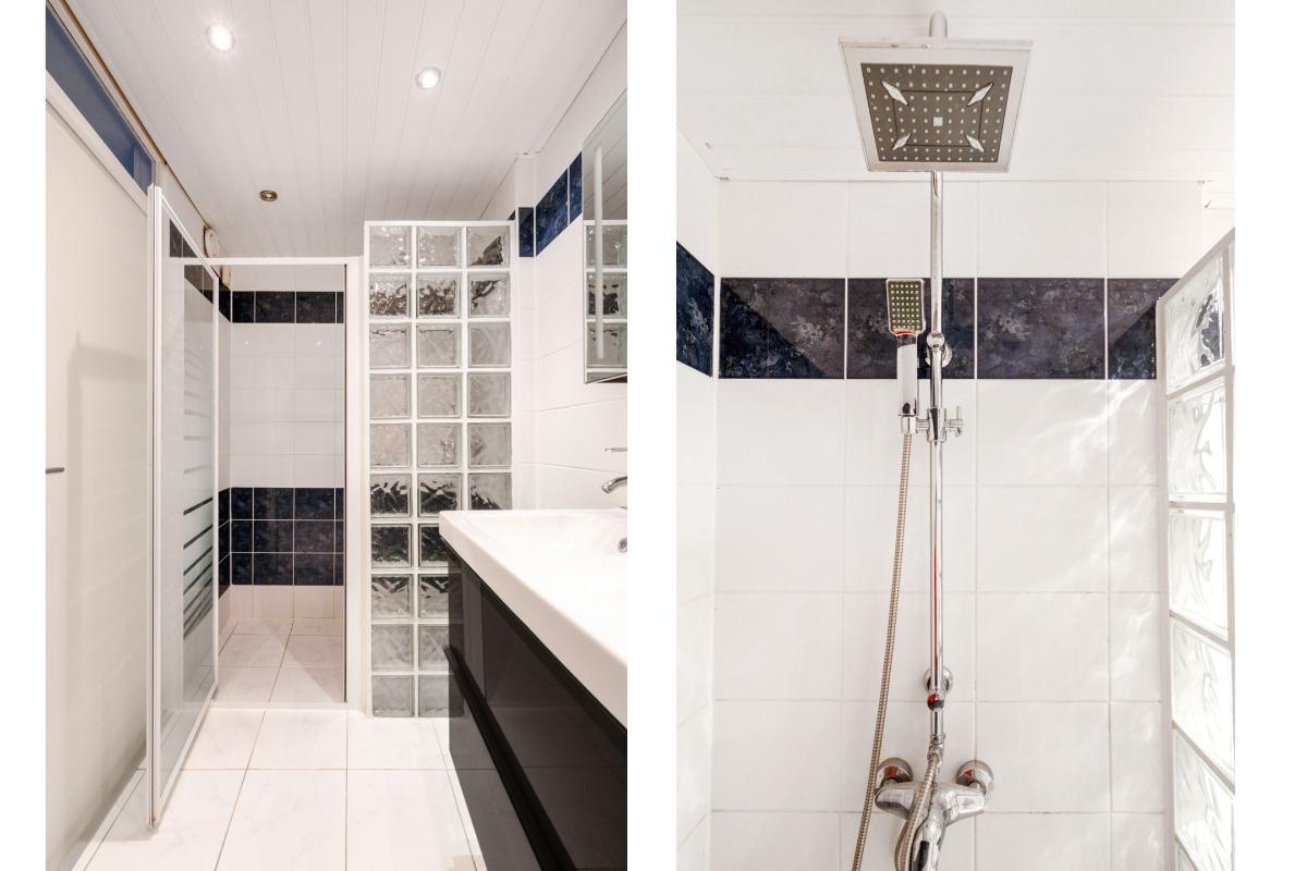 1e verdieping: Op de eerste verdieping kom je uit op een ruime overloop, met daarnaast een vaste kast voor eventueel linnengoed, schoonmaakspullen of extra bergruimte. Vanaf de overloop zijn alle kamers overzichtelijk te bereiken. Aan de voorzijde ligt de grote slaapkamer. Deze kamer beschikt over veel raam en een vaste kast, waardoor je kleding en schoenen netjes kunt opbergen. Het is een slaapkamer waar je met gemak een groot bed kwijt kunt en nog genoeg ruimte overhoudt om vrij te bewegen. Aan de achterzijde liggen nog twee slaapkamers. Ideaal als slaap-, werk- of hobbykamer, maar ook te gebruiken als een inloopkast. Door de rechte wanden zijn de kamers goed in te delen en haal je overal het maximale uit de ruimte. Tussen de kamers in ligt de badkamer. Hier vind je een modern wasmeubel met twee wasbakken, lades en spiegels met daarachter extra opbergruimte. Fijn om alles wat je in de badkamer nodig hebt goed op te kunnen bergen. De glazen inloopdouche is uitgerust met een regendouche en handdouche. De douche heeft een glazen deur en een wand van glazen stenen. Een detail dat terugkomt en weer helemaal van nu is, omdat het licht doorlaat, karakter geeft en voor afscherming zorgt.