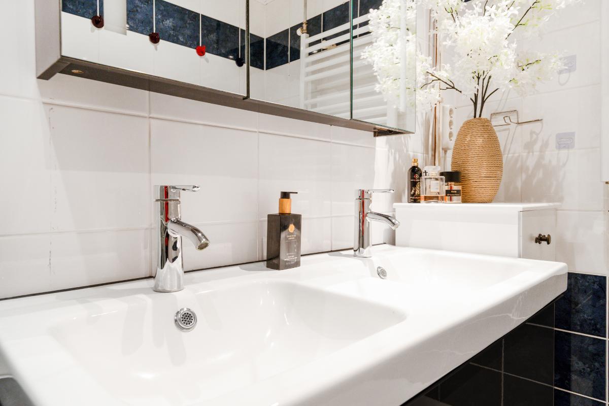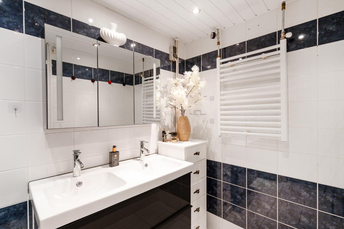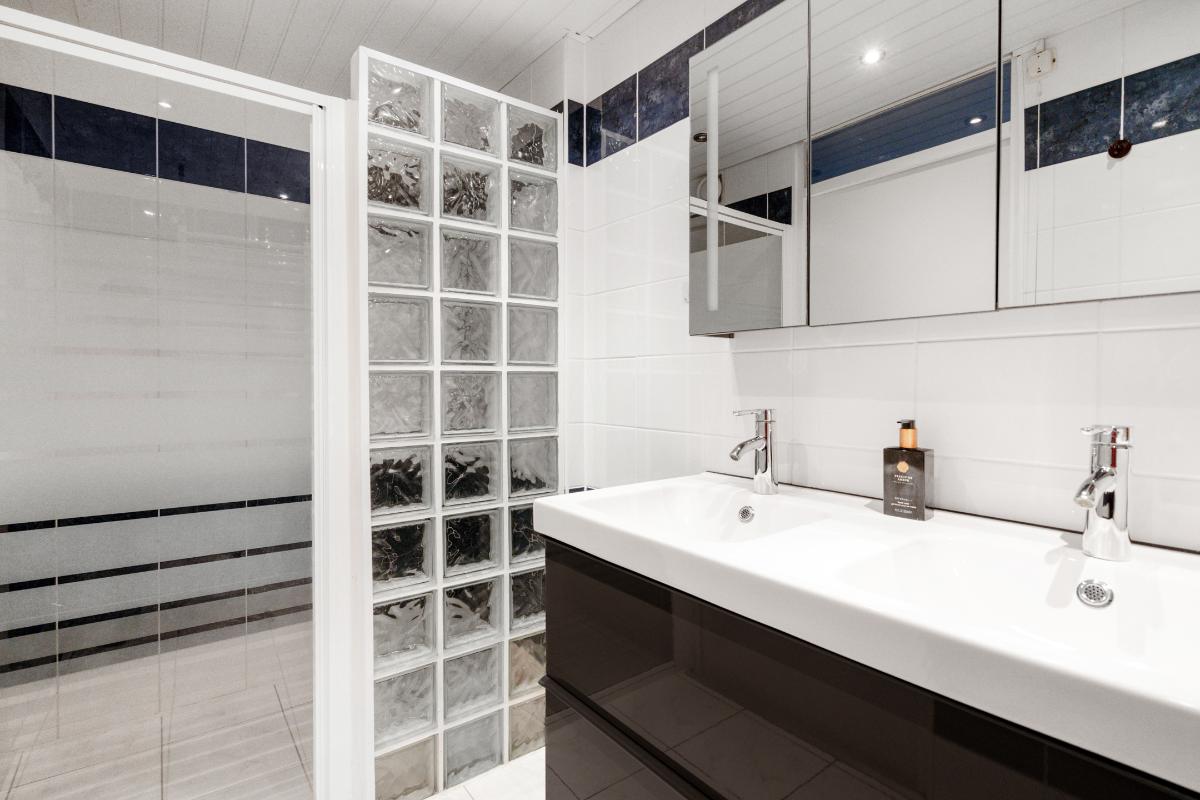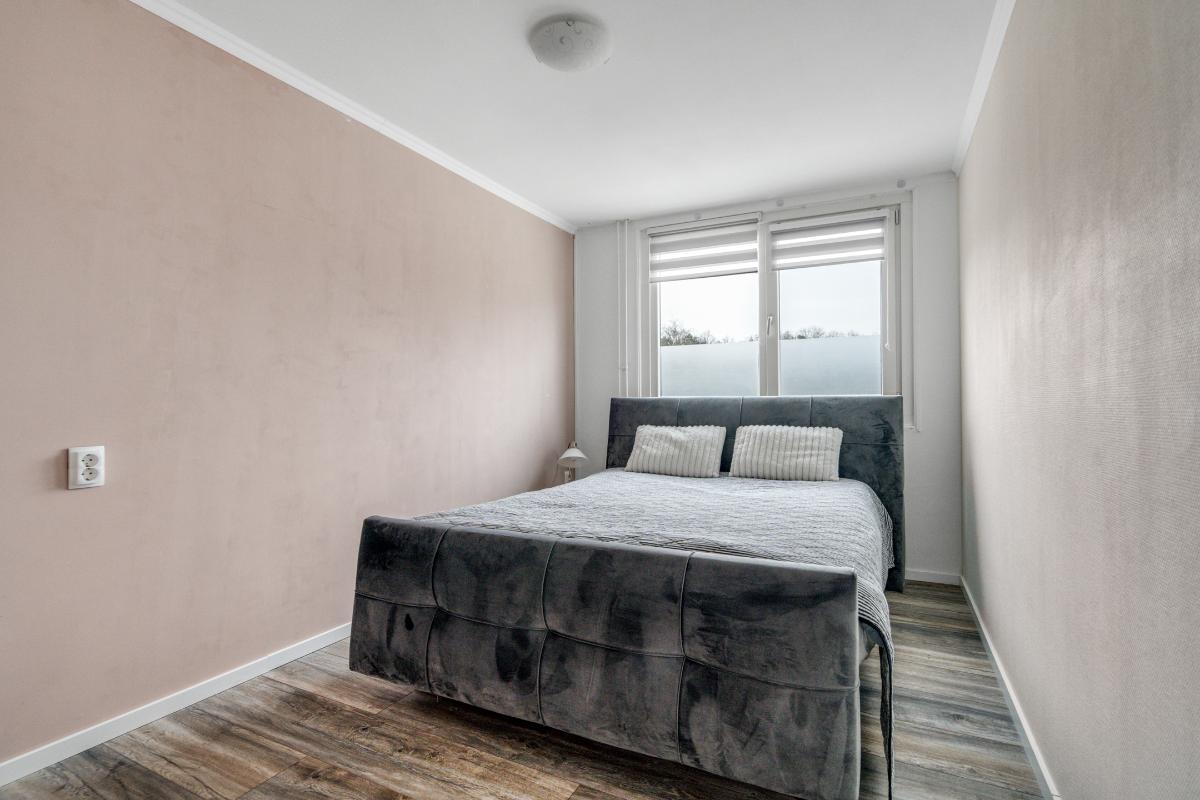 1e verdieping: Op de eerste verdieping kom je uit op een ruime overloop, met daarnaast een vaste kast voor eventueel linnengoed, schoonmaakspullen of extra bergruimte. Vanaf de overloop zijn alle kamers overzichtelijk te bereiken. Aan de voorzijde ligt de grote slaapkamer. Deze kamer beschikt over veel raam en een vaste kast, waardoor je kleding en schoenen netjes kunt opbergen. Het is een slaapkamer waar je met gemak een groot bed kwijt kunt en nog genoeg ruimte overhoudt om vrij te bewegen. Aan de achterzijde liggen nog twee slaapkamers. Ideaal als slaap-, werk- of hobbykamer, maar ook te gebruiken als een inloopkast. Door de rechte wanden zijn de kamers goed in te delen en haal je overal het maximale uit de ruimte. Tussen de kamers in ligt de badkamer. Hier vind je een modern wasmeubel met twee wasbakken, lades en spiegels met daarachter extra opbergruimte. Fijn om alles wat je in de badkamer nodig hebt goed op te kunnen bergen. De glazen inloopdouche is uitgerust met een regendouche en handdouche. De douche heeft een glazen deur en een wand van glazen stenen. Een detail dat terugkomt en weer helemaal van nu is, omdat het licht doorlaat, karakter geeft en voor afscherming zorgt.