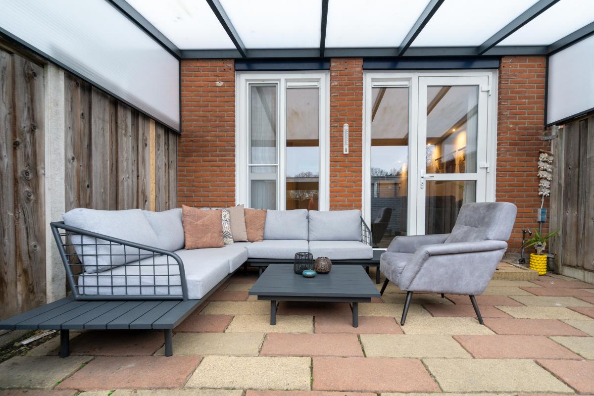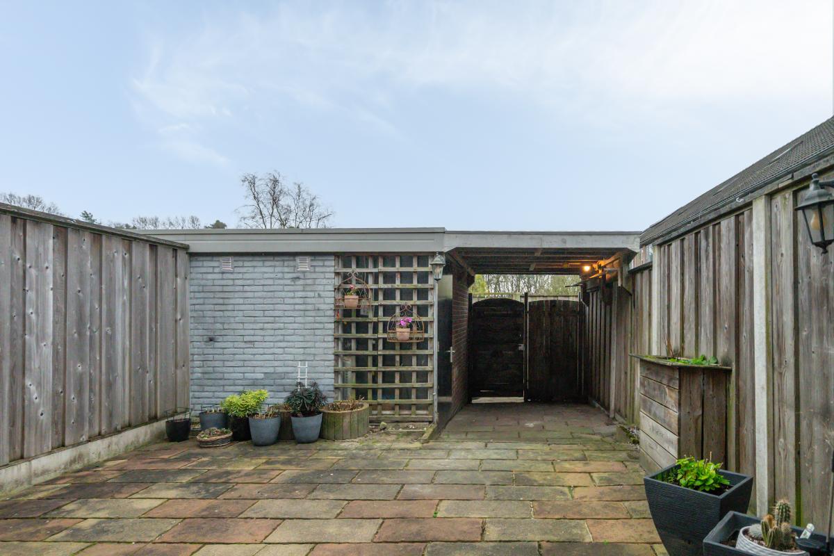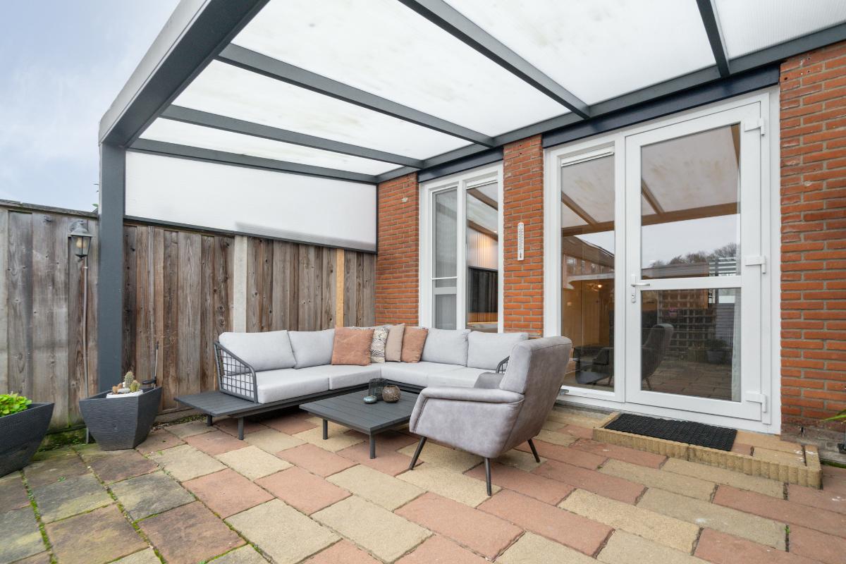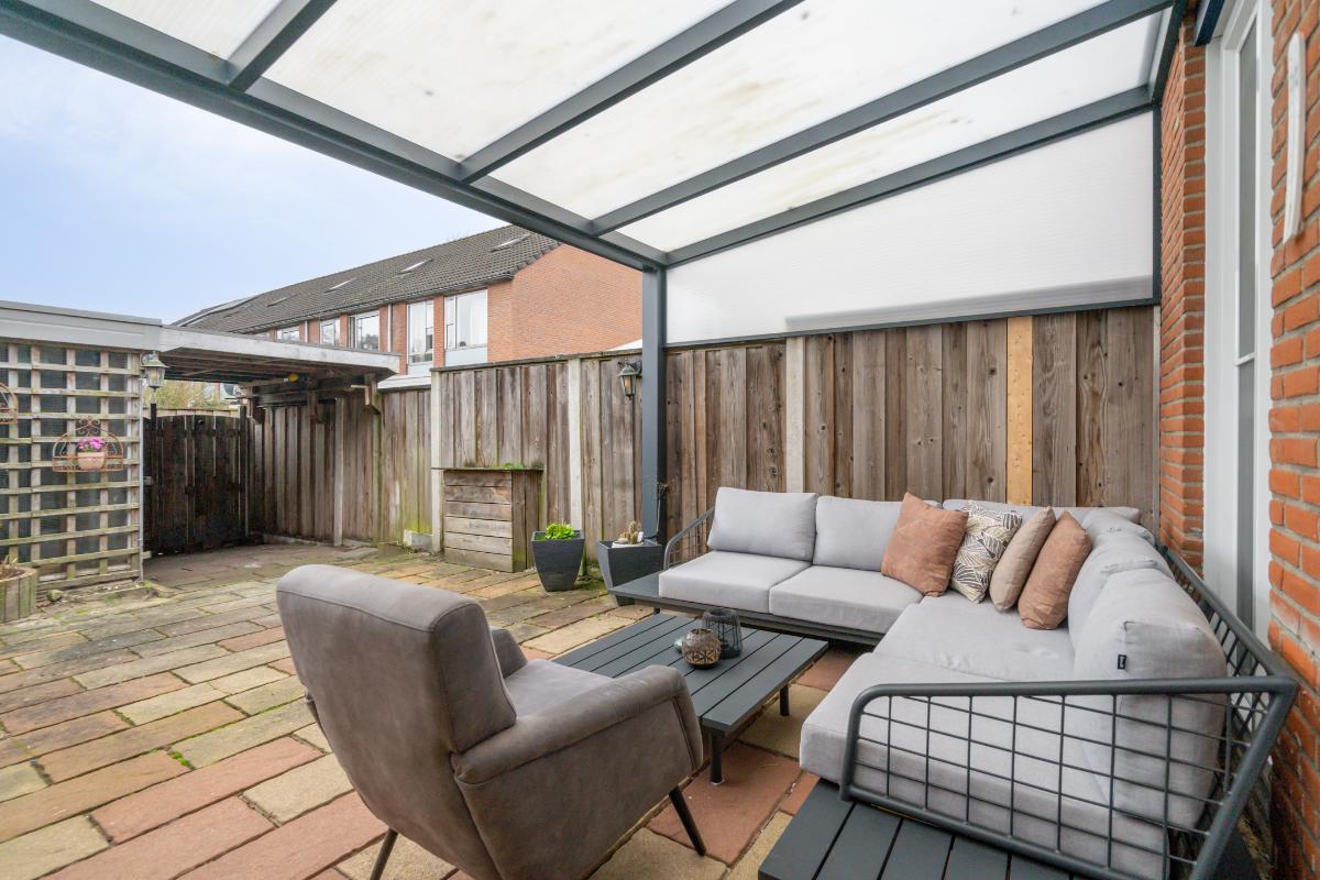 Tuin: Achter de woning ligt een strakke, onderhoudsvriendelijke tuin die volledig is betegeld met lange, natuurlijke stenen. Direct aan de woonkamer is de overkapping. Hier is voldoende ruimte voor een comfortabele tuinset en kan je het hele jaar door droog buiten zitten. Achterin de tuin staat een praktische schuur met nog een extra overkapping. Erg handig voor het opbergen van tuinartikelen, seizoenspullen of het stallen van fietsen. Via de poort aan de achterzijde kom je namelijk zo met je fiets de achtertuin in.
