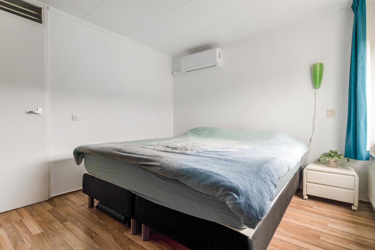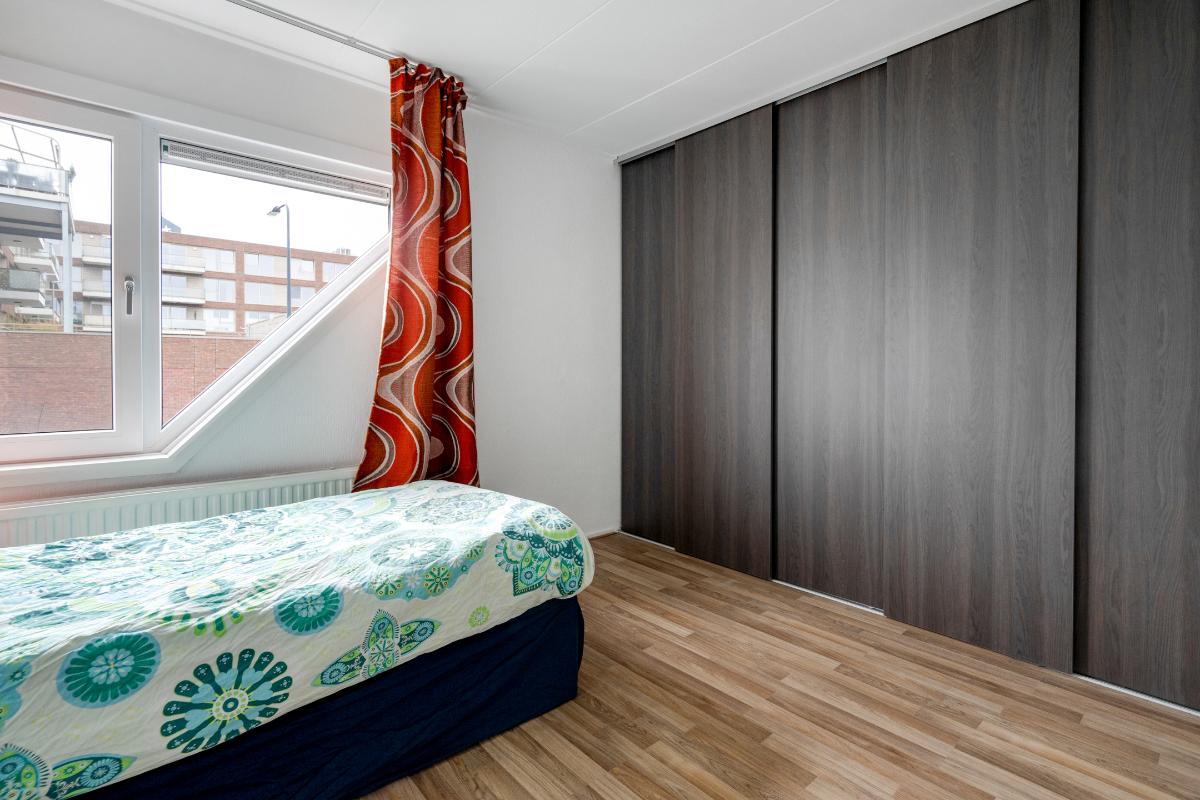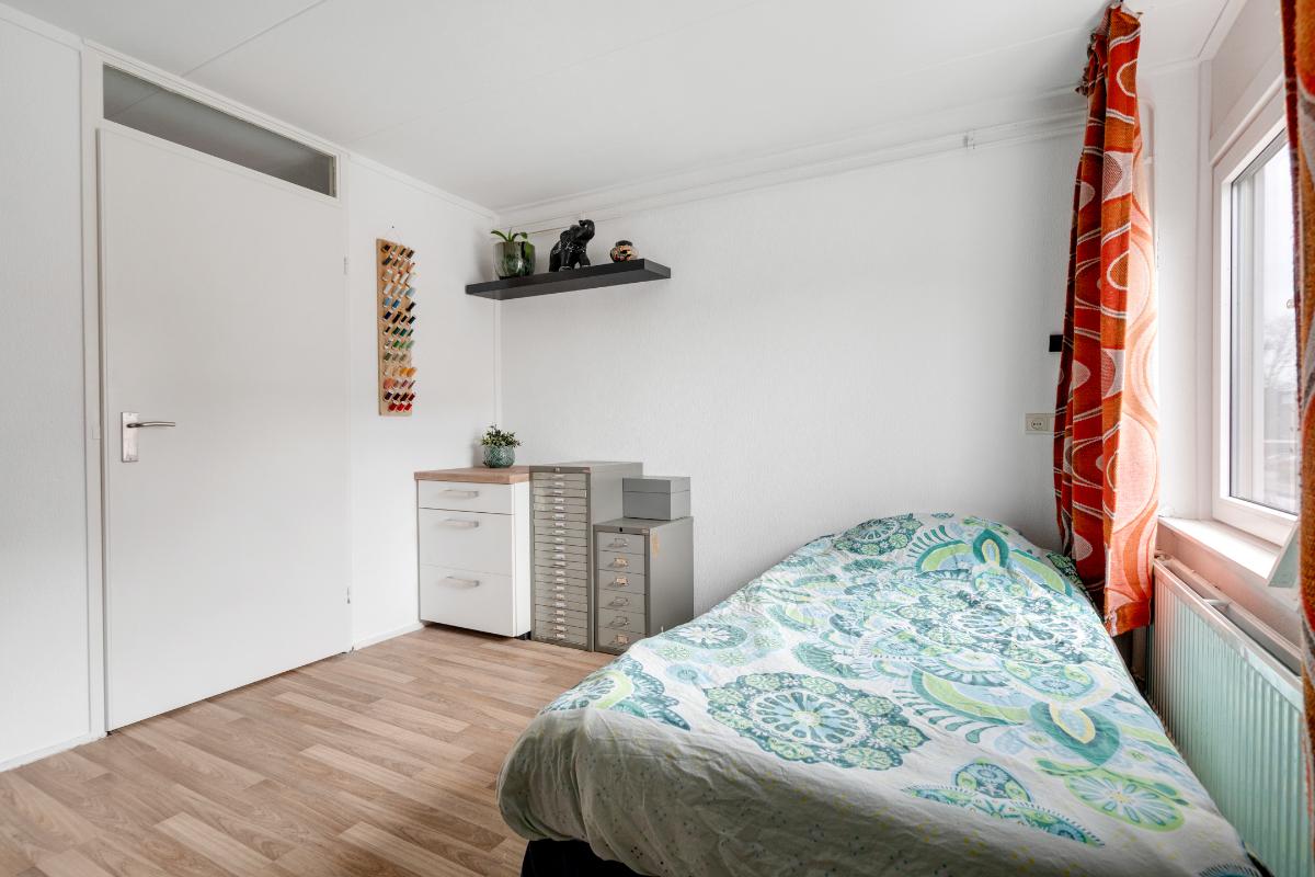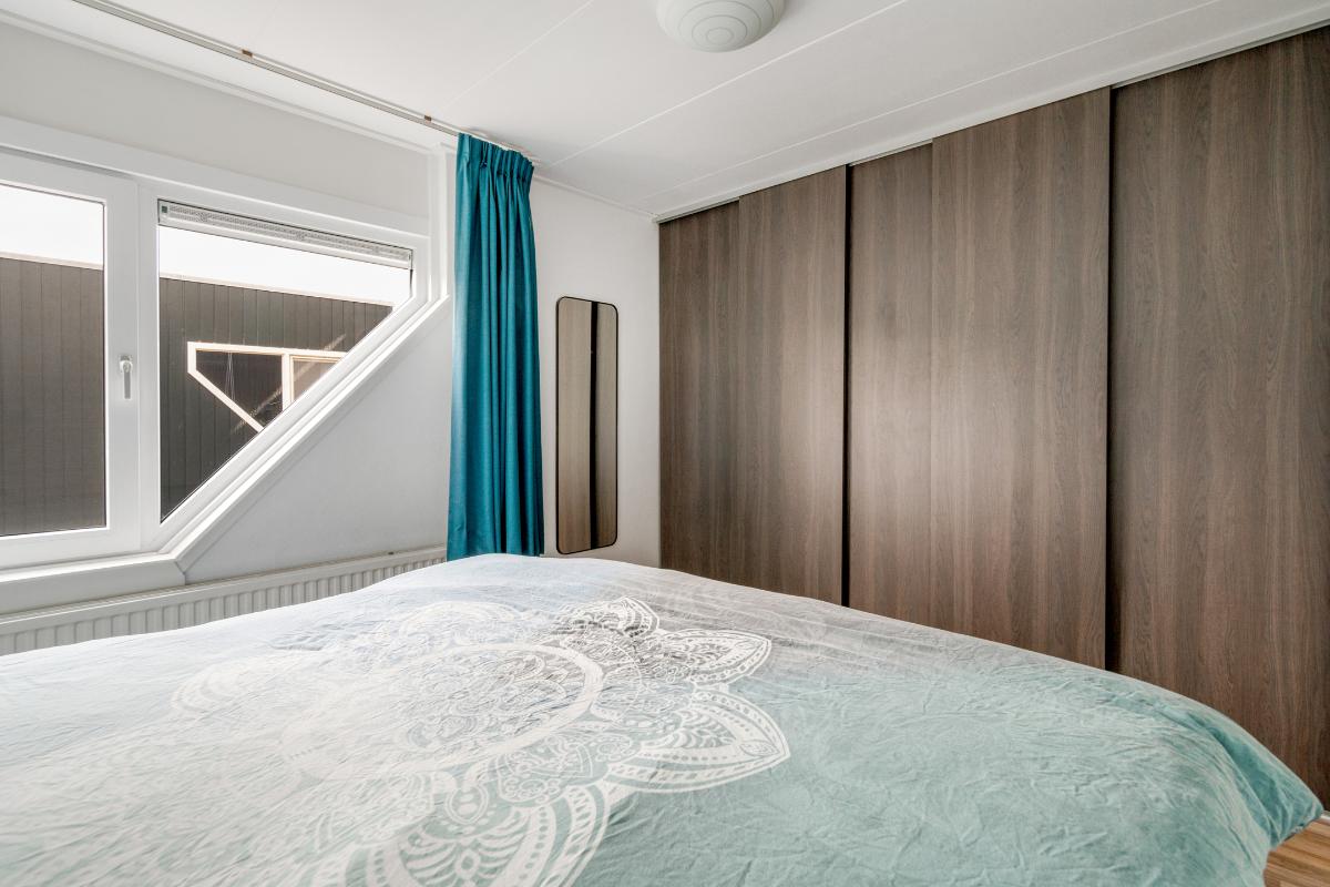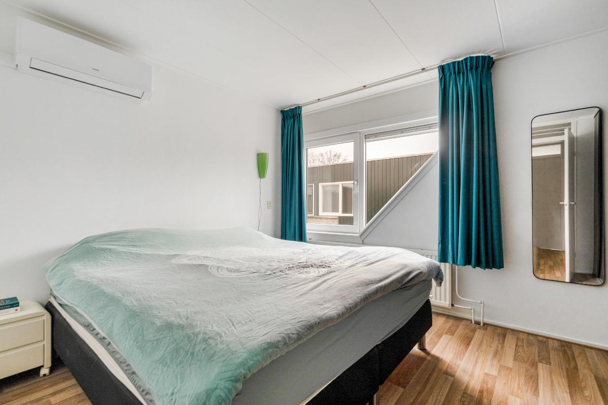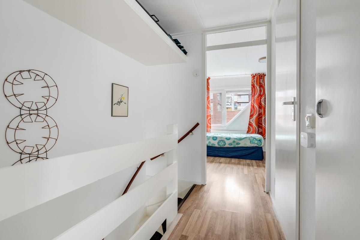 1e verdieping: De trap brengt je op de overloop van de eerste verdieping. Hier vandaan heb je toegang tot twee ruime slaapkamers, de badkamer en een berging. Op de hele verdieping ligt een doorlopende laminaatvloer, wat zorgt voor een rustig geheel. De slaapkamers aan zowel de achter als de voorzijde zijn nagenoeg even groot. Beide kamers hebben dezelfde kenmerkende driehoekige raamvorm, wat zorgt voor een speels lijnenspel en voldoende daglicht. In beide kamers is een royale ingebouwde kastenwand aanwezig, waardoor je flink wat opbergruimte tot je beschikking hebt zonder extra kasten te hoeven plaatsen. De slaapkamer aan de voorzijde is voorzien van een airco-unit die zorgt dat het hier zowel tijdens warme als koude nachten comfortabel blijft. Tussen de slaapkamers in bevindt zich de badkamer. Deze is volledig betegeld en uitgerust met een inloopdouche, wastafelmeubel met spiegel en verlichting en plek voor een wasmachine en droger. Naast de badkamer is een kleine berging met de cv-ketel en waar plek is om eventueel spullen op te bergen.