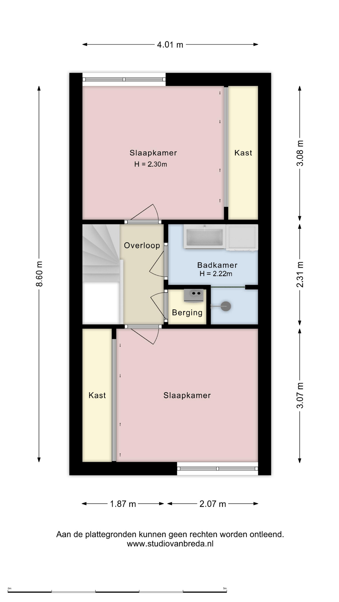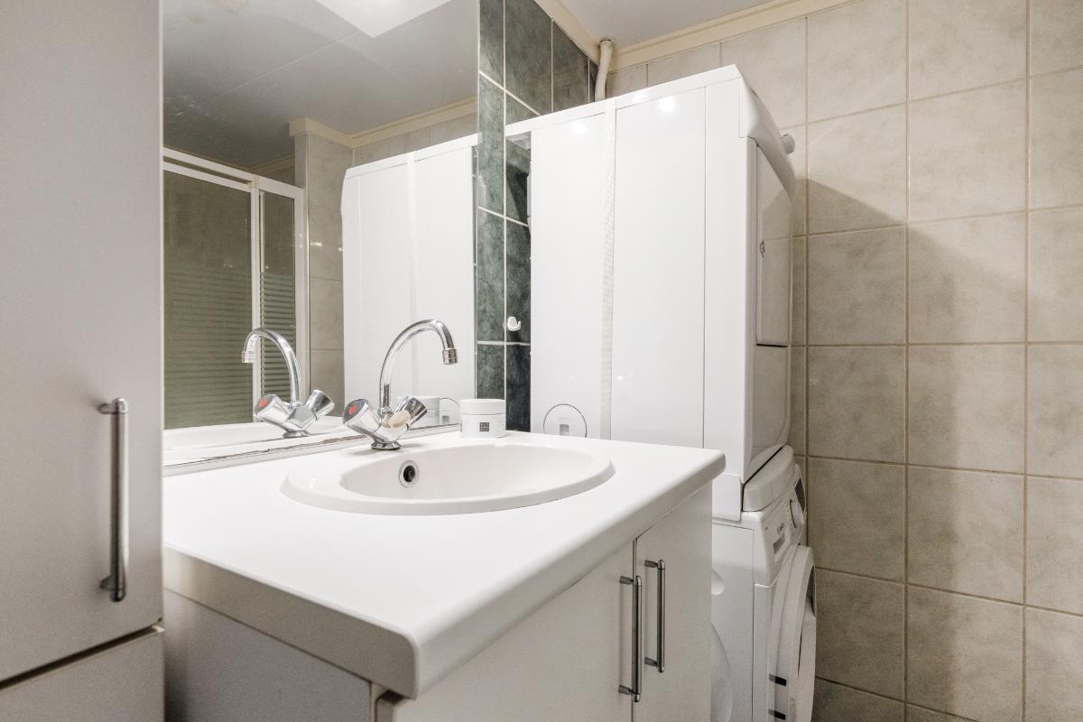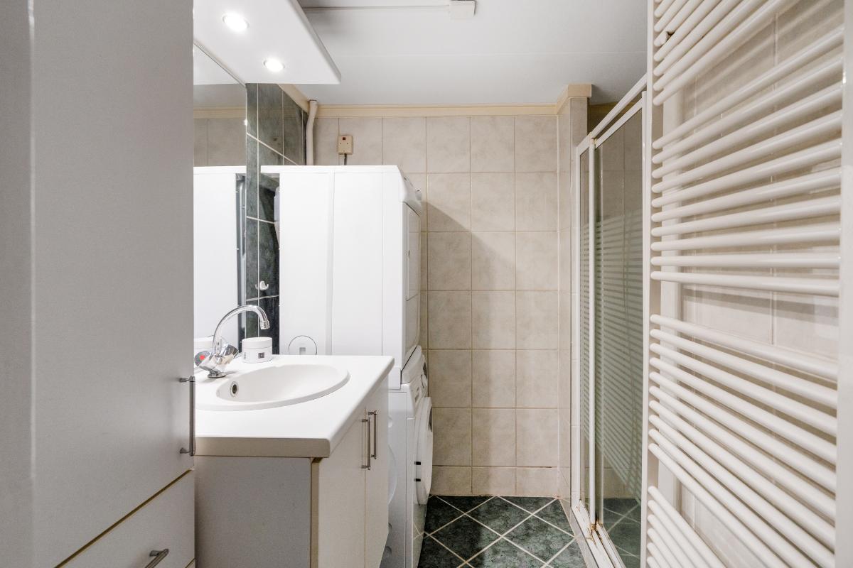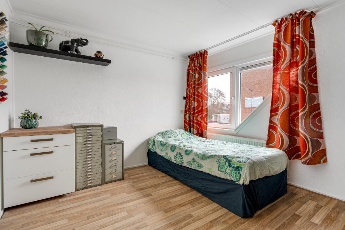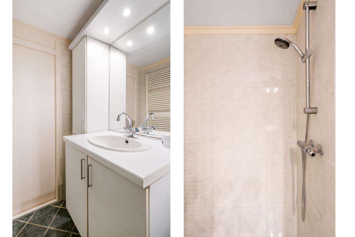 1e verdieping: De trap brengt je op de overloop van de eerste verdieping. Hier vandaan heb je toegang tot twee ruime slaapkamers, de badkamer en een berging. Op de hele verdieping ligt een doorlopende laminaatvloer, wat zorgt voor een rustig geheel. De slaapkamers aan zowel de achter als de voorzijde zijn nagenoeg even groot. Beide kamers hebben dezelfde kenmerkende driehoekige raamvorm, wat zorgt voor een speels lijnenspel en voldoende daglicht. In beide kamers is een royale ingebouwde kastenwand aanwezig, waardoor je flink wat opbergruimte tot je beschikking hebt zonder extra kasten te hoeven plaatsen. De slaapkamer aan de voorzijde is voorzien van een airco-unit die zorgt dat het hier zowel tijdens warme als koude nachten comfortabel blijft. Tussen de slaapkamers in bevindt zich de badkamer. Deze is volledig betegeld en uitgerust met een inloopdouche, wastafelmeubel met spiegel en verlichting en plek voor een wasmachine en droger. Naast de badkamer is een kleine berging met de cv-ketel en waar plek is om eventueel spullen op te bergen.