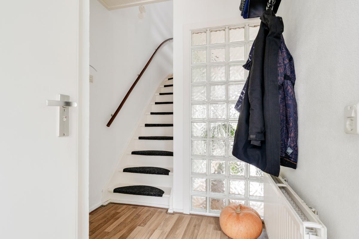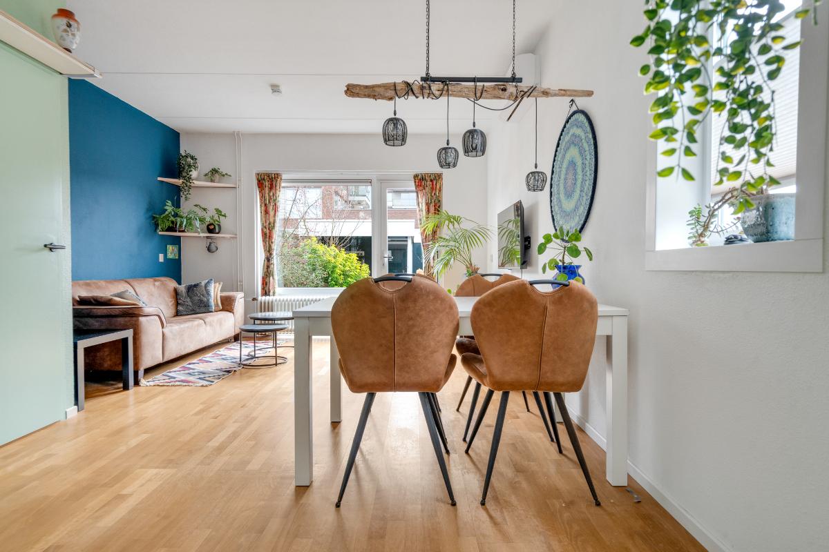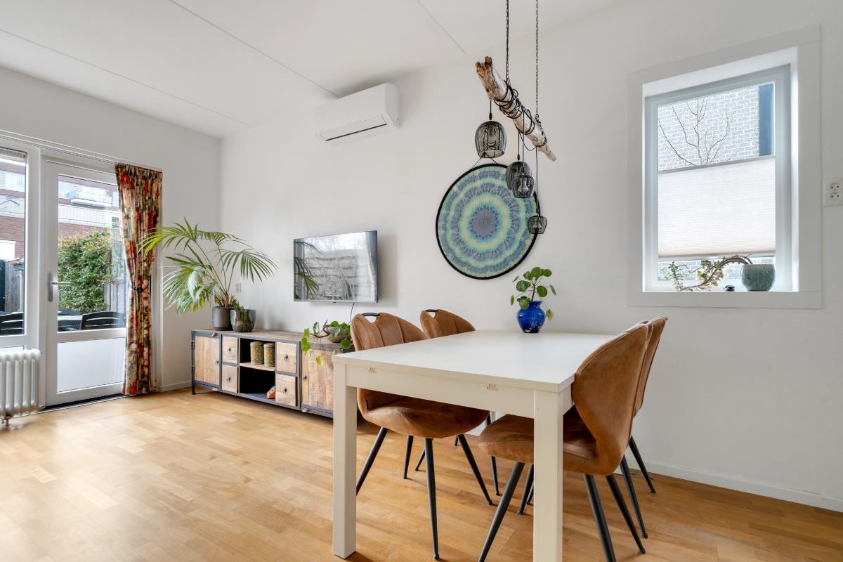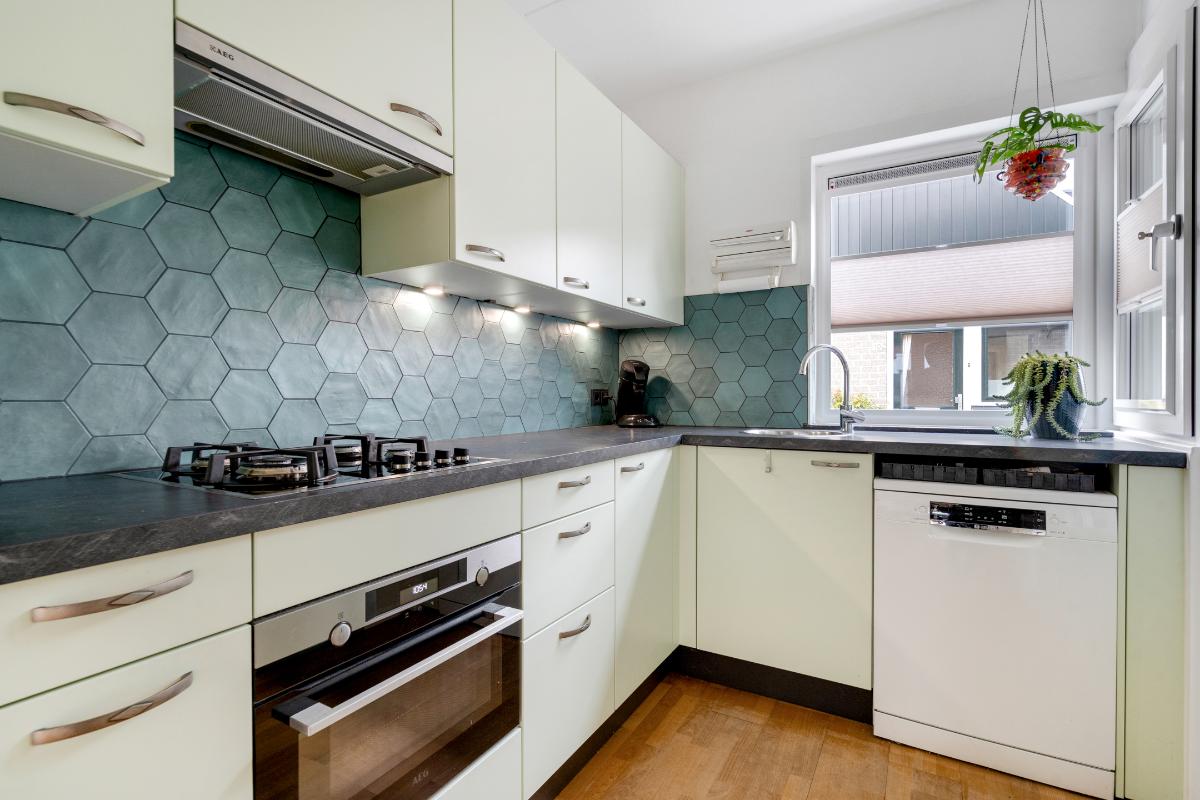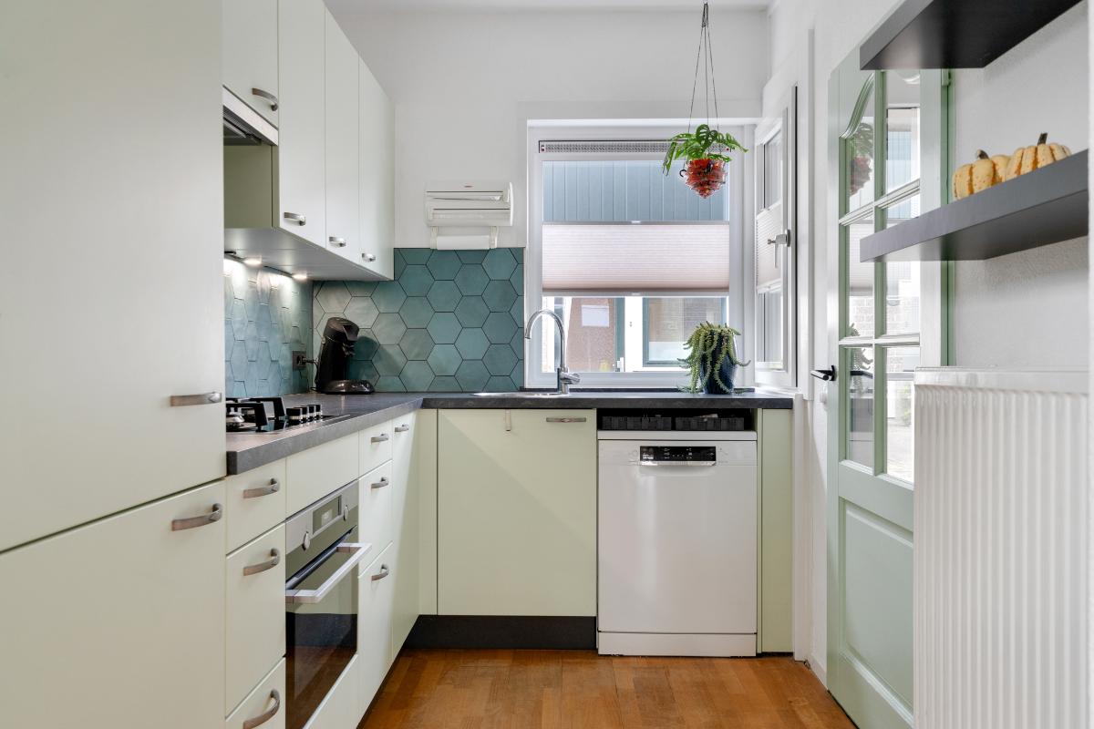Begane grond: Onder de overkapping stap je droog binnen in de entree. Hier bevinden zich het toilet met fontein, de deur naar de woonkamer en de trap naar boven. De entree heeft een fraaie wand met glazen bouwstenen waardoor er extra daglicht binnenkomt. Vanuit de entree loop je door naar de woonkamer. Dit is een gezellige, rechthoekige ruimte met een prettige indeling, waar je makkelijk een comfortabele zitplek en eethoek kwijt kunt. Aan de achterzijde zorgen het raam en de deur naar de tuin voor licht en een fijn contact met buiten. De doorlopende houten vloer geeft het geheel een rustige basis en onder de trap is een praktische kast voor extra bergruimte. Aan de voorzijde ligt de halfopen keuken in L-opstelling. Je hebt hier voldoende werkblad en kastruimte tot je beschikking en is uitgerust met praktische inbouwapparatuur zoals een gaskookplaat, combi-oven, koelkast, vriezer, vaatwasser en afzuigkap. De fronten in een zachte groene tint en de zeshoekige wandtegels in bijpassende kleur geven deze ruimte een frisse, eigentijdse uitstraling. Terwijl je in de keuken bezig bent, kijk je uit over het hofje aan de voorzijde. In de woonkamer hangt bovendien een airco-unit die zowel kan koelen als verwarmen, wat bijdraagt aan het comfort in alle seizoenen.