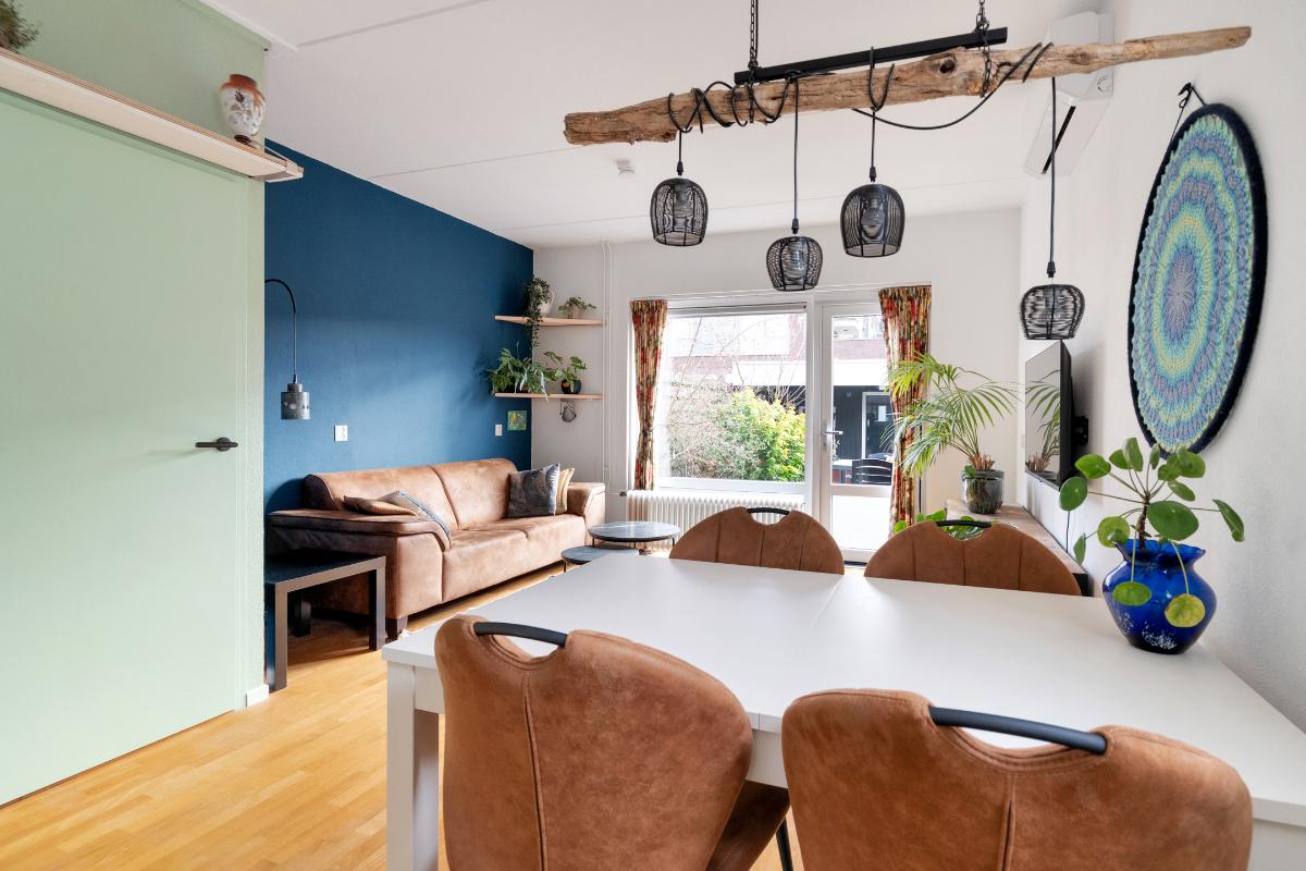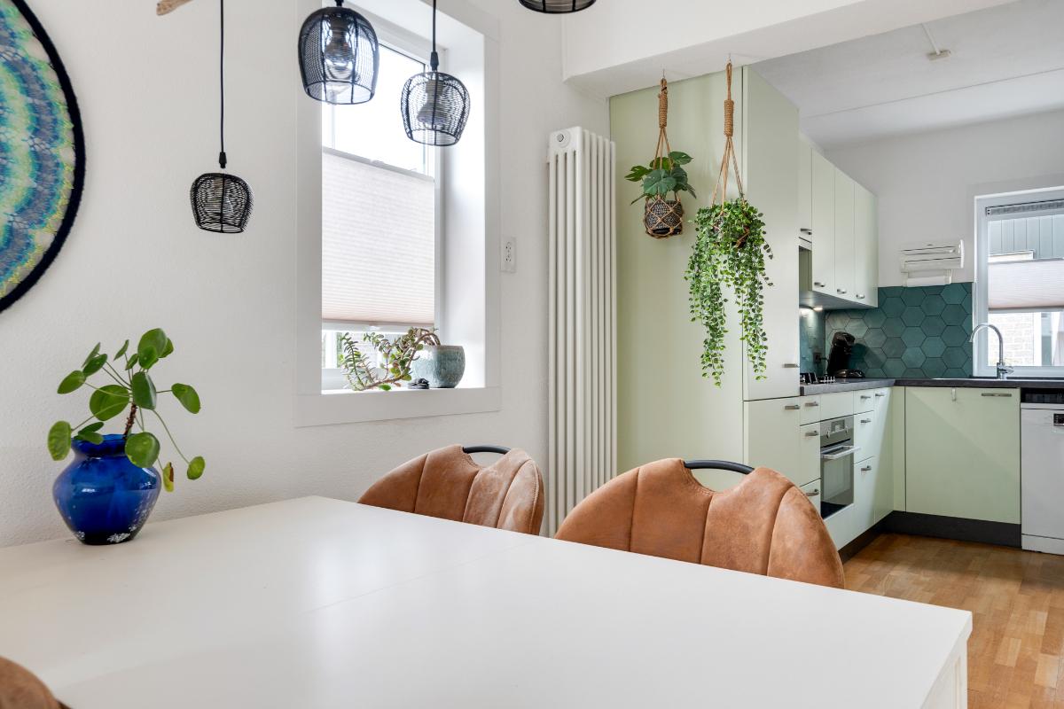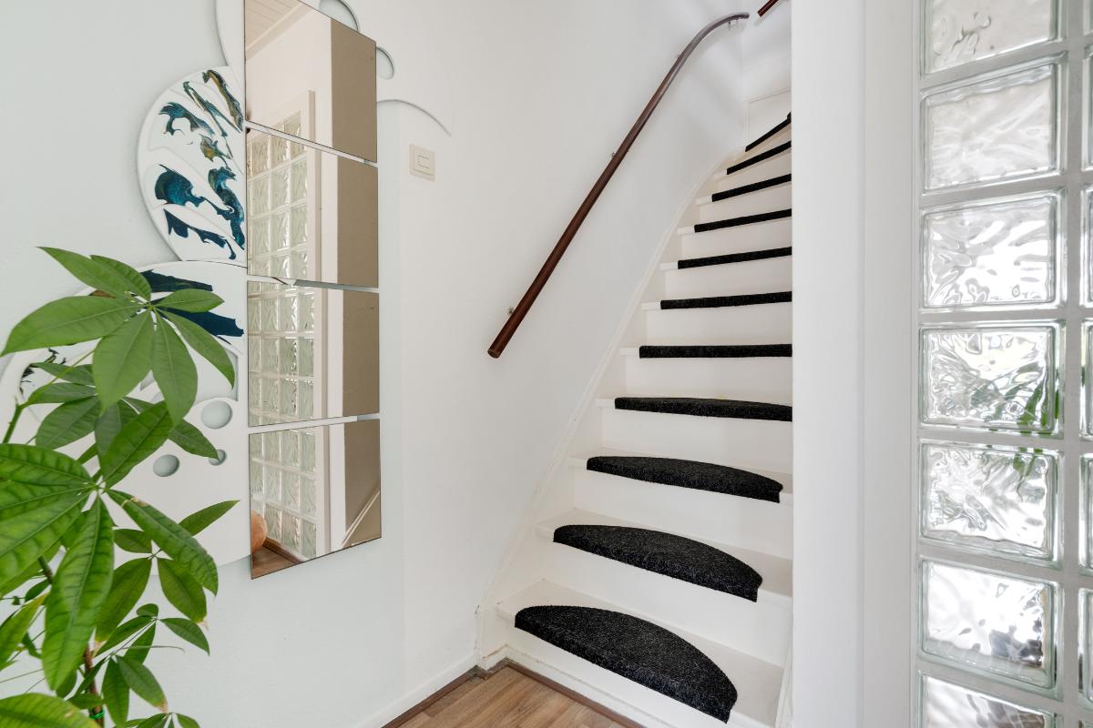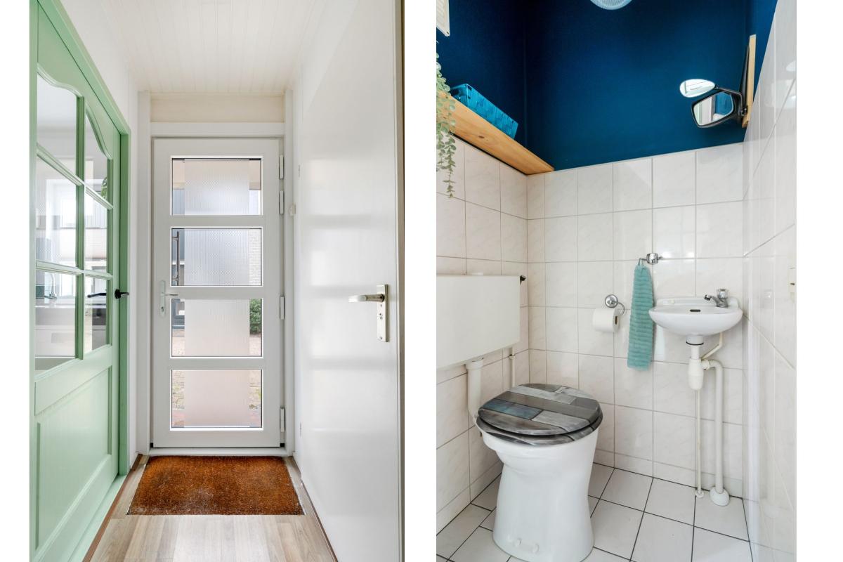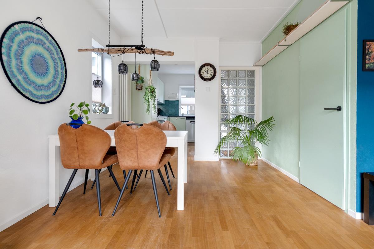 Begane grond: Onder de overkapping stap je droog binnen in de entree. Hier bevinden zich het toilet met fontein, de deur naar de woonkamer en de trap naar boven. De entree heeft een fraaie wand met glazen bouwstenen waardoor er extra daglicht binnenkomt. Vanuit de entree loop je door naar de woonkamer. Dit is een gezellige, rechthoekige ruimte met een prettige indeling, waar je makkelijk een comfortabele zitplek en eethoek kwijt kunt. Aan de achterzijde zorgen het raam en de deur naar de tuin voor licht en een fijn contact met buiten. De doorlopende houten vloer geeft het geheel een rustige basis en onder de trap is een praktische kast voor extra bergruimte. Aan de voorzijde ligt de halfopen keuken in L-opstelling. Je hebt hier voldoende werkblad en kastruimte tot je beschikking en is uitgerust met praktische inbouwapparatuur zoals een gaskookplaat, combi-oven, koelkast, vriezer, vaatwasser en afzuigkap. De fronten in een zachte groene tint en de zeshoekige wandtegels in bijpassende kleur geven deze ruimte een frisse, eigentijdse uitstraling. Terwijl je in de keuken bezig bent, kijk je uit over het hofje aan de voorzijde. In de woonkamer hangt bovendien een airco-unit die zowel kan koelen als verwarmen, wat bijdraagt aan het comfort in alle seizoenen.
