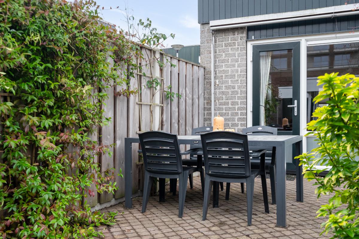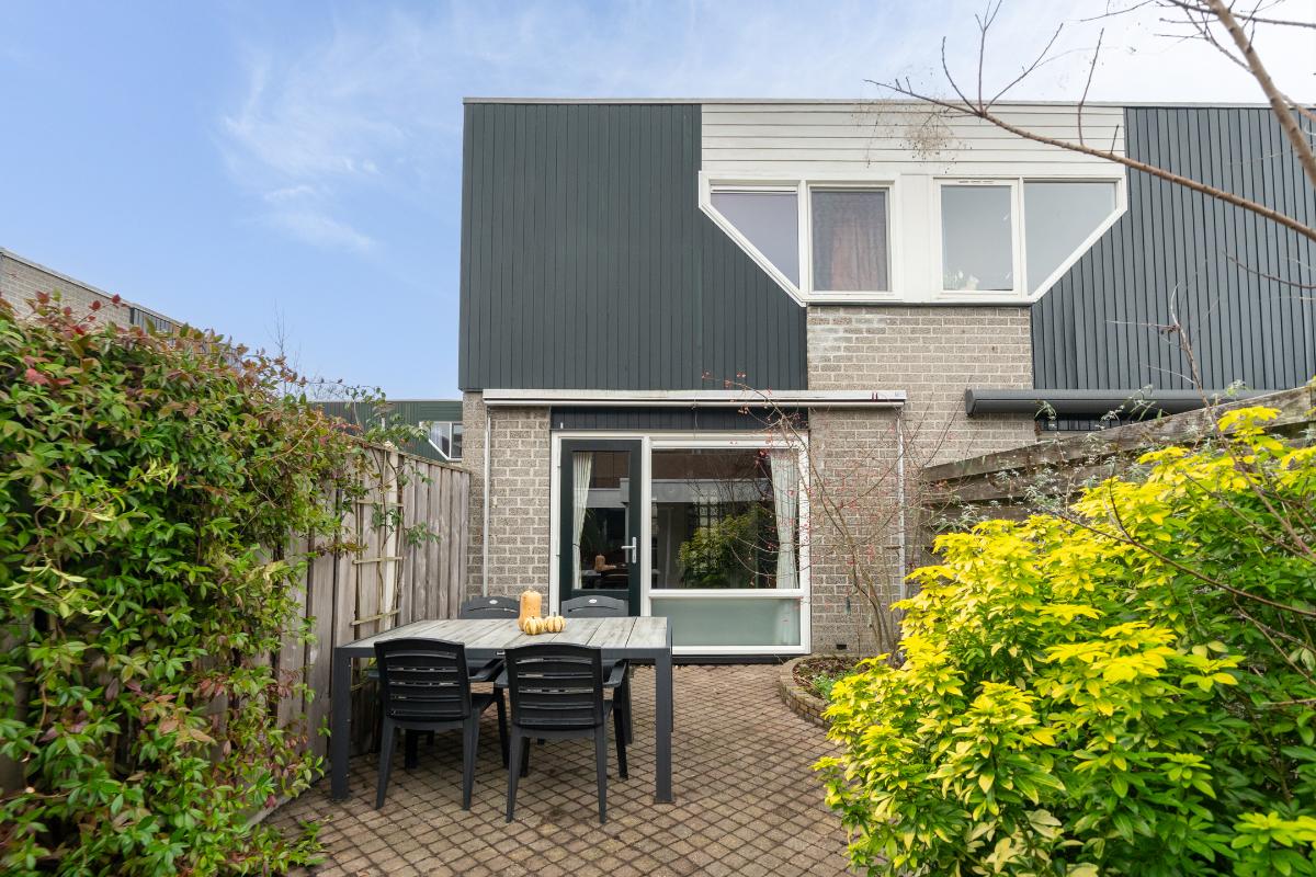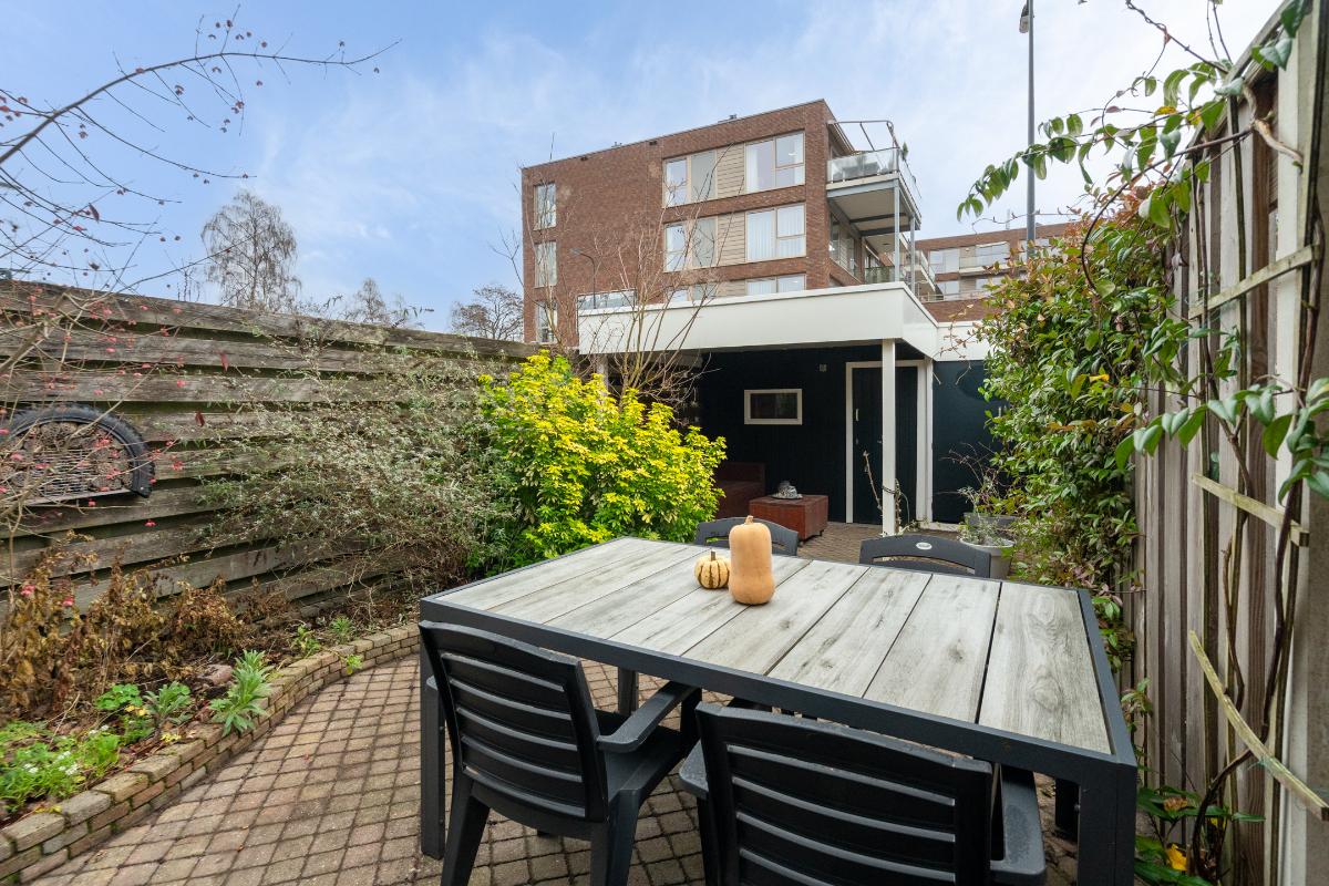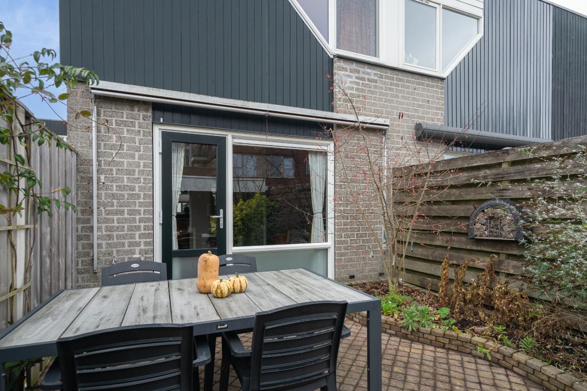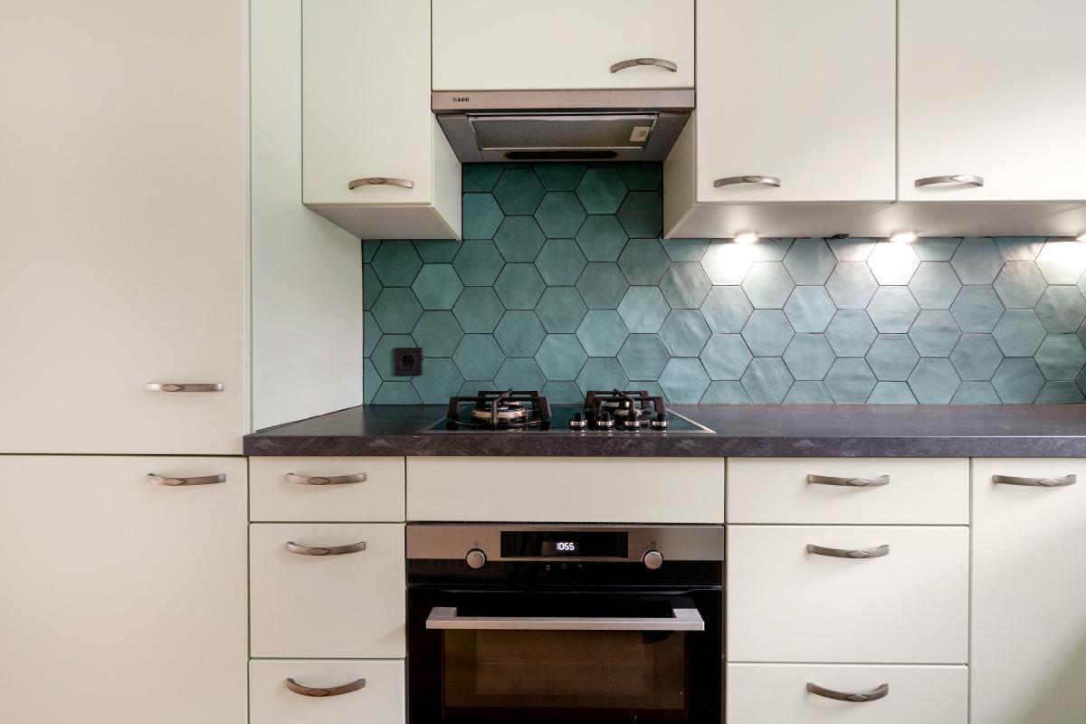 Begane grond: Onder de overkapping stap je droog binnen in de entree. Hier bevinden zich het toilet met fontein, de deur naar de woonkamer en de trap naar boven. De entree heeft een fraaie wand met glazen bouwstenen waardoor er extra daglicht binnenkomt. Vanuit de entree loop je door naar de woonkamer. Dit is een gezellige, rechthoekige ruimte met een prettige indeling, waar je makkelijk een comfortabele zitplek en eethoek kwijt kunt. Aan de achterzijde zorgen het raam en de deur naar de tuin voor licht en een fijn contact met buiten. De doorlopende houten vloer geeft het geheel een rustige basis en onder de trap is een praktische kast voor extra bergruimte. Aan de voorzijde ligt de halfopen keuken in L-opstelling. Je hebt hier voldoende werkblad en kastruimte tot je beschikking en is uitgerust met praktische inbouwapparatuur zoals een gaskookplaat, combi-oven, koelkast, vriezer, vaatwasser en afzuigkap. De fronten in een zachte groene tint en de zeshoekige wandtegels in bijpassende kleur geven deze ruimte een frisse, eigentijdse uitstraling. Terwijl je in de keuken bezig bent, kijk je uit over het hofje aan de voorzijde. In de woonkamer hangt bovendien een airco-unit die zowel kan koelen als verwarmen, wat bijdraagt aan het comfort in alle seizoenen.