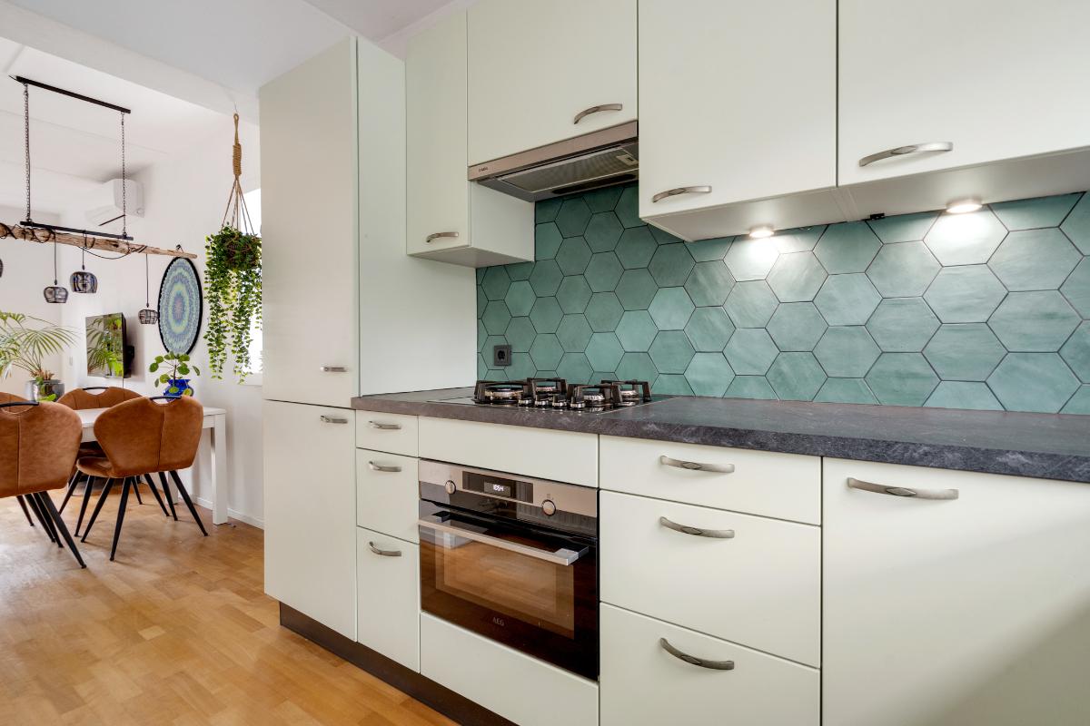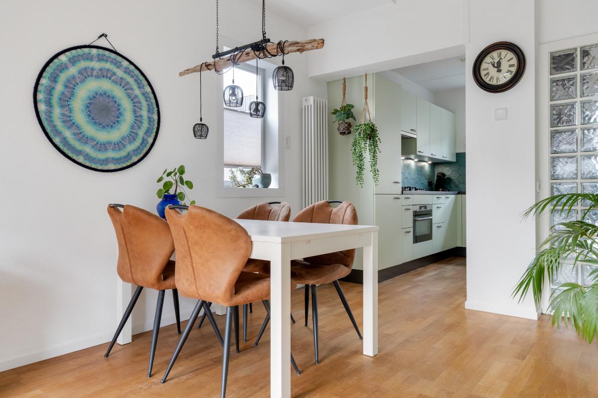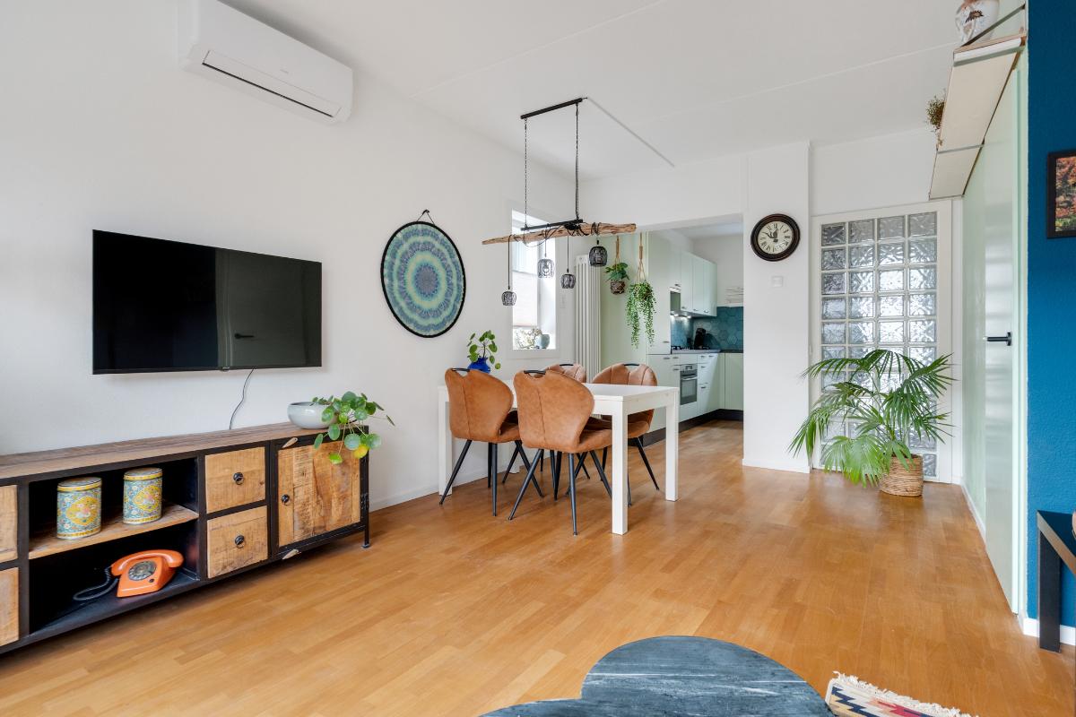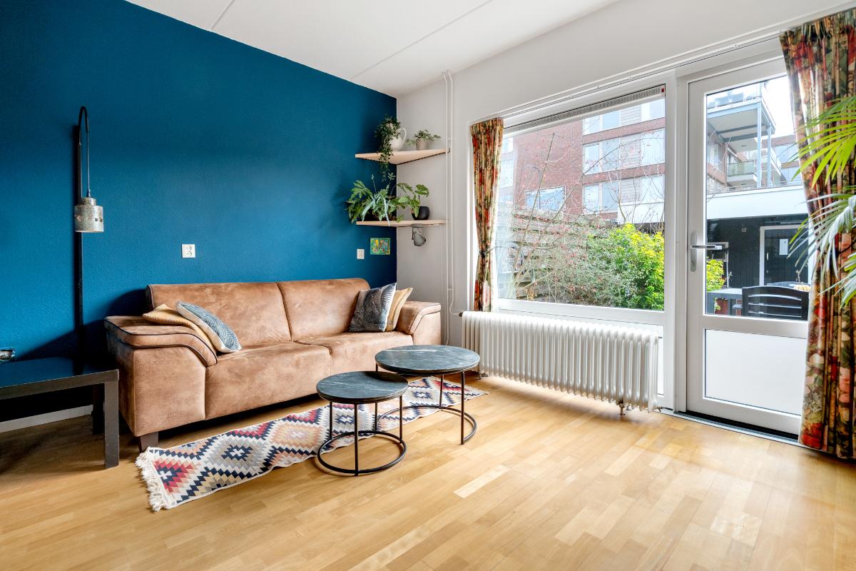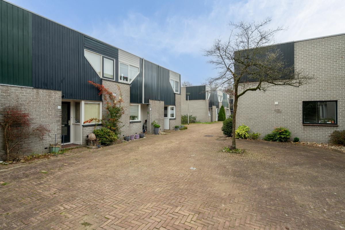Begane grond: Onder de overkapping stap je droog binnen in de entree. Hier bevinden zich het toilet met fontein, de deur naar de woonkamer en de trap naar boven. De entree heeft een fraaie wand met glazen bouwstenen waardoor er extra daglicht binnenkomt. Vanuit de entree loop je door naar de woonkamer. Dit is een gezellige, rechthoekige ruimte met een prettige indeling, waar je makkelijk een comfortabele zitplek en eethoek kwijt kunt. Aan de achterzijde zorgen het raam en de deur naar de tuin voor licht en een fijn contact met buiten. De doorlopende houten vloer geeft het geheel een rustige basis en onder de trap is een praktische kast voor extra bergruimte. Aan de voorzijde ligt de halfopen keuken in L-opstelling. Je hebt hier voldoende werkblad en kastruimte tot je beschikking en is uitgerust met praktische inbouwapparatuur zoals een gaskookplaat, combi-oven, koelkast, vriezer, vaatwasser en afzuigkap. De fronten in een zachte groene tint en de zeshoekige wandtegels in bijpassende kleur geven deze ruimte een frisse, eigentijdse uitstraling. Terwijl je in de keuken bezig bent, kijk je uit over het hofje aan de voorzijde. In de woonkamer hangt bovendien een airco-unit die zowel kan koelen als verwarmen, wat bijdraagt aan het comfort in alle seizoenen.