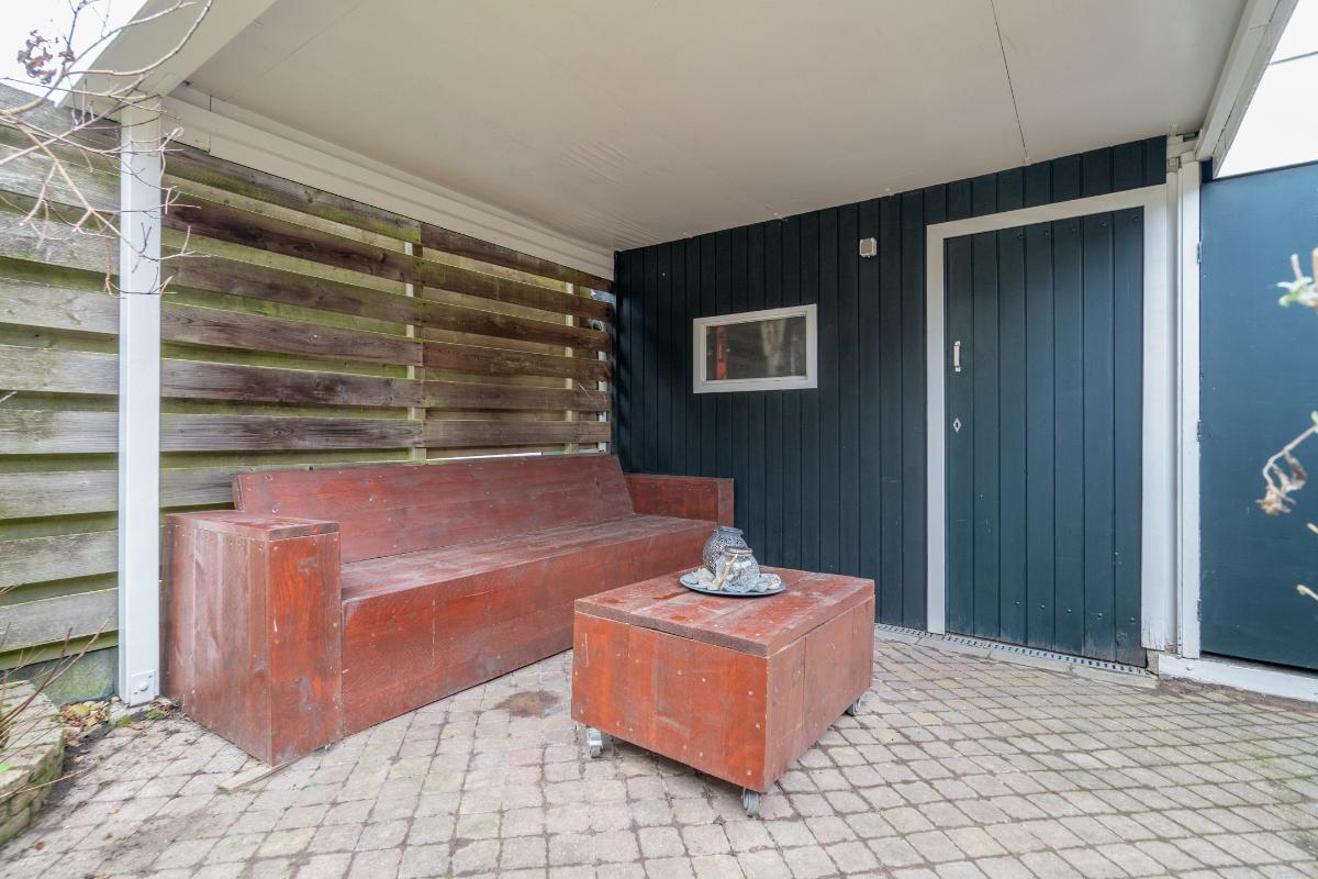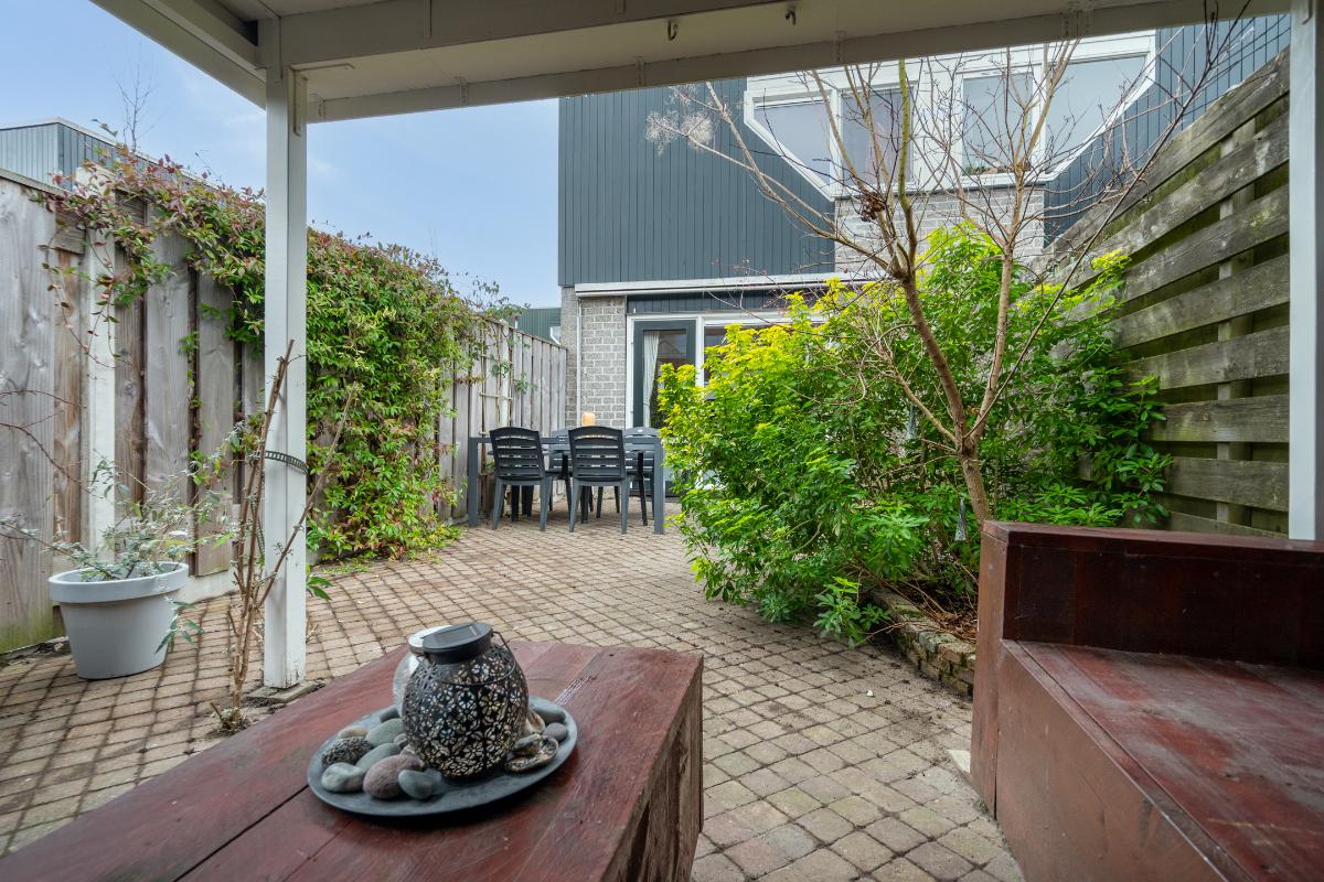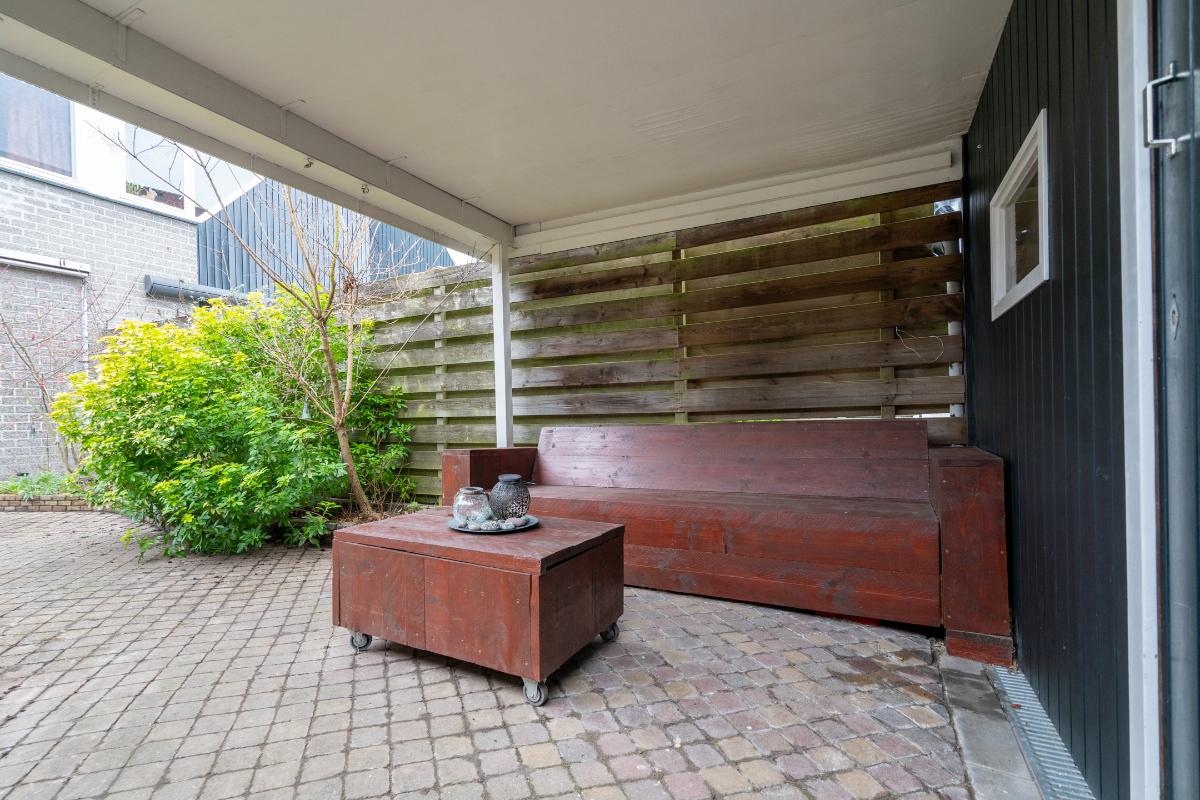 Tuin: Door de tuindeur stap je de knusse achtertuin in. De tuin is grotendeels voorzien van sierbestrating, waardoor je weinig onderhoud hebt en gemakkelijk verschillende zitplaatsen kunt creëren. Langs de randen zorgt de groene beplanting voor kleur en de houten schutting voor een beschut gevoel. Achterin staat een ruime schuur met daarvoor een brede overkapping, een ideale plek om beschut te zitten of de fietsen droog neer te zetten. Dankzij de deur aan de achterzijde van de schuur is de schuur bovendien zeer geschikt voor het stallen van fietsen, motor of scooter en natuurlijk voor extra opslagruimte.