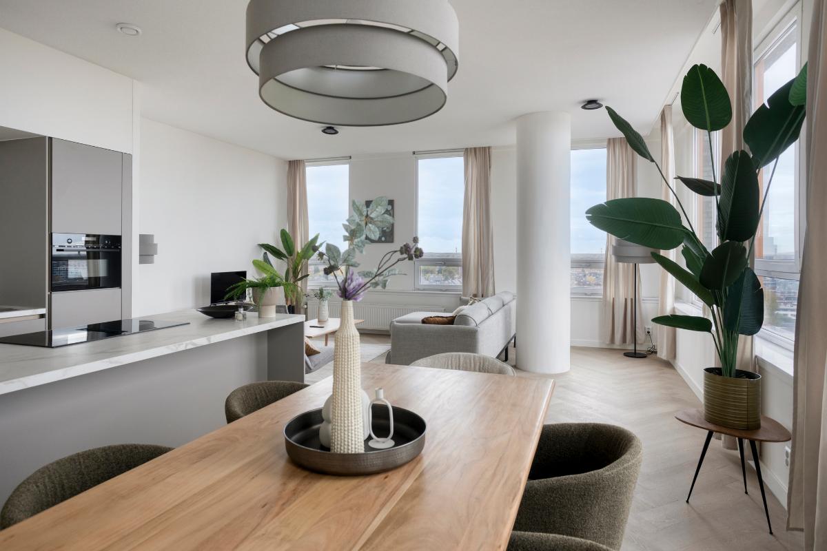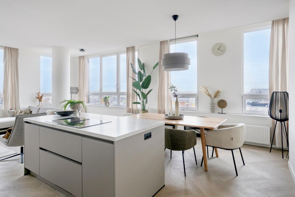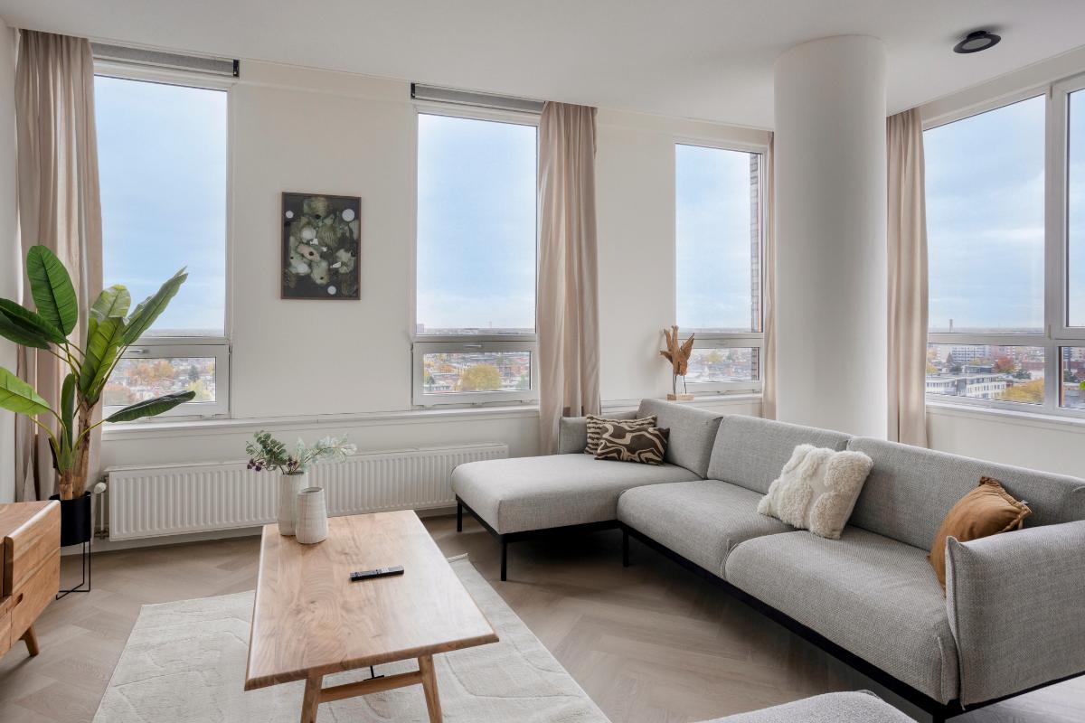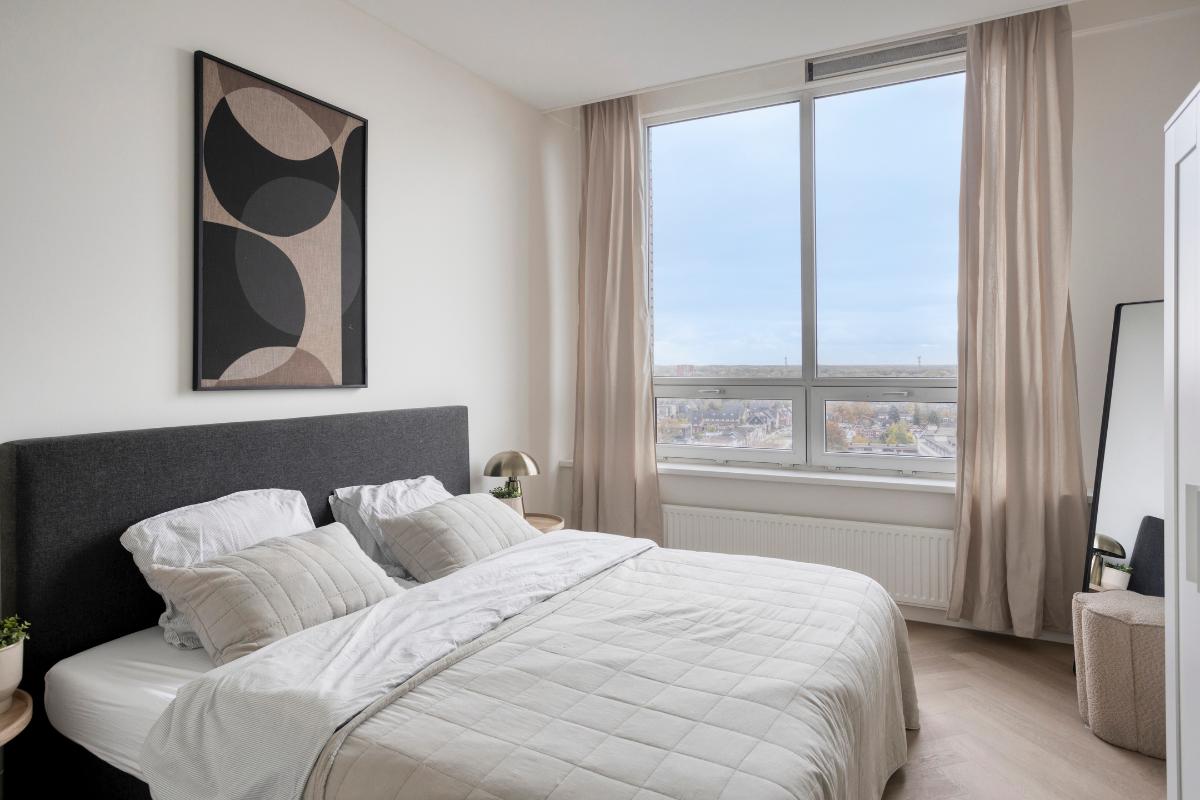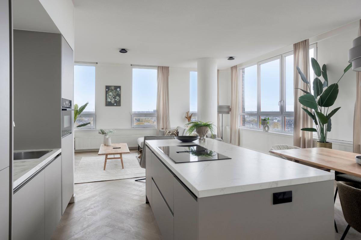 Indeling van het appartement: Op de 10e verdieping bevindt zich dit ruime hoekappartement, dat in 2025 volledig is gerenoveerd en gemoderniseerd. Bij binnenkomst via de entree kom je in een ruime hal met toegang tot een handige berging, het separate toilet, de twee slaapkamers, de badkamer en de woonkamer. De royale woonkamer met hoge plafonds (2,93 meter) is een echte blikvanger. Dankzij de vele grote ramen valt het daglicht rijkelijk naar binnen en geniet je van een vrij, licht en ruim uitzicht over de stad. De moderne open keuken vormt het hart van de woning. Deze is in 2025 geheel vernieuwd en uitgevoerd met een stijlvol kookeiland voorzien van een inductiekookplaat en geïntegreerde afzuiging. De strakke kasten, greeploze fronten en het lichte werkblad geven de keuken een tijdloze, luxe uitstraling. Dankzij de slimme indeling is er veel werk- en opbergruimte, terwijl de open opstelling zorgt voor een natuurlijke verbinding met de eet- en zithoek. De badkamer is eveneens vernieuwd en uitgevoerd met een dubbele wastafel, een inloopdouche, toilet en modern tegelwerk. Het tweede toilet is separaat en in dezelfde stijl afgewerkt. Het appartement beschikt over twee slaapkamers, beide met grote ramen en veel lichtinval. Tot slot is er een eigen berging in de onderbouw, ideaal voor het stallen van fietsen of het opbergen van spullen.