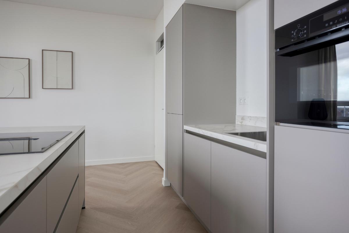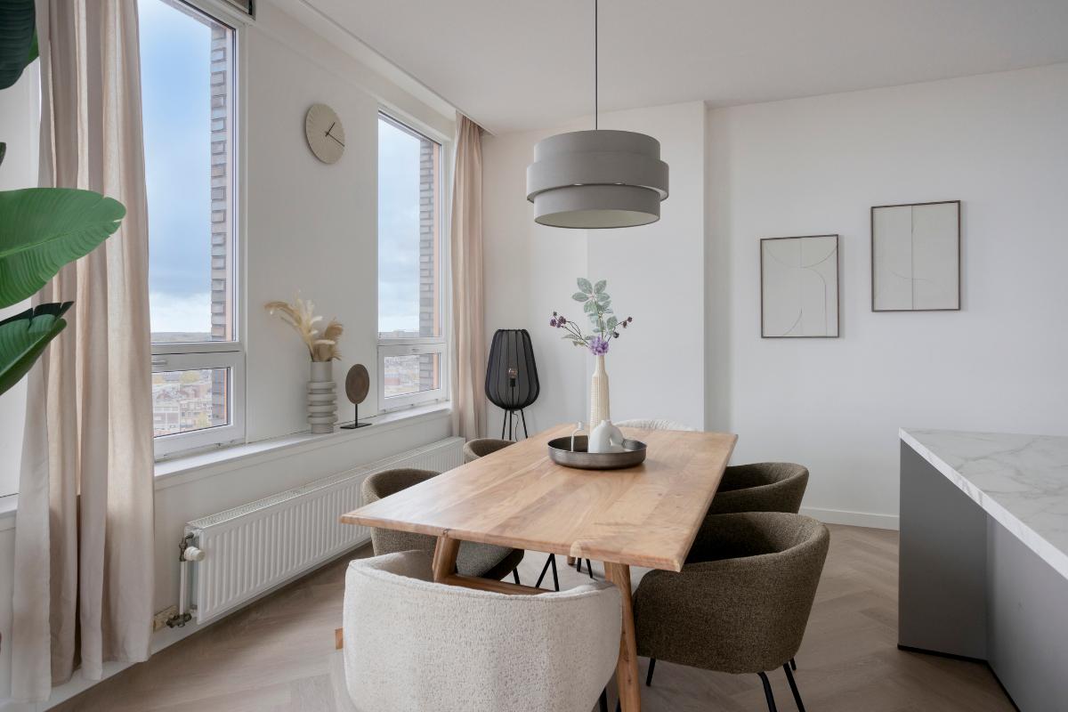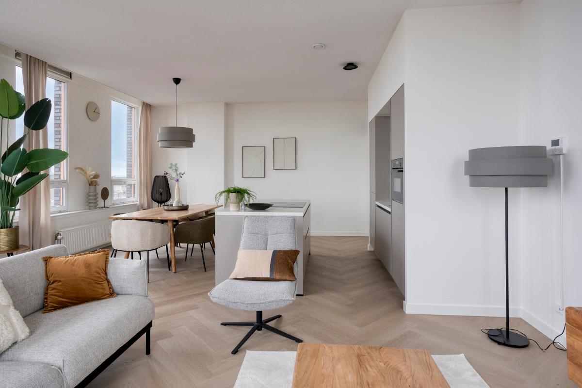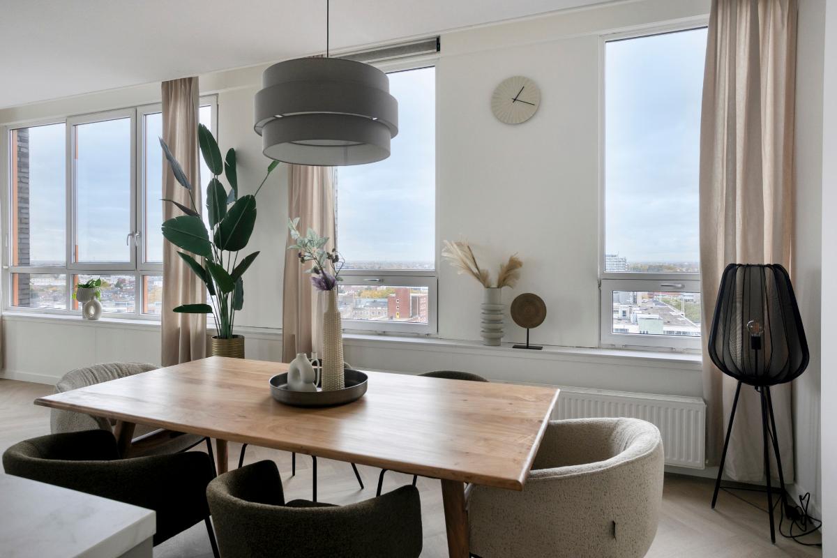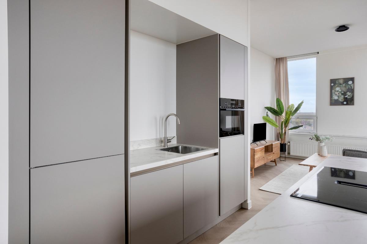 Indeling van het appartement: Op de 10e verdieping bevindt zich dit ruime hoekappartement, dat in 2025 volledig is gerenoveerd en gemoderniseerd. Bij binnenkomst via de entree kom je in een ruime hal met toegang tot een handige berging, het separate toilet, de twee slaapkamers, de badkamer en de woonkamer. De royale woonkamer met hoge plafonds (2,93 meter) is een echte blikvanger. Dankzij de vele grote ramen valt het daglicht rijkelijk naar binnen en geniet je van een vrij, licht en ruim uitzicht over de stad. De moderne open keuken vormt het hart van de woning. Deze is in 2025 geheel vernieuwd en uitgevoerd met een stijlvol kookeiland voorzien van een inductiekookplaat en geïntegreerde afzuiging. De strakke kasten, greeploze fronten en het lichte werkblad geven de keuken een tijdloze, luxe uitstraling. Dankzij de slimme indeling is er veel werk- en opbergruimte, terwijl de open opstelling zorgt voor een natuurlijke verbinding met de eet- en zithoek. De badkamer is eveneens vernieuwd en uitgevoerd met een dubbele wastafel, een inloopdouche, toilet en modern tegelwerk. Het tweede toilet is separaat en in dezelfde stijl afgewerkt. Het appartement beschikt over twee slaapkamers, beide met grote ramen en veel lichtinval. Tot slot is er een eigen berging in de onderbouw, ideaal voor het stallen van fietsen of het opbergen van spullen.