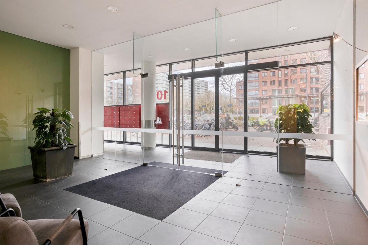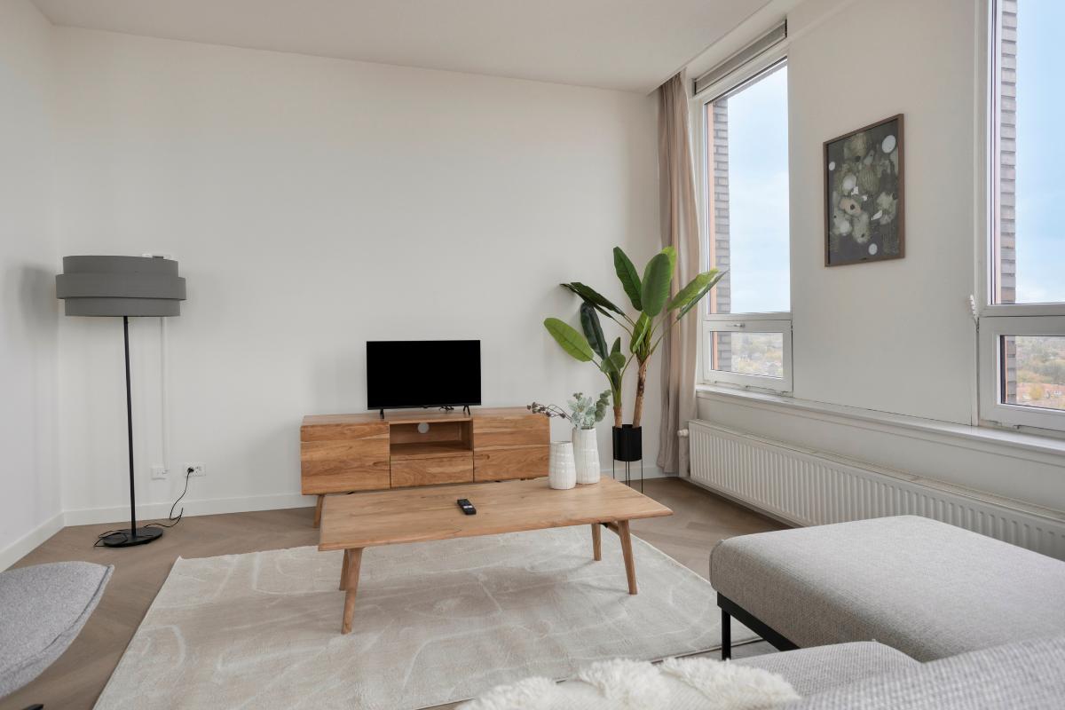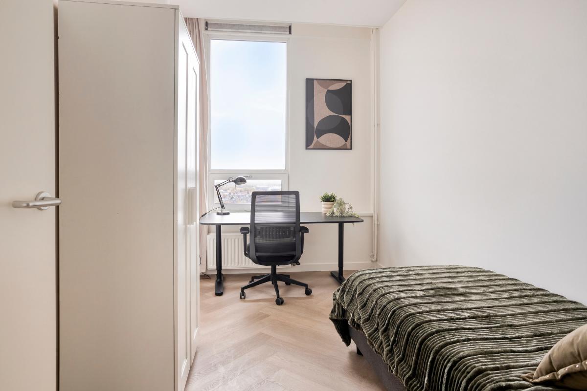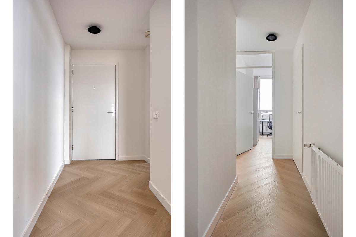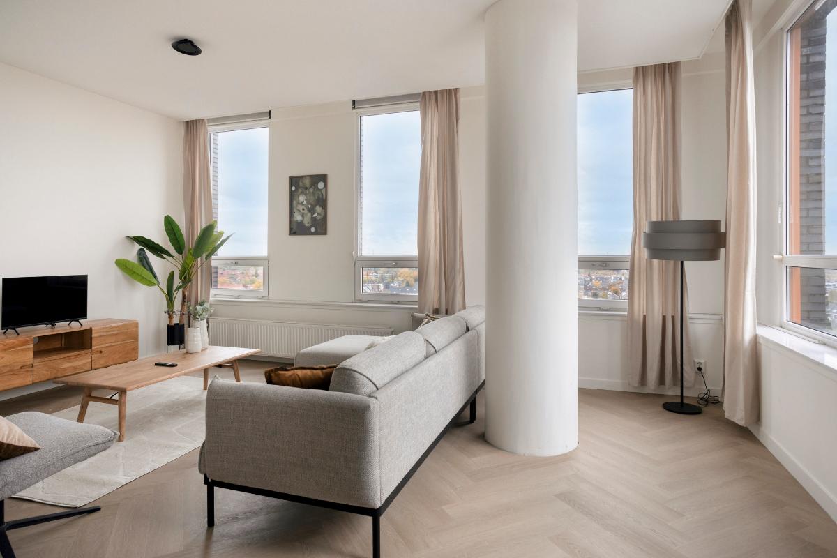 Indeling van het appartement: Op de 10e verdieping bevindt zich dit ruime hoekappartement, dat in 2025 volledig is gerenoveerd en gemoderniseerd. Bij binnenkomst via de entree kom je in een ruime hal met toegang tot een handige berging, het separate toilet, de twee slaapkamers, de badkamer en de woonkamer. De royale woonkamer met hoge plafonds (2,93 meter) is een echte blikvanger. Dankzij de vele grote ramen valt het daglicht rijkelijk naar binnen en geniet je van een vrij, licht en ruim uitzicht over de stad. De moderne open keuken vormt het hart van de woning. Deze is in 2025 geheel vernieuwd en uitgevoerd met een stijlvol kookeiland voorzien van een inductiekookplaat en geïntegreerde afzuiging. De strakke kasten, greeploze fronten en het lichte werkblad geven de keuken een tijdloze, luxe uitstraling. Dankzij de slimme indeling is er veel werk- en opbergruimte, terwijl de open opstelling zorgt voor een natuurlijke verbinding met de eet- en zithoek. De badkamer is eveneens vernieuwd en uitgevoerd met een dubbele wastafel, een inloopdouche, toilet en modern tegelwerk. Het tweede toilet is separaat en in dezelfde stijl afgewerkt. Het appartement beschikt over twee slaapkamers, beide met grote ramen en veel lichtinval. Tot slot is er een eigen berging in de onderbouw, ideaal voor het stallen van fietsen of het opbergen van spullen.